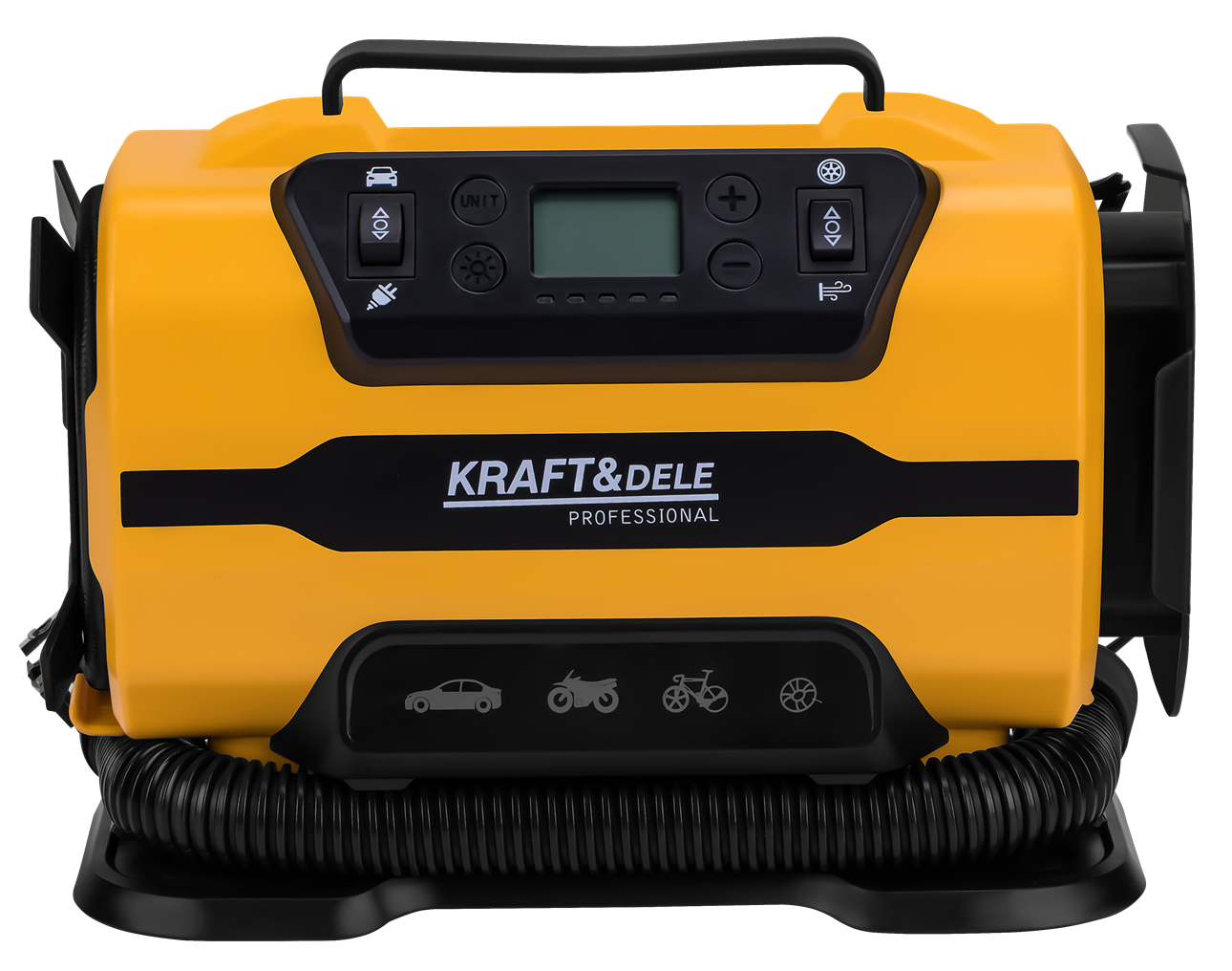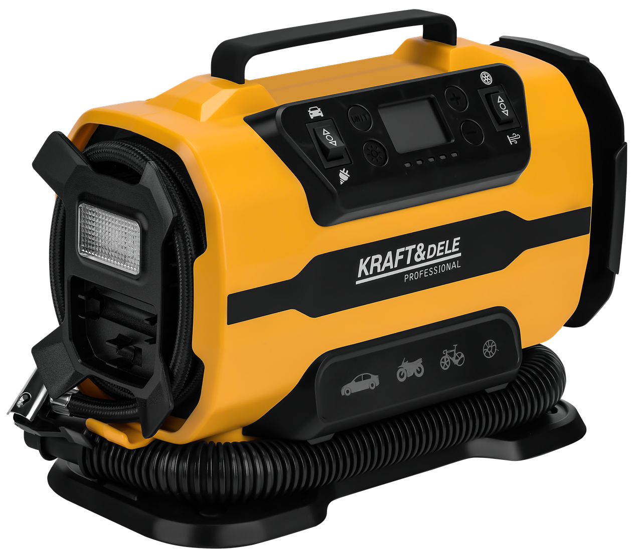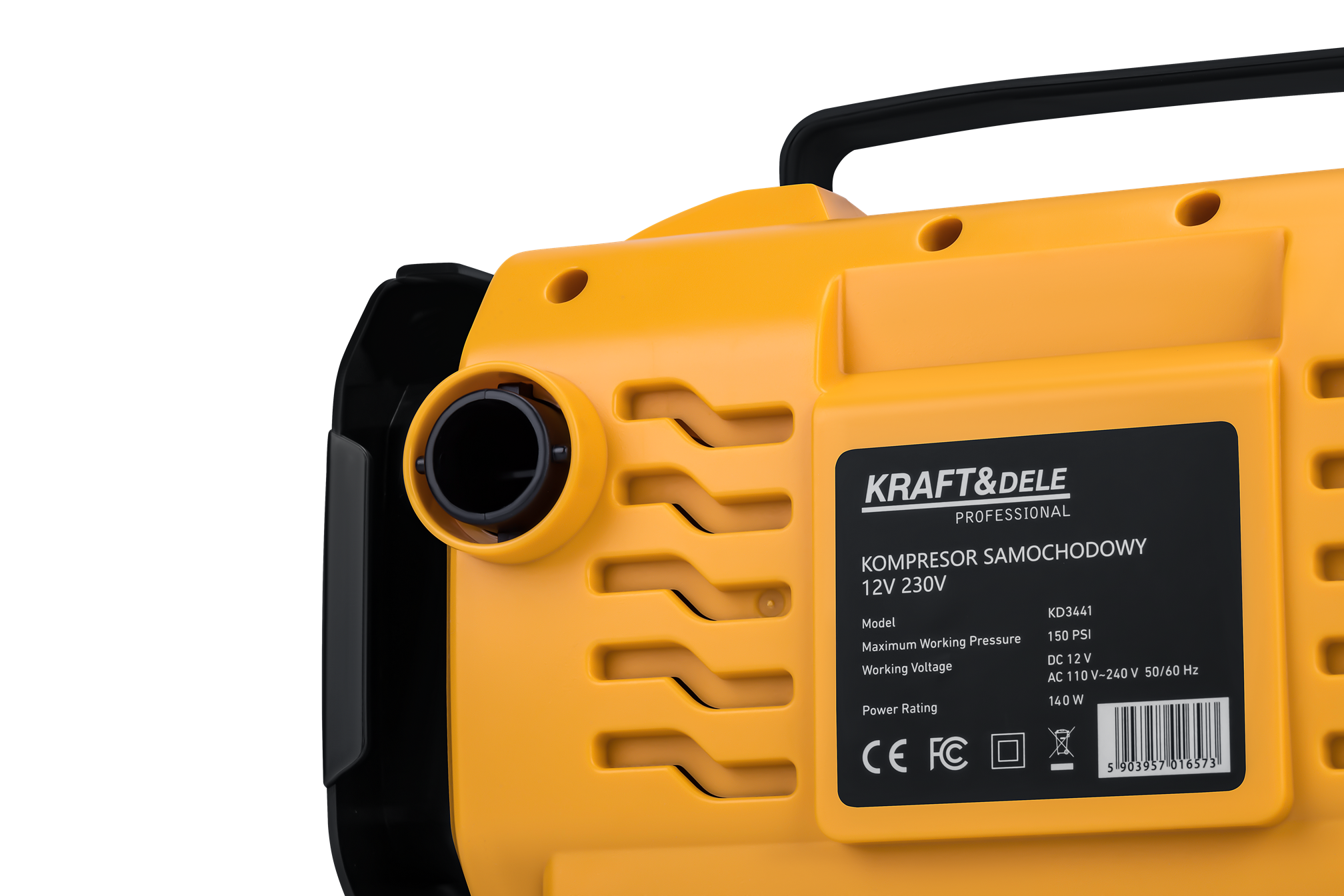 KD3441 to przenośny kompresor tłokowy z podwójnym zasilaniem: 12V DC z gniazda zapalniczki samochodowej oraz 230V AC z sieci domowej. Urządzenie umożliwia pompowanie opon, materacy, piłek i innych przedmiotów nadmuchiwanych, a wbudowana latarka LED rozszerza możliwości pracy przy ograniczonej widoczności.