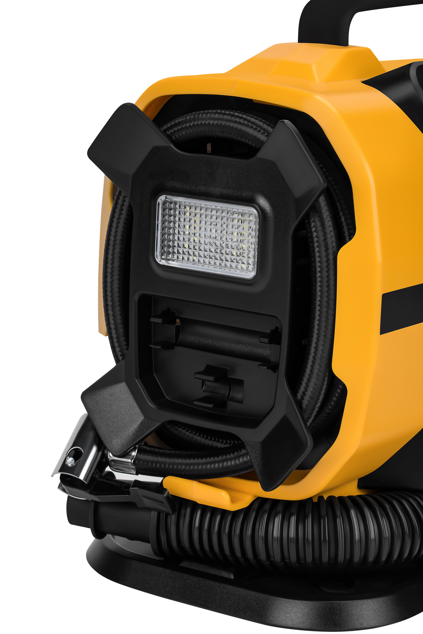 Zintegrowana latarka LED umożliwia pracę przy słabym oświetleniu — np. przy nocnej awarii na poboczu drogi lub w słabo oświetlonym garażu. Eliminuje konieczność trzymania dodatkowego źródła światła podczas obsługi zaworu.