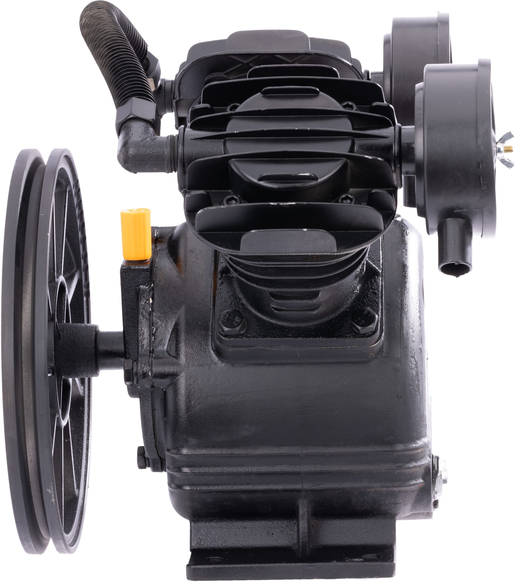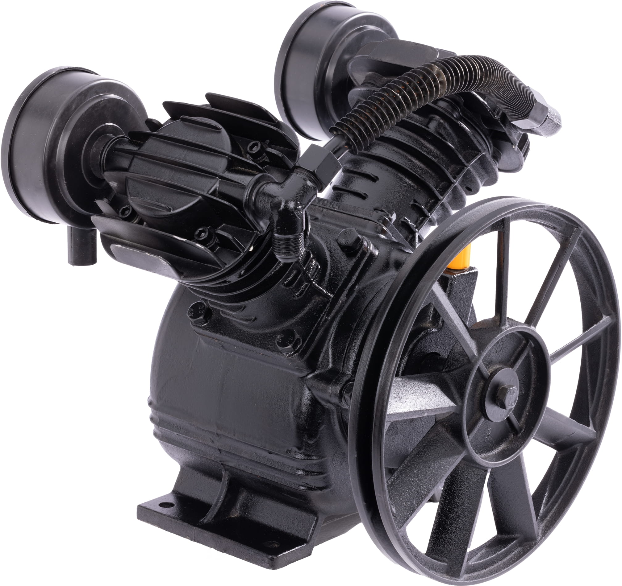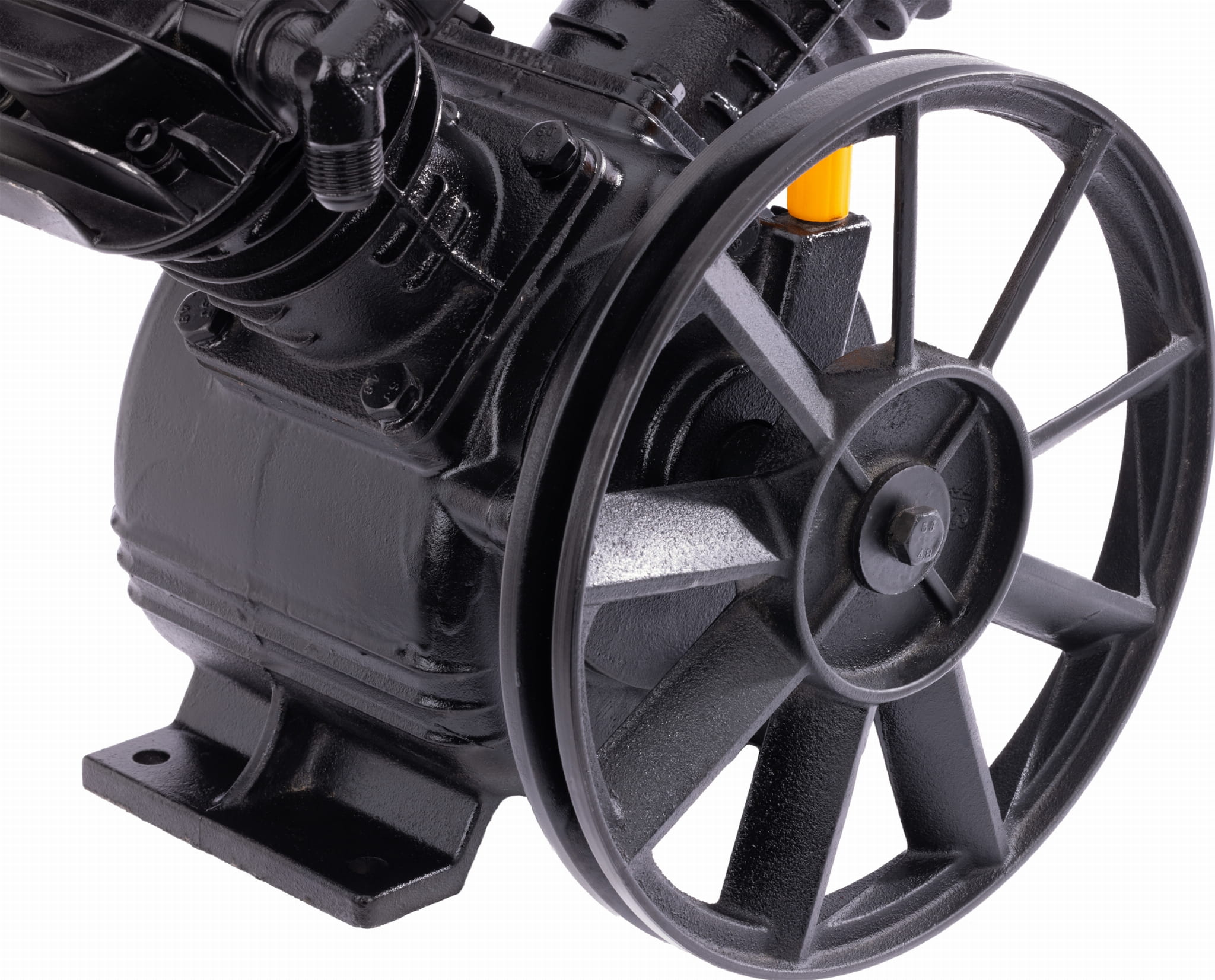 Koło pasowe pełniące funkcję wentylatora oraz boczna chłodnica powietrza współpracują ze sobą, odprowadzając ciepło z głowicy i sprężonego powietrza. Skuteczne chłodzenie stabilizuje parametry pracy i ogranicza ryzyko przegrzania przy dłuższych sesjach roboczych.