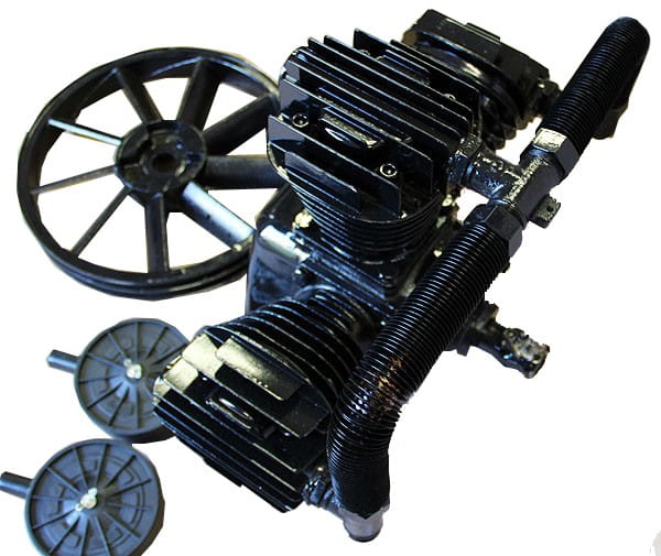 Koło pasowe pełni podwójną funkcję: przenosi napęd z silnika na wał pompy oraz — dzięki żebrowaniu — wspomagają cyrkulację powietrza wokół głowicy. Rozwiązanie zmniejsza ryzyko przegrzania podczas długich cykli pracy.