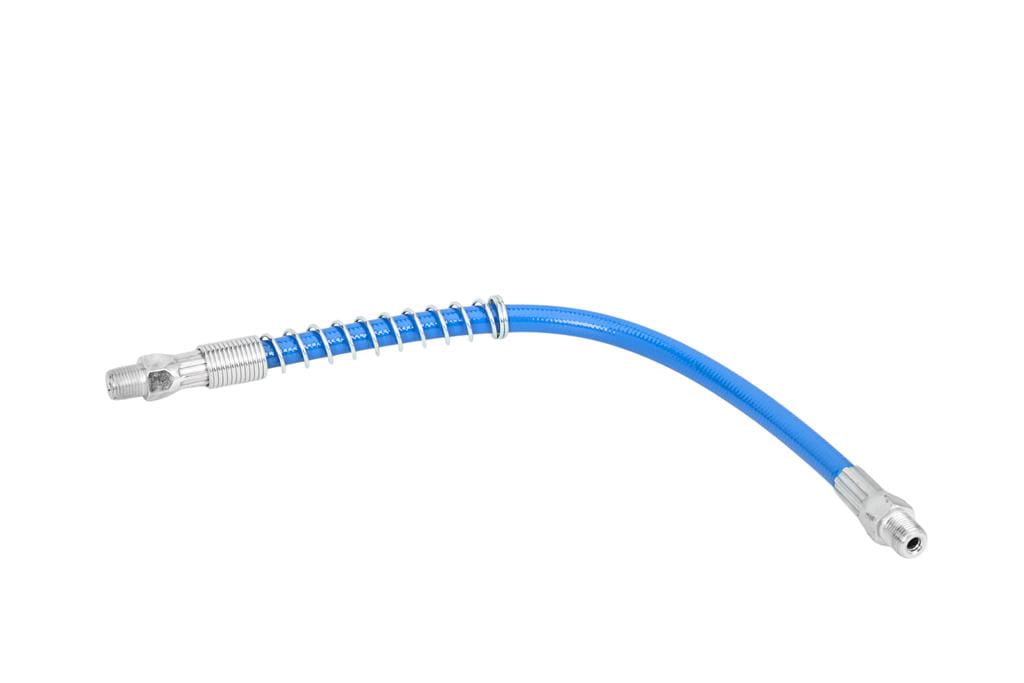 Wężyk o długości 30 cm umożliwia dotarcie do punktów smarnych w trudno dostępnych miejscach — za osłonami, w wąskich przestrzeniach podwozia lub w głębi mechanizmów — bez konieczności demontażu elementów maszyny.