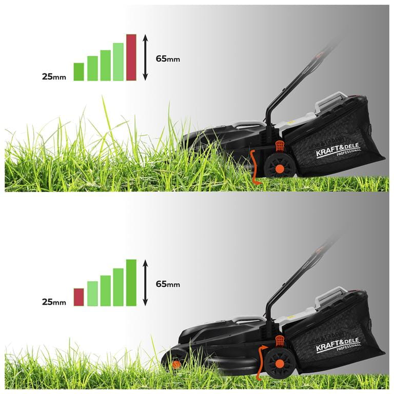 Zakres regulacji od 25 do 65 mm pozwala dostosować wysokość cięcia do aktualnego stanu trawy oraz pory roku. Niższe ustawienia sprawdzają się przy regularnym koszeniu zadbanych trawników, wyższe — przy pierwszym koszeniu po dłuższej przerwie lub na trawnikach ekstensywnych.