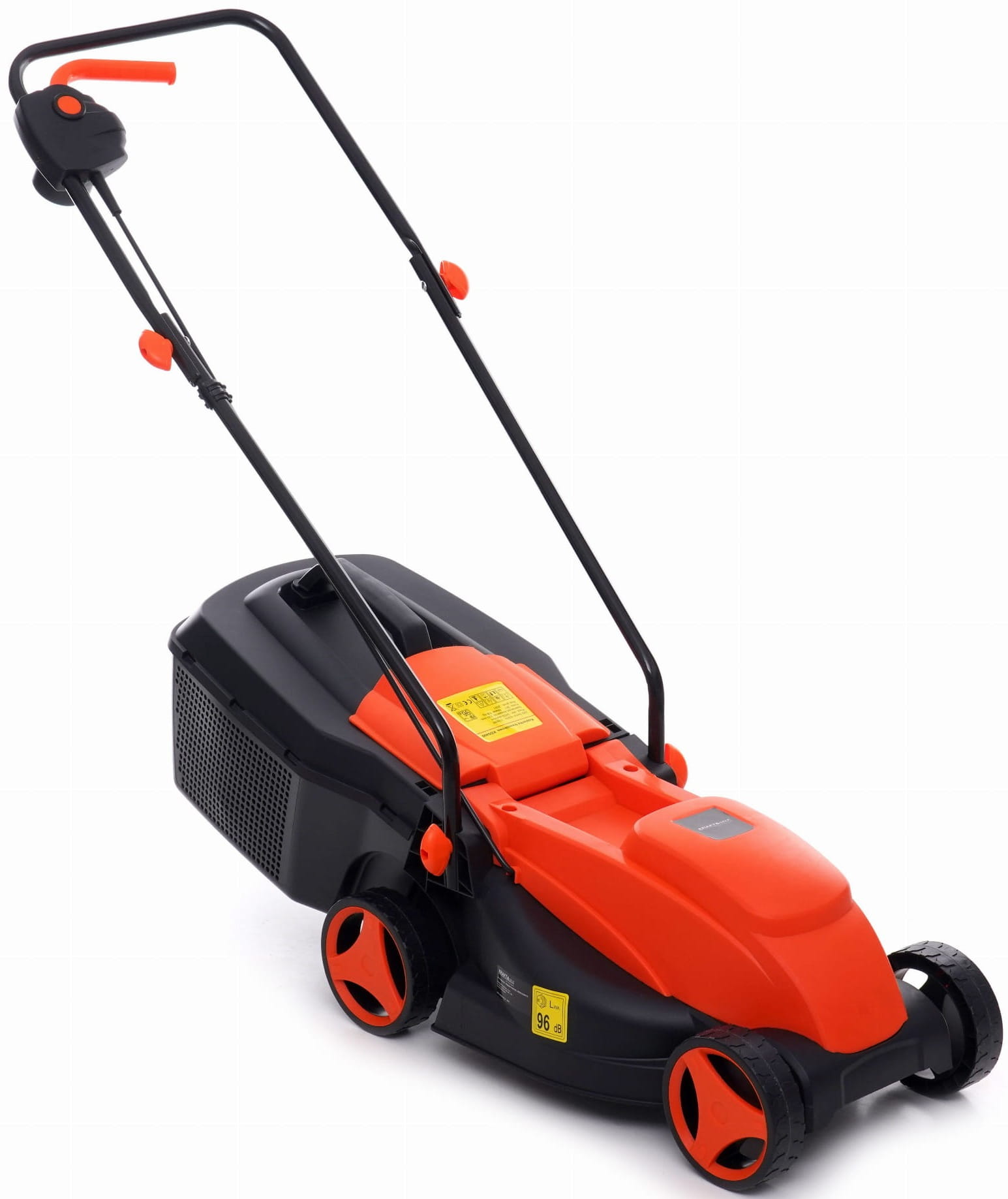 Deklarowany poziom głośności wynosi 96 dB. Zgodnie z przepisami BHP przy ekspozycji powyżej 85 dB zaleca się stosowanie ochronników słuchu podczas pracy. Kosiarka elektryczna generuje hałas o innym charakterze niż spalinowa — bez wibracji mechanizmu rozruchowego — jednak ochrona słuchu pozostaje wskazana przy dłuższych sesjach koszenia.