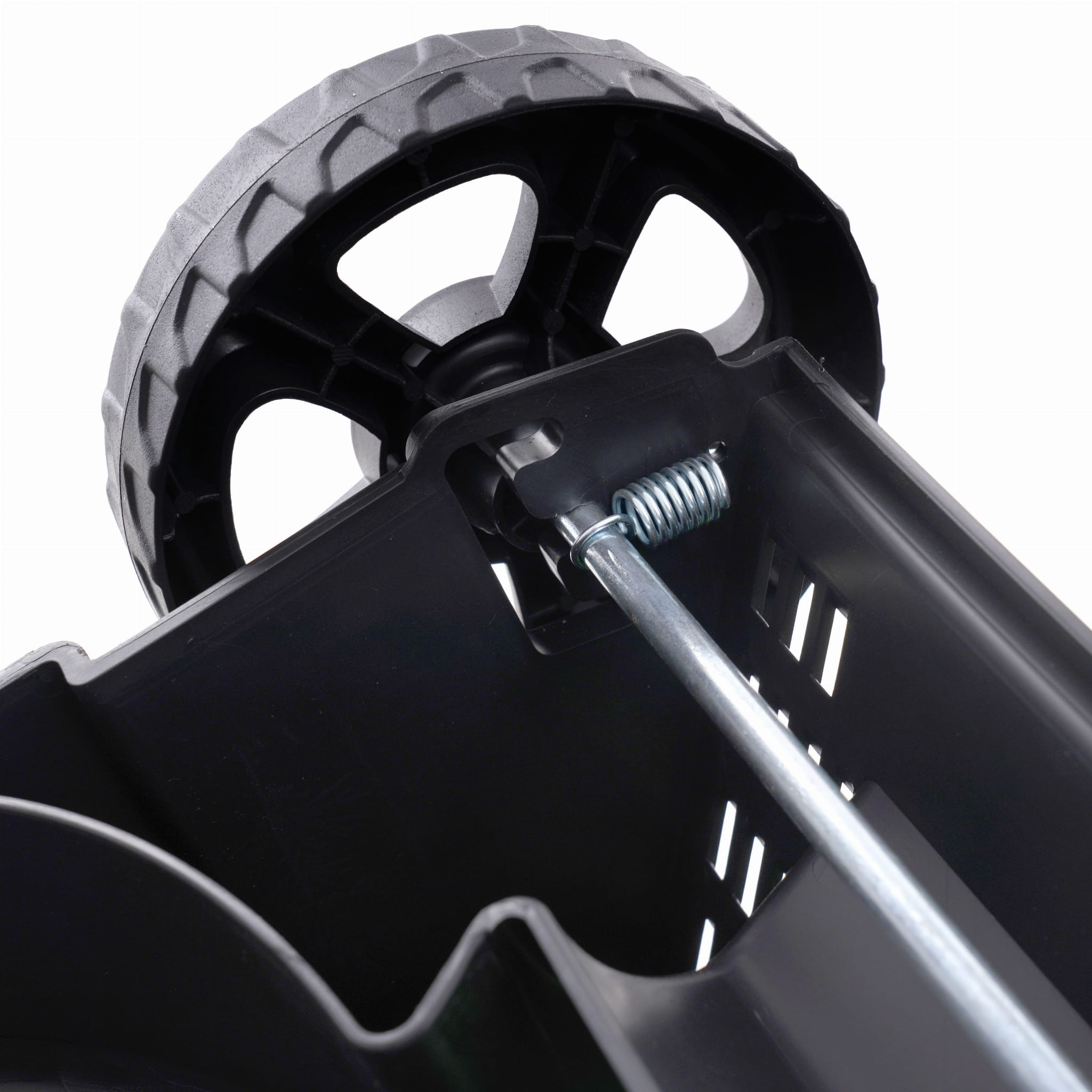 Zbiornik na skoszoną trawę o pojemności 30 litrów wyposażono w uchwyt ułatwiający przenoszenie i opróżnianie. Tworzywo sztuczne jest lżejsze od metalowej siatki, co obniża całkowitą wagę urządzenia. Przy intensywnym koszeniu kosz wymaga opróżniania co kilka minut — jest to norma dla tej klasy urządzeń.