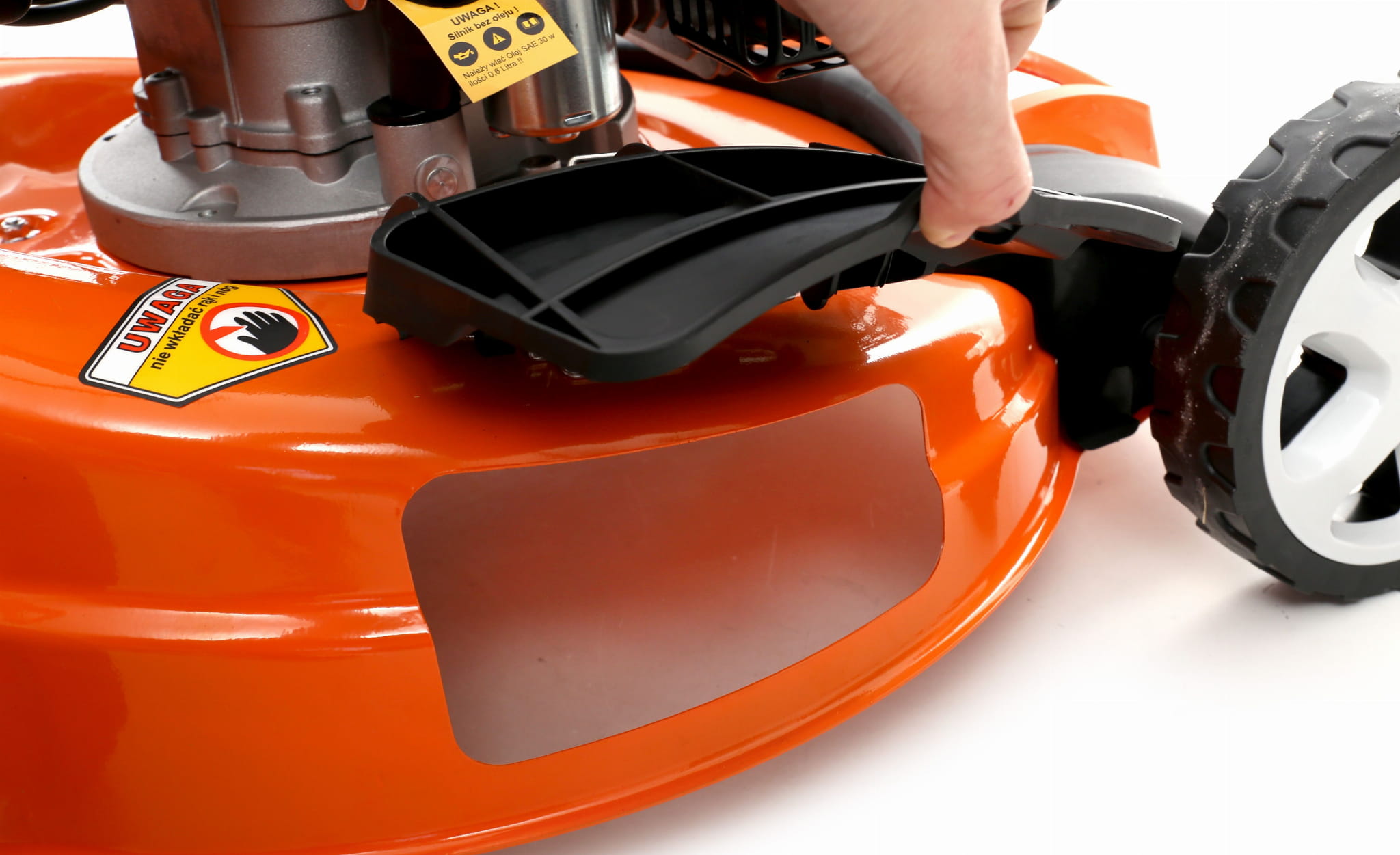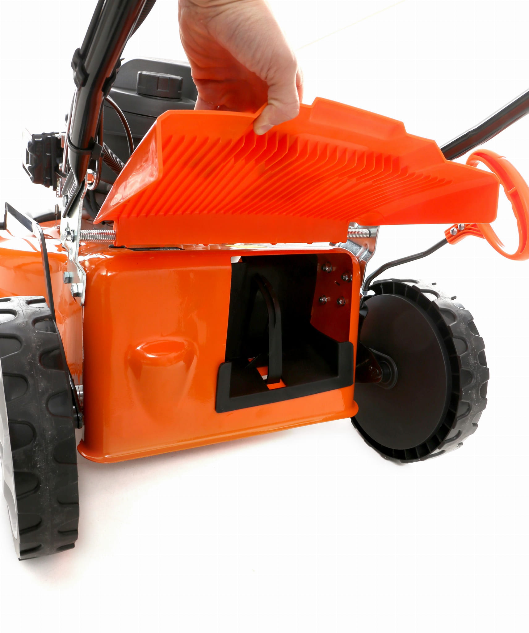 Pojemny kosz z tworzywa sztucznego o pojemności 60 litrów wymaga rzadszego opróżniania podczas pracy. Uchwyt do przenoszenia ułatwia transport zebranej trawy do kompostownika lub miejsca składowania. Kosiarka obsługuje również wylot boczny i tylny.