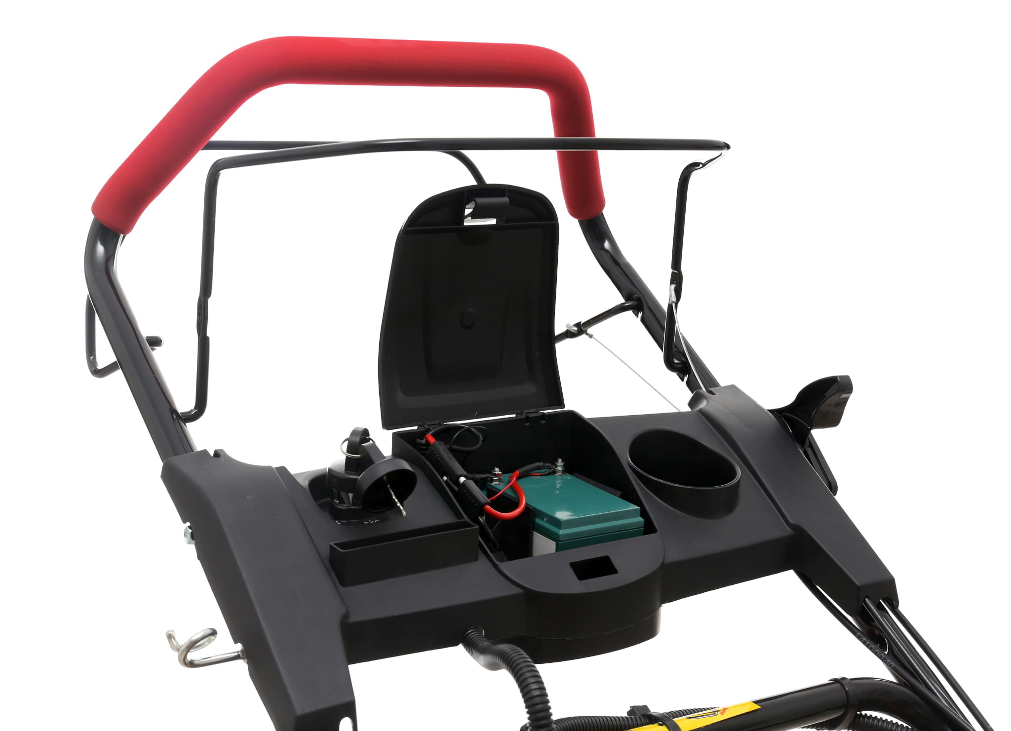 Kosiarka wyposażona jest w dwa niezależne systemy uruchamiania. Rozruch elektryczny eliminuje konieczność szarpania linką, co jest szczególnie istotne przy zimnym silniku lub w przypadku użytkowników mających trudności z uruchamianiem ręcznym. Rozruch linkowy stanowi zabezpieczenie awaryjne.