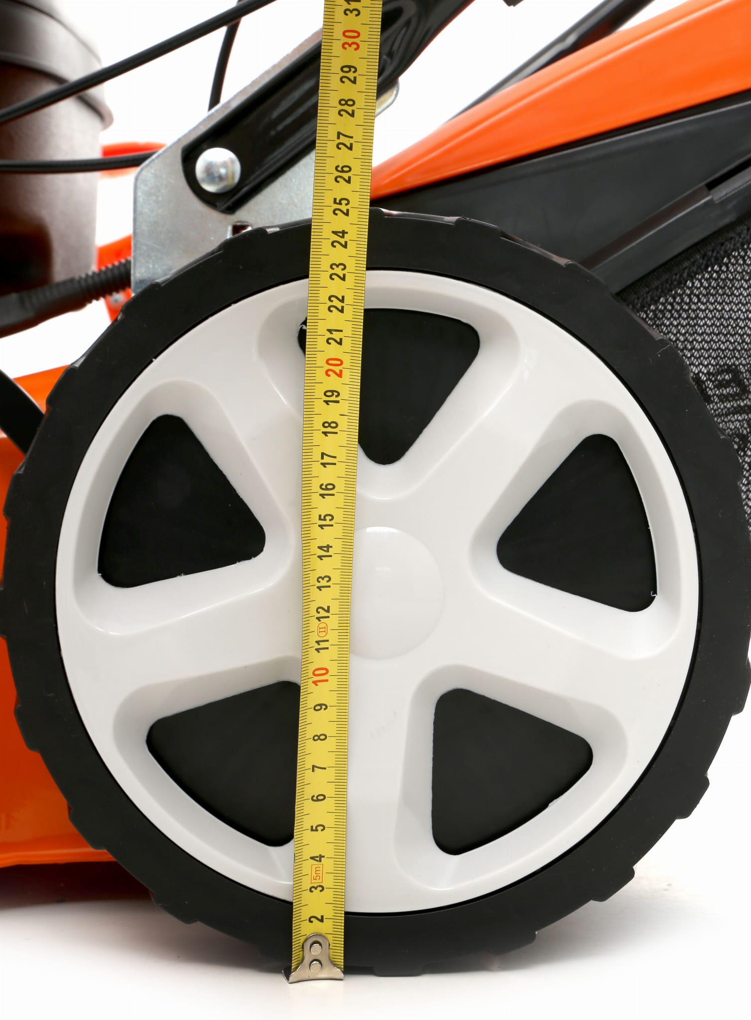 Zakres regulacji od 25 do 75 mm obejmuje zarówno cięcie dekoracyjne (krótka, gęsta murawa), jak i koszenie zaniedbanych trawników z wyższą trawą. Osiem pozycji pozwala na precyzyjne dopasowanie wysokości do aktualnego stanu roślinności i pory roku.