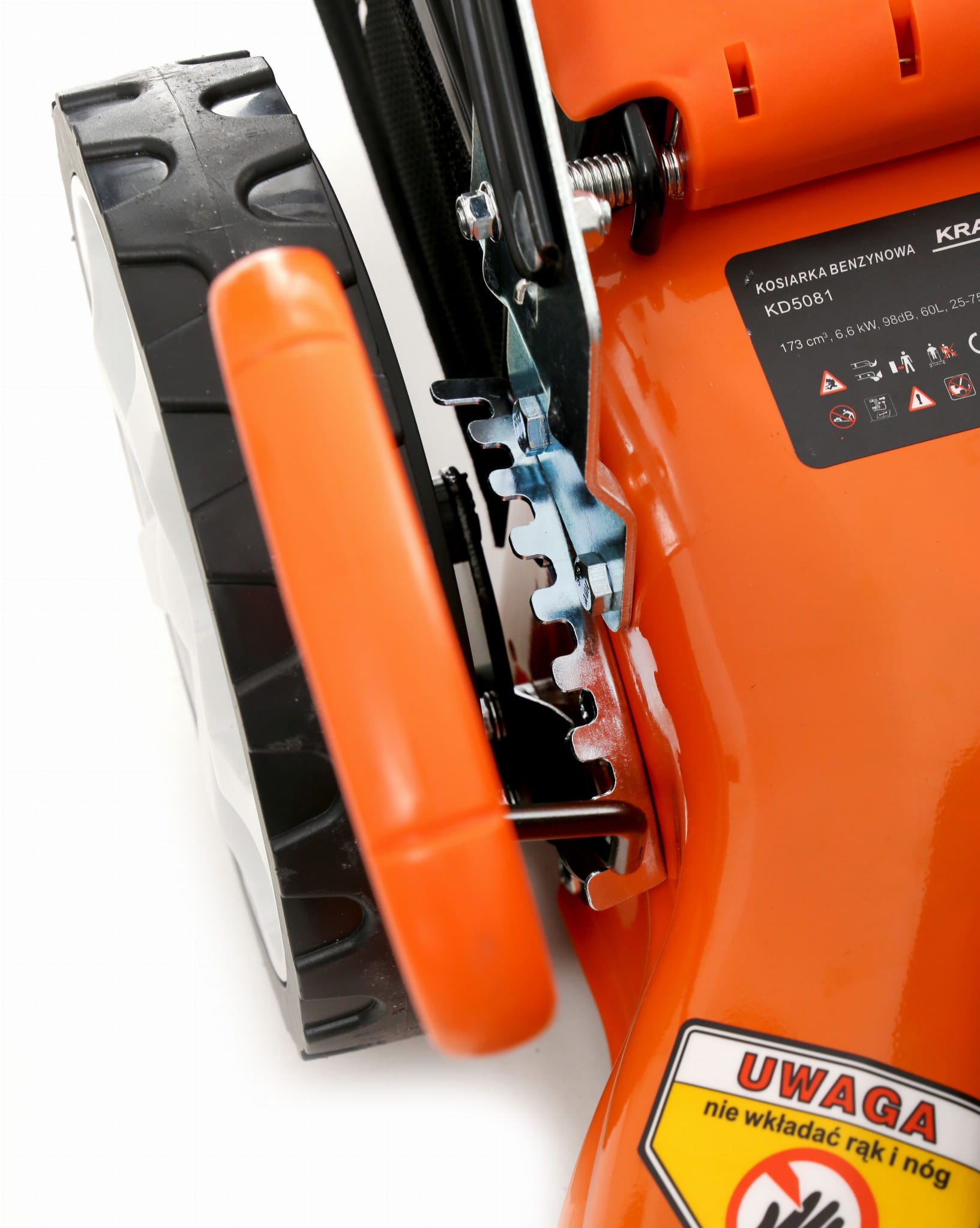 KD5081 to czterokołowa kosiarka benzynowa z silnikiem o pojemności 173 cc i mocy 6,6 kW, wyposażona w rozruch elektryczny, kosz zbiorczy o pojemności 60 litrów oraz funkcję mulczowania. Przeznaczona do pielęgnacji trawników przydomowych i działkowych o zróżnicowanej powierzchni.