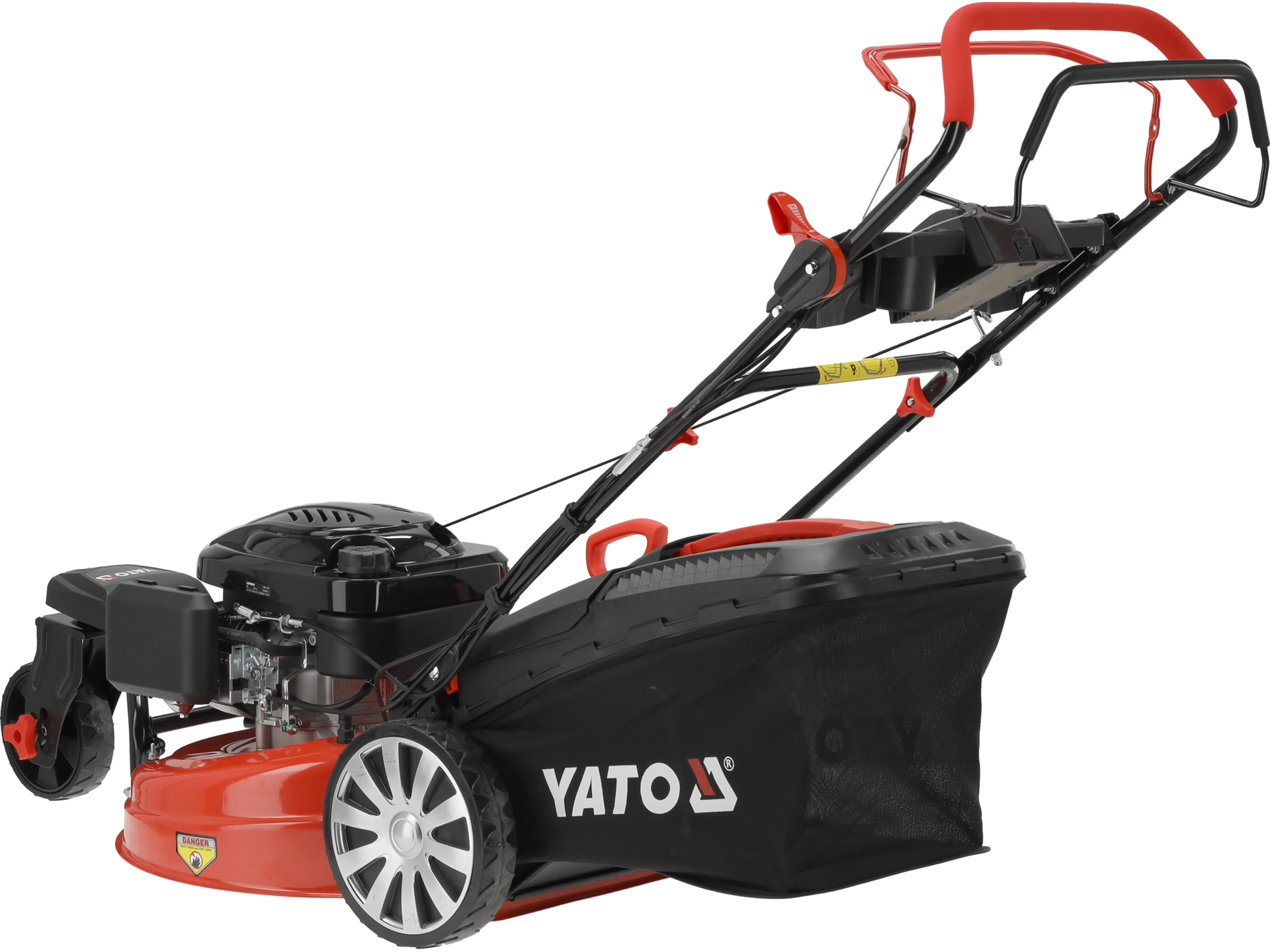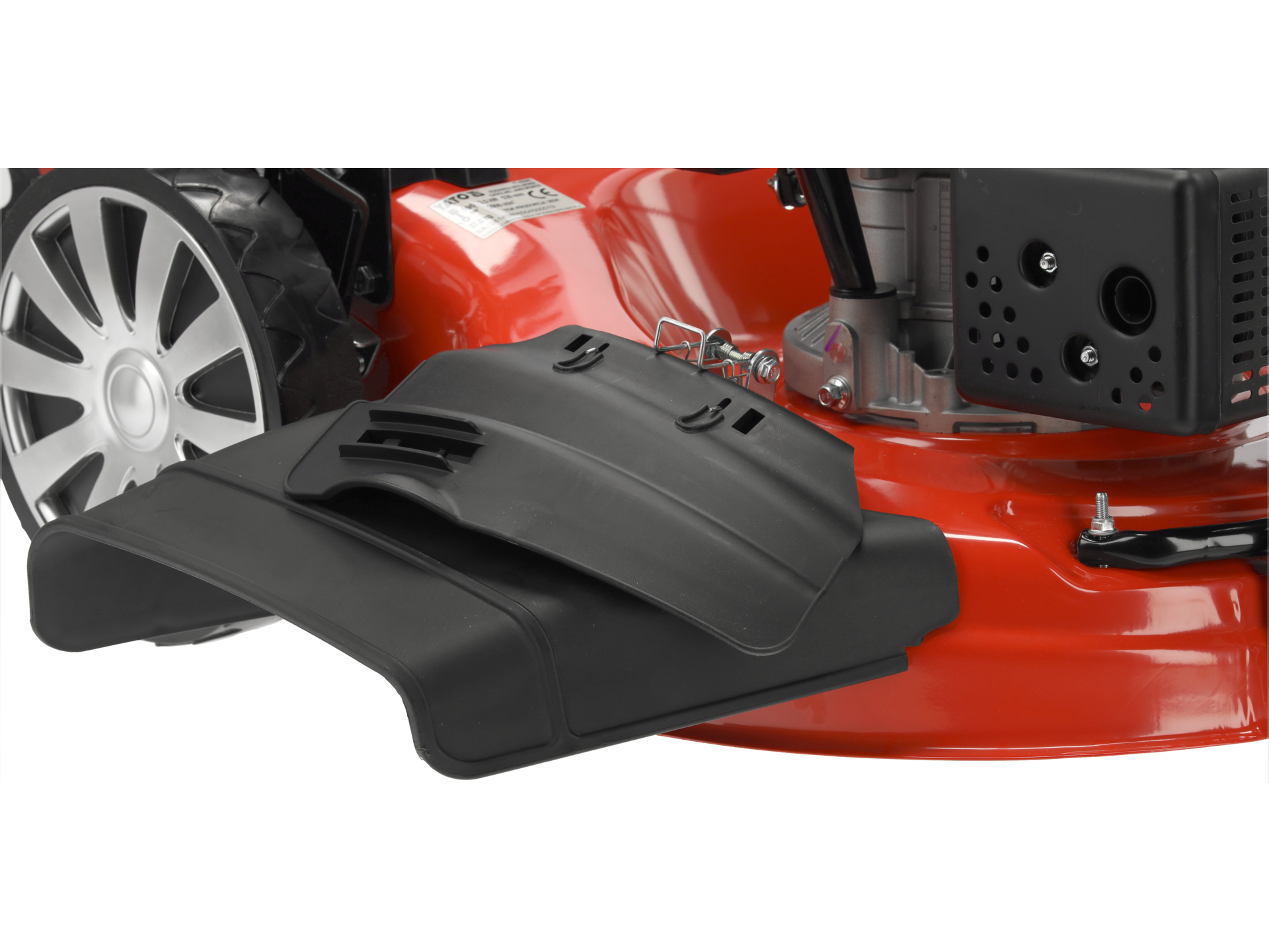 Mechaniczny napęd na tylne koła redukuje siłę potrzebną do prowadzenia kosiarki o wagę 37 kg, szczególnie na wzniesieniach i nierównościach terenu. System ułatwia pracę na działkach o powierzchni przekraczającej 500 m², gdzie długotrwałe pchanie kosiarki bez napędu generuje zmęczenie. Napęd można włączać i wyłączać dźwignią na uchwycie.
