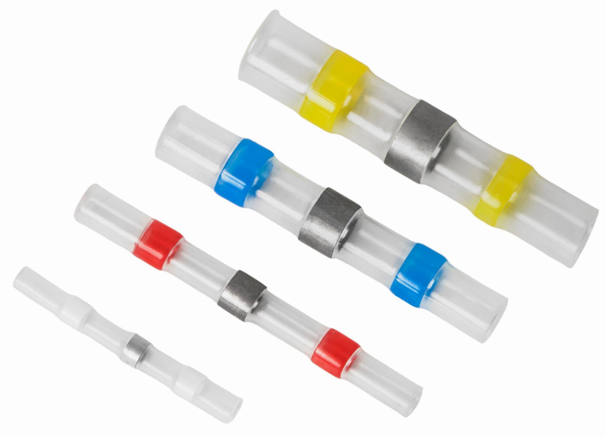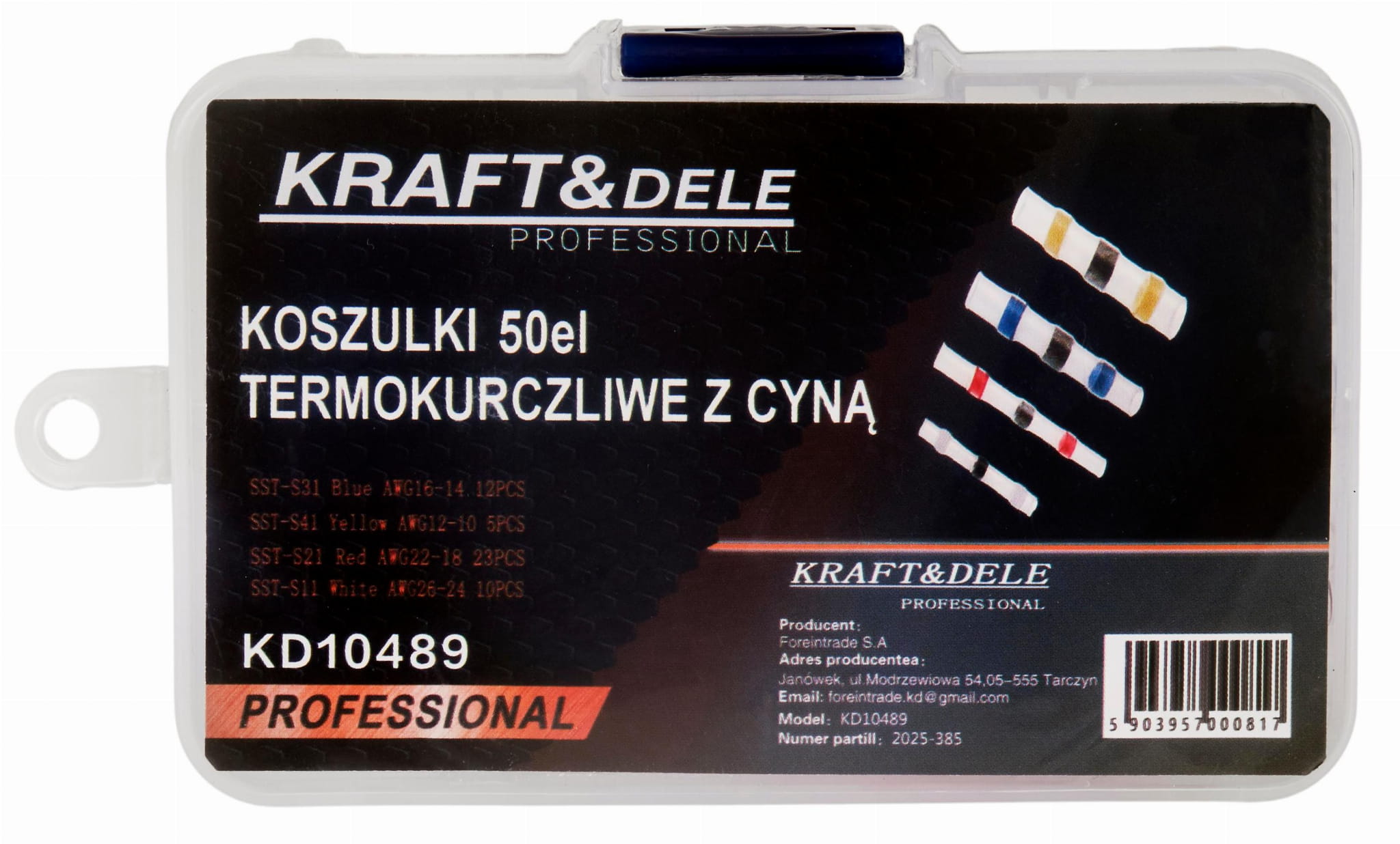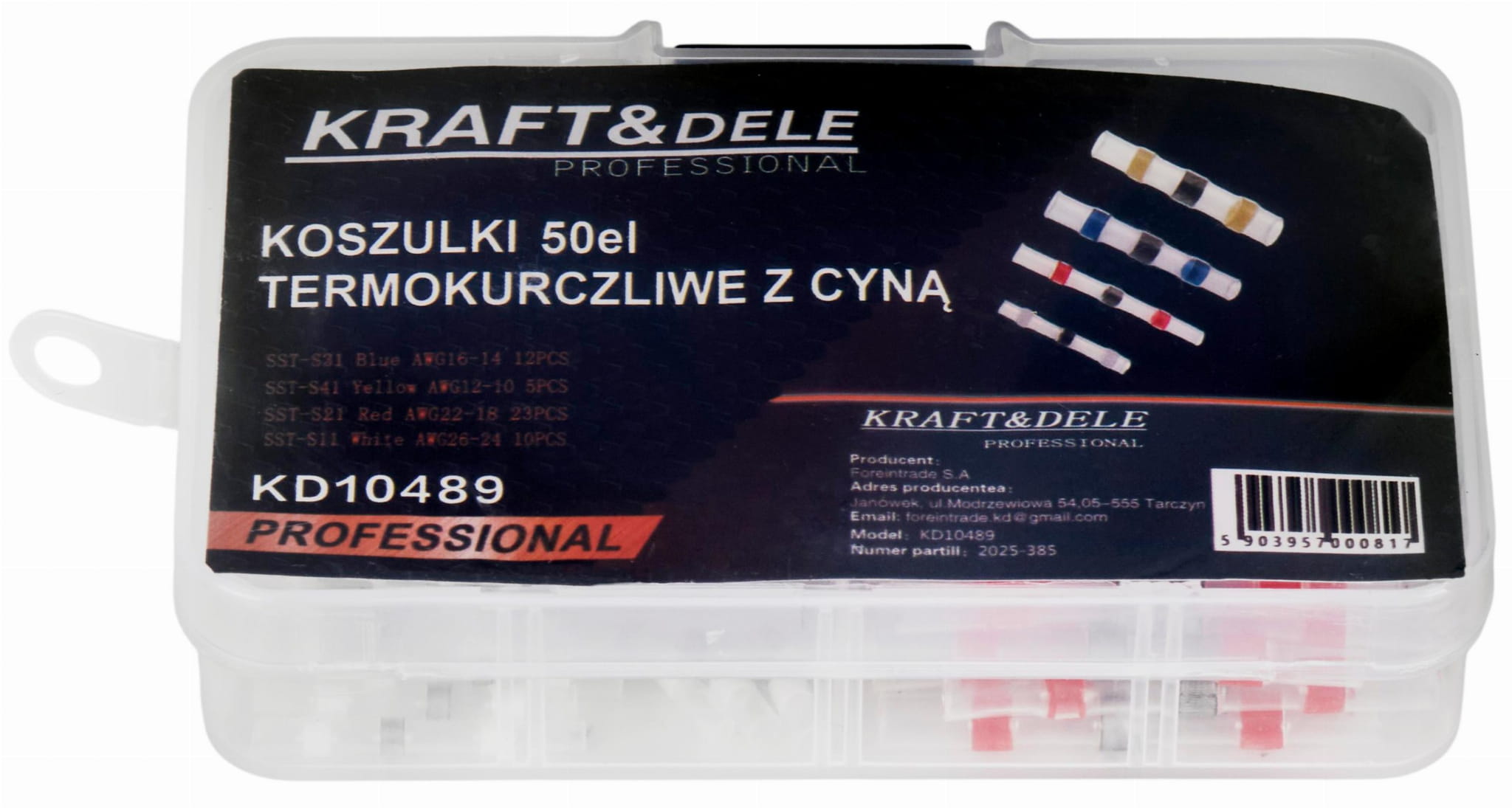 Koszulki termokurczliwe z wkładem lutowniczym umożliwiają jednoczesne połączenie mechaniczne, elektryczne i izolację przewodów w jednej operacji. Zestaw KD10489 marki Kraft&Dele zawiera cztery rozmiary oznaczone kolorami, obejmując zakres przekrojów żył od 0,25 do 6 mm².