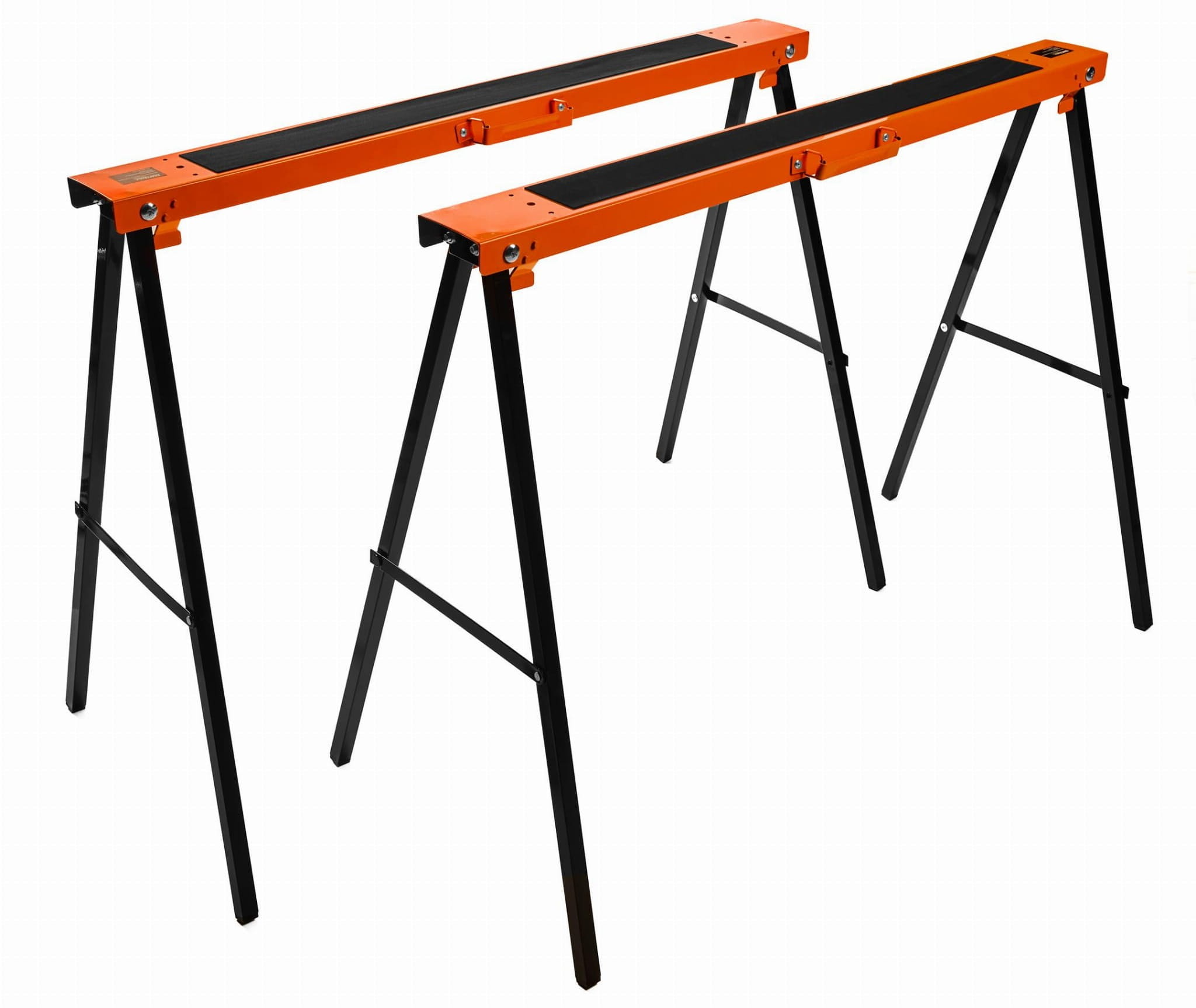 KD507 to stalowe koziołki robocze przeznaczone do prac warsztatowych i budowlanych, gdzie potrzebna jest stabilna, tymczasowa podpora dla materiałów lub elementów konstrukcyjnych. Składana konstrukcja umożliwia kompaktowe przechowywanie i transport. Zestaw obejmuje dwa koziołki.