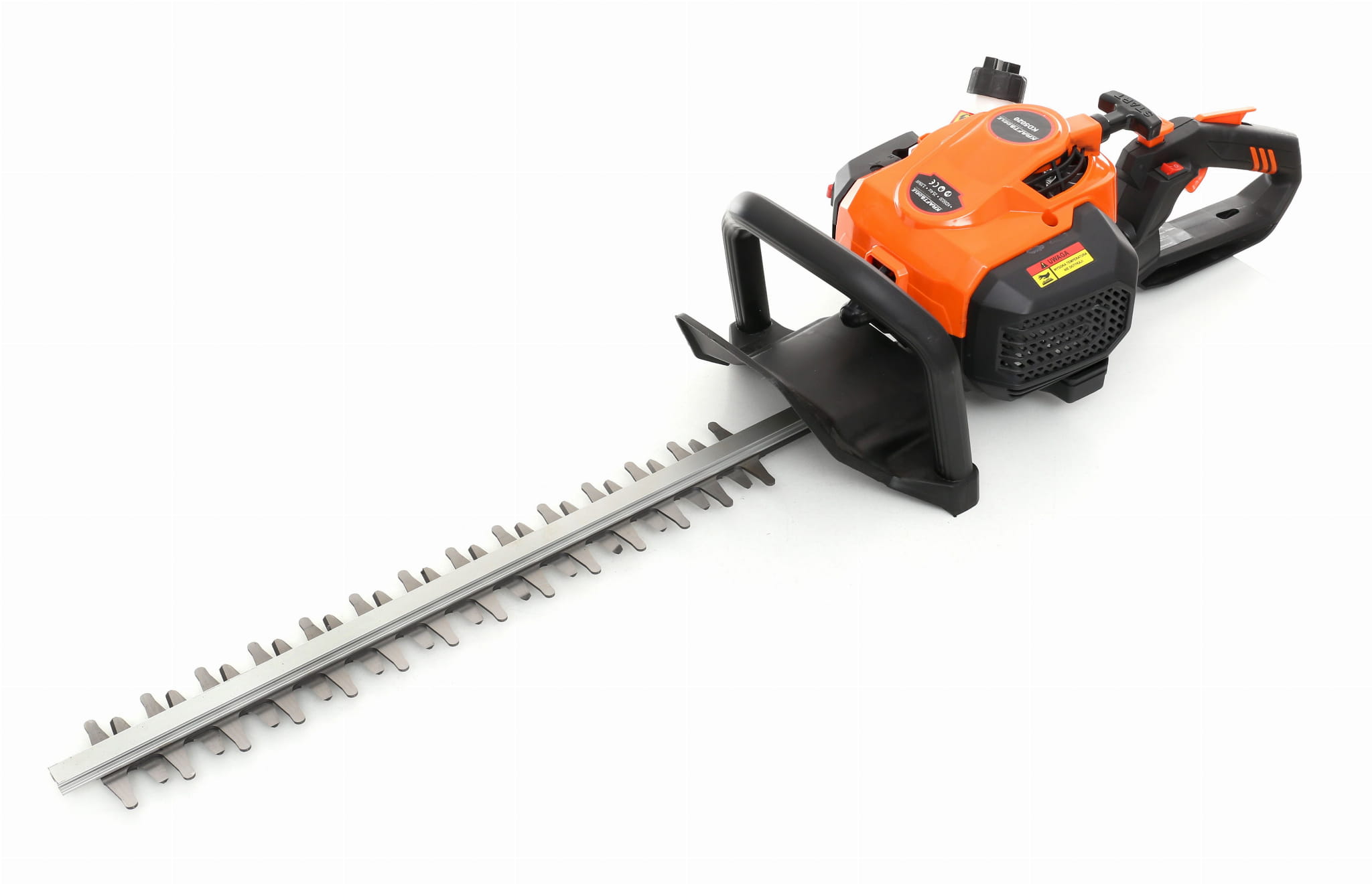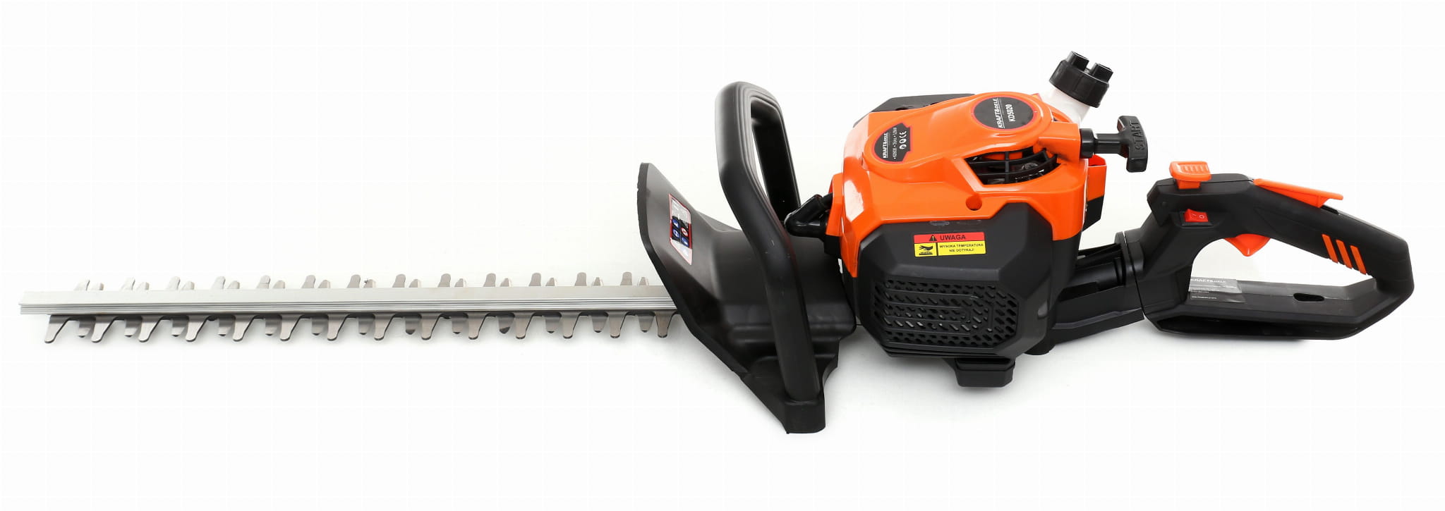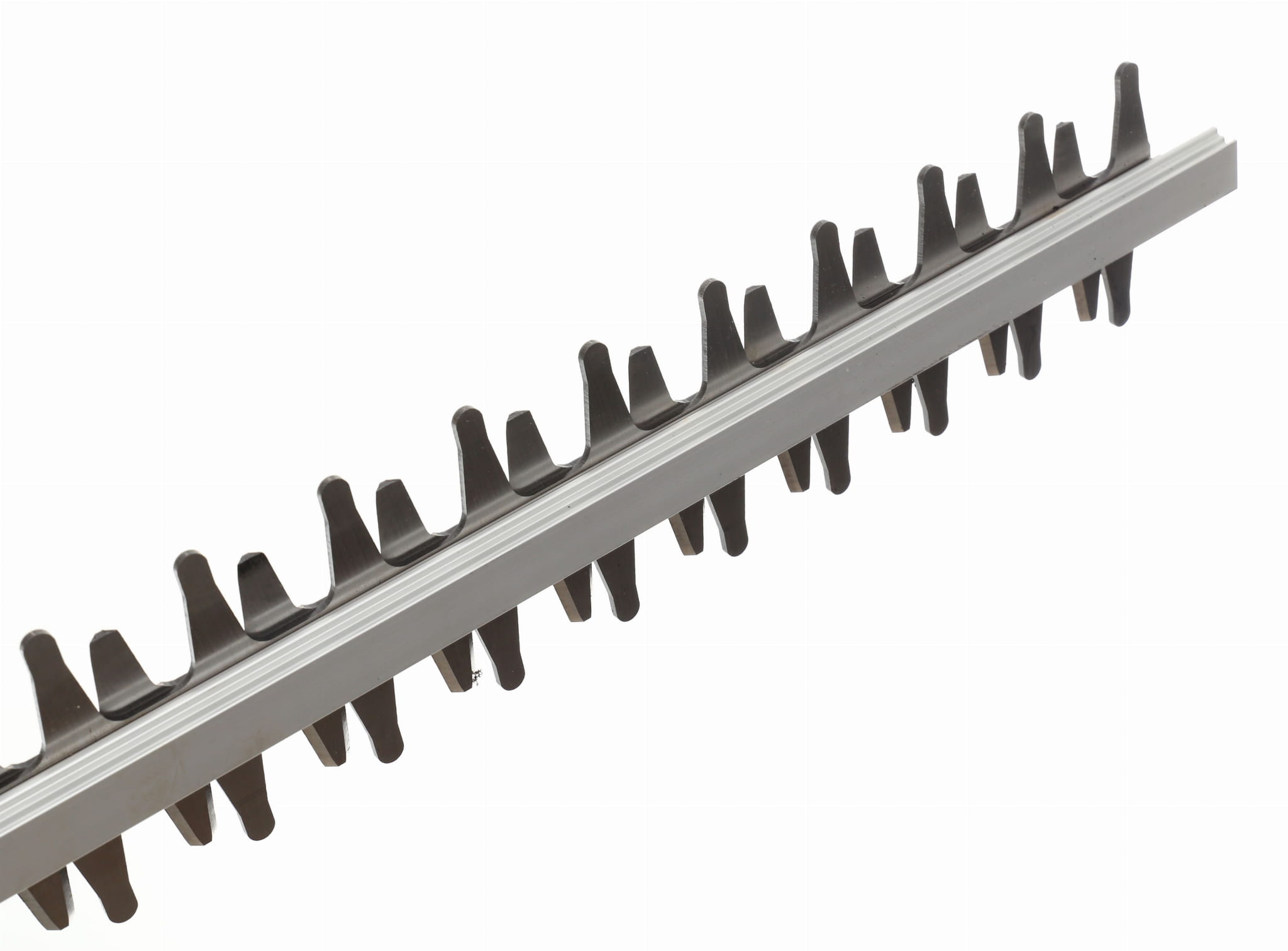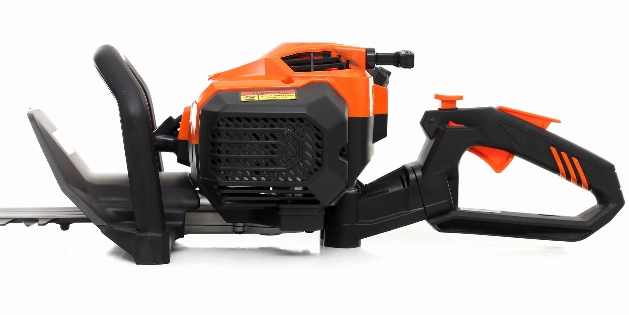 Długość listwy tnącej 550 mm umożliwia cięcie szerokich partii żywopłotu w jednym przejściu, co skraca czas pracy. Utwardzane ostrza dłużej zachowują ostrość i są bardziej odporne na uszkodzenia przy kontakcie z twardszymi gałęziami. Maksymalna grubość ciętej gałęzi wynosi 22 mm — odpowiada to pędom typowym dla thui, ligustru czy bukszpanu.