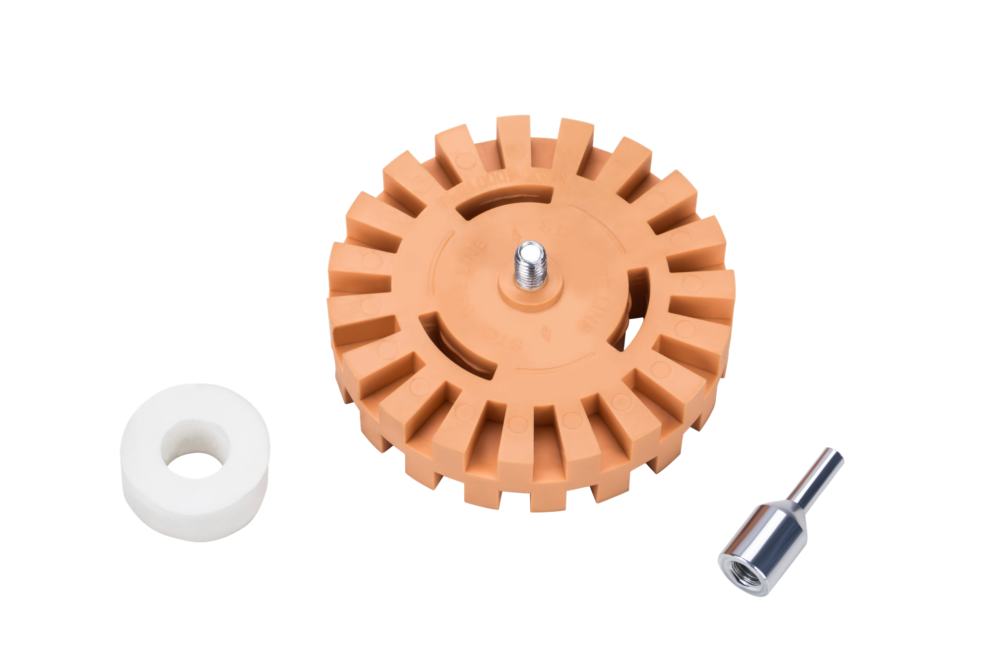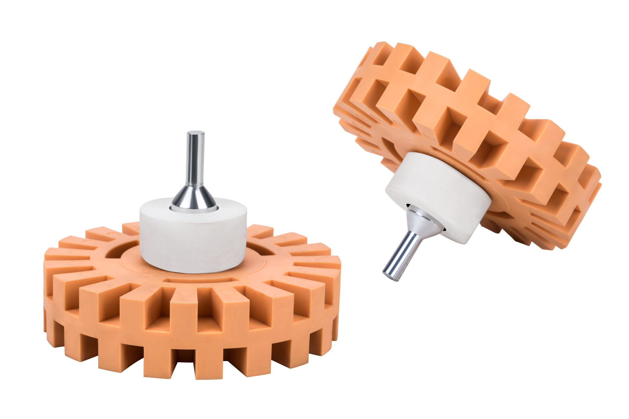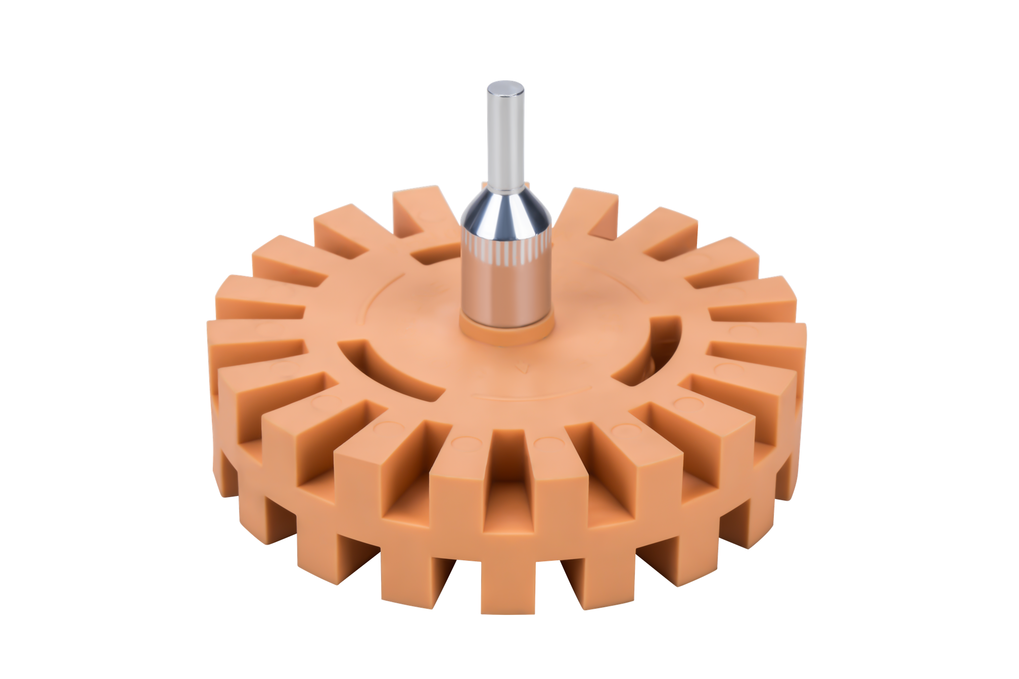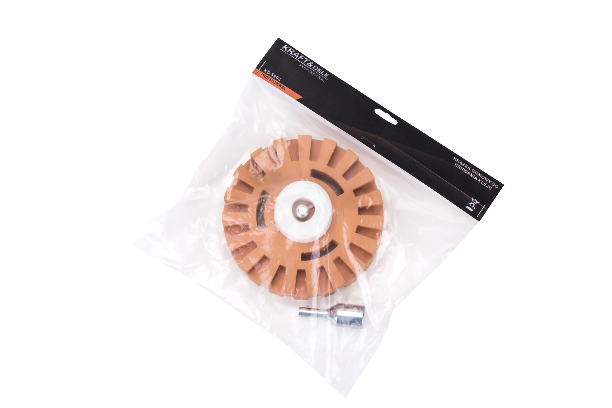 Gumowy krążek obrotowy przeznaczony do mechanicznego usuwania pozostałości kleju, taśm samoprzylepnych i naklejek z lakierowanych, metalowych oraz plastikowych powierzchni. Pracuje bez środków chemicznych — samo tarcie rotacyjne rozkłada i zbiera warstwę kleju, nie naruszając podłoża.