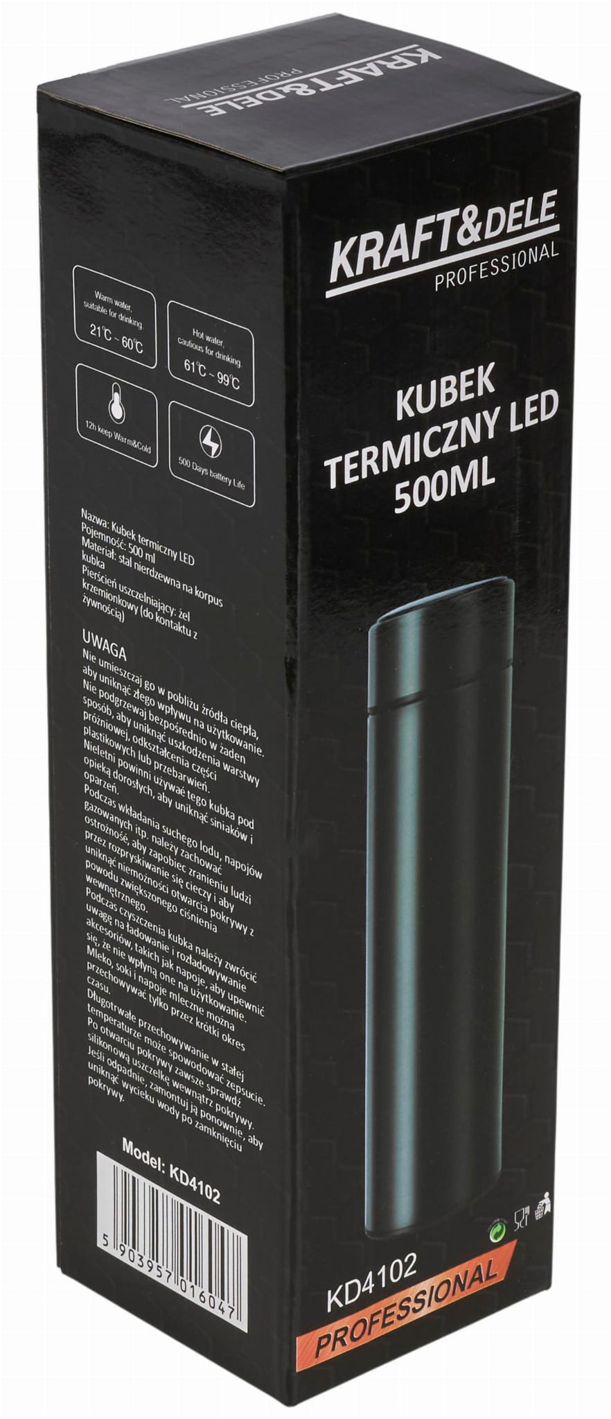 KD4102 to kubek termiczny wyposażony w dotykowy panel sterowania i cyfrowy wyświetlacz LED, który na bieżąco pokazuje temperaturę zawartości. Wnętrze wykonano ze stali nierdzewnej 304, a izolacja termiczna utrzymuje temperaturę napoju przez okres do 12 godzin zarówno w przypadku napojów gorących, jak i zimnych.