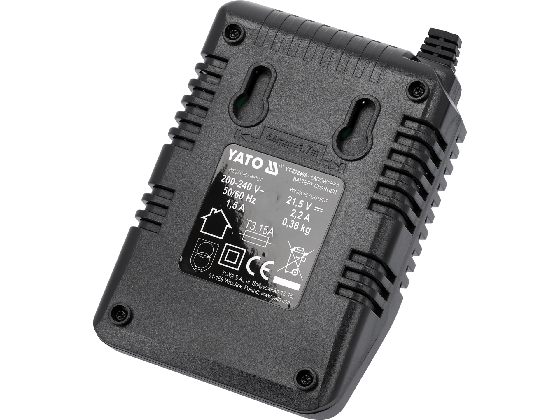 Ładowarka YATO YT-828498 wymaga zasilania sieciowego 200-240V AC o częstotliwości 50 lub 60 Hz. Napięcie wyjściowe 21.5V DC jest wyższe od nominalnego napięcia akumulatora (18V), co jest standardem w procesie ładowania ogniw litowo-jonowych. Klasa izolacji II oznacza podwójną izolację elektryczną, co eliminuje konieczność uziemienia urządzenia.
