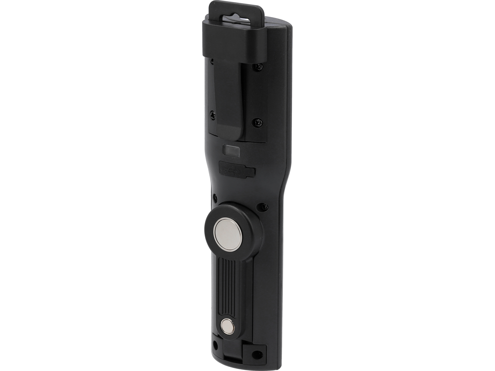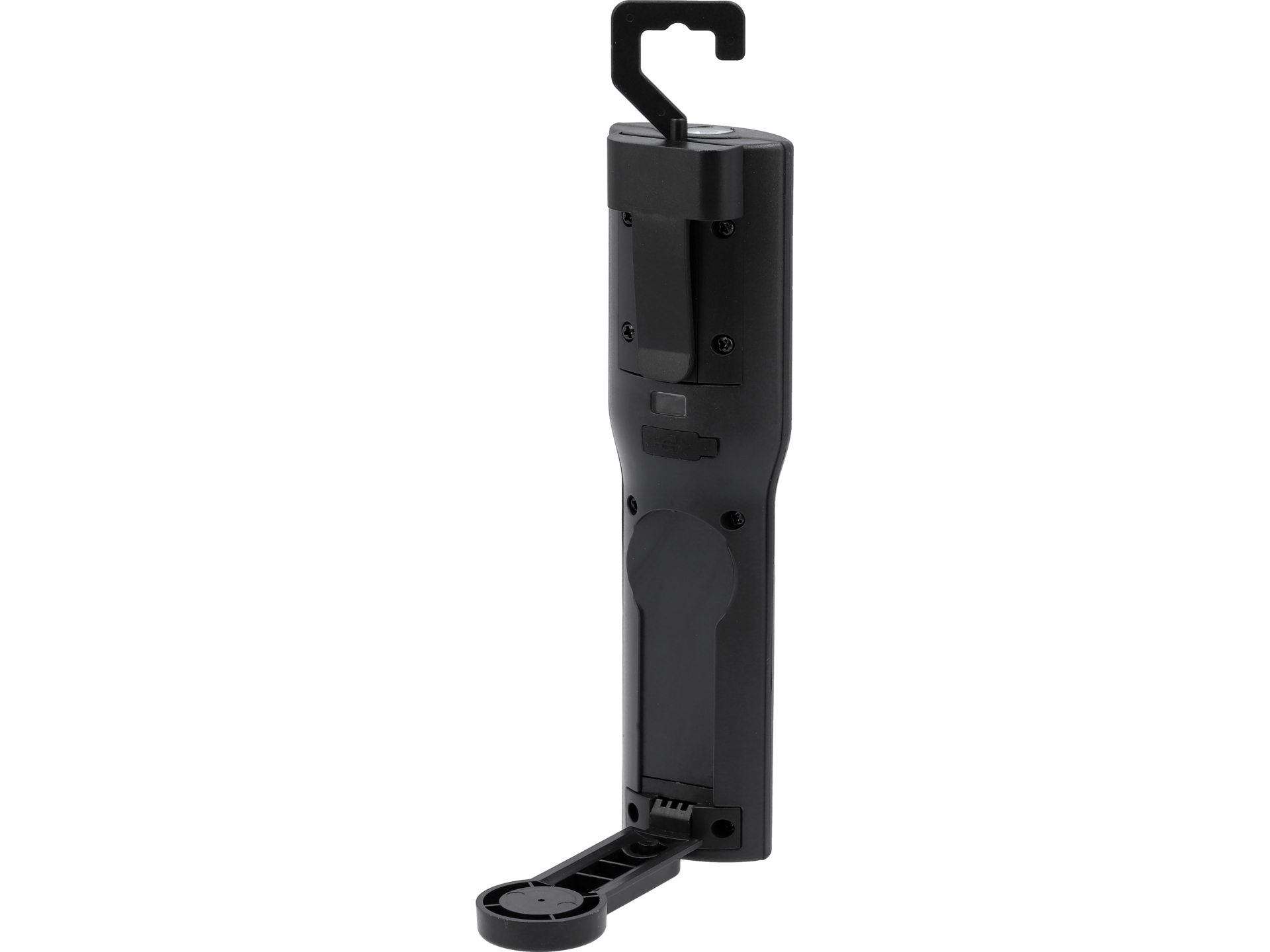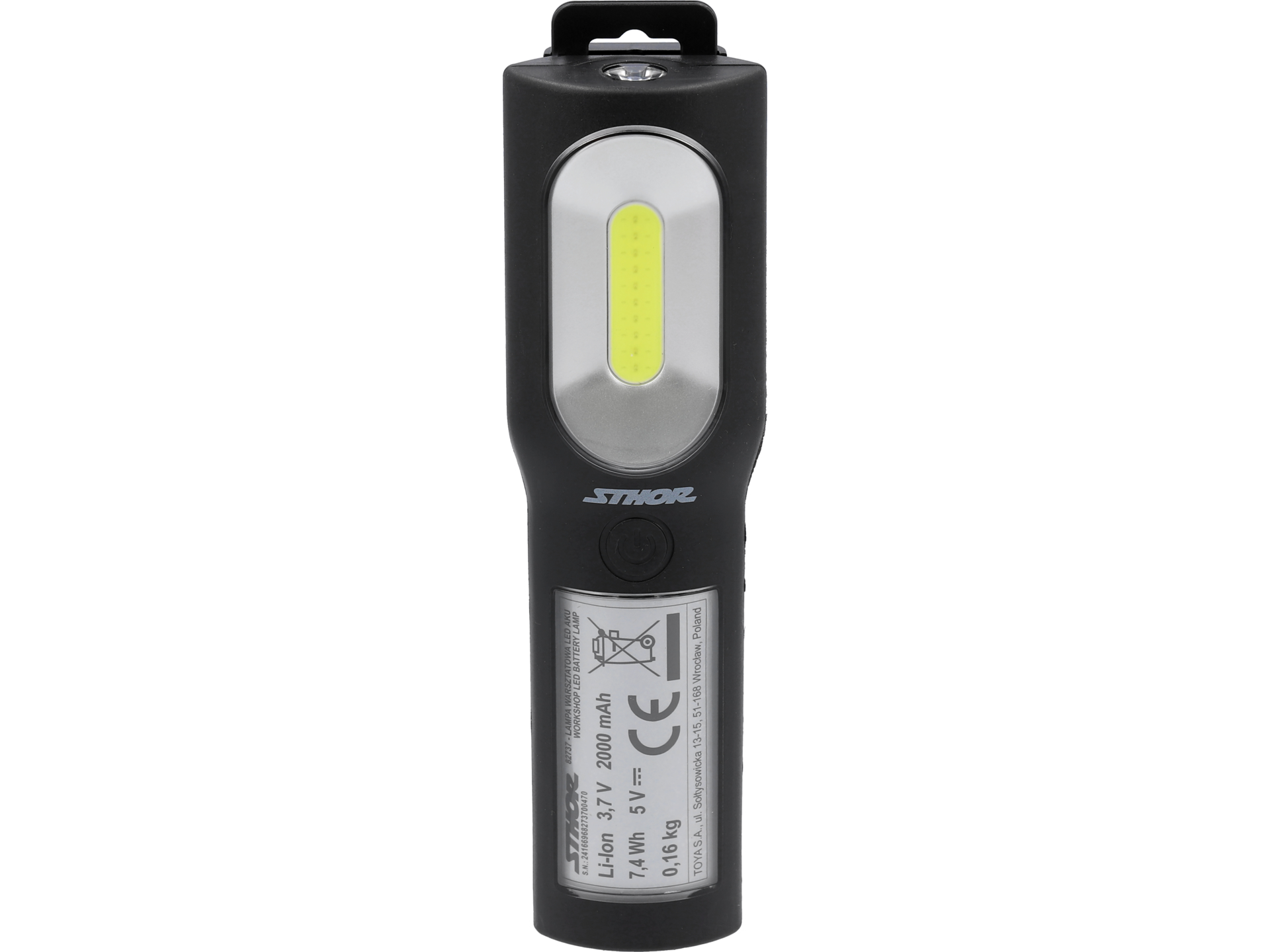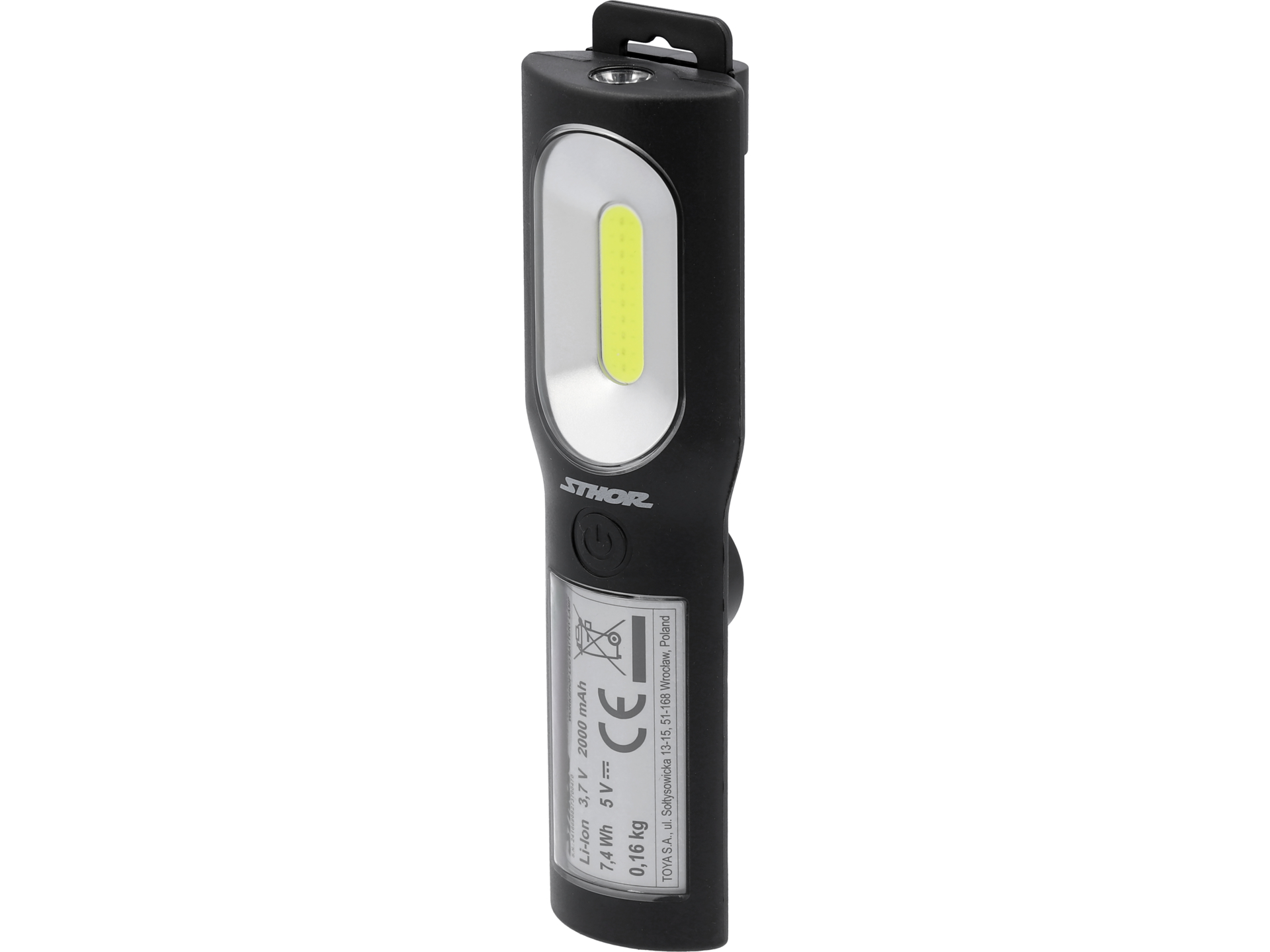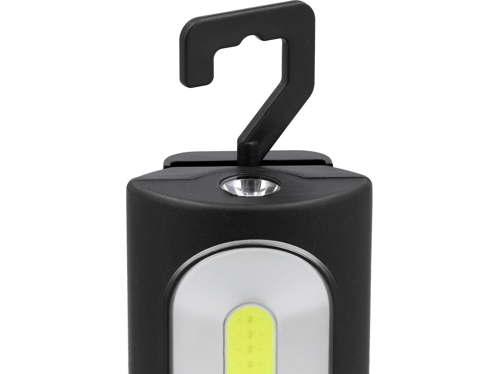 Akumulatorowa lampa warsztatowa z podwójnym źródłem światła LED (COB 350 lm + Power LED 65 lm), wyposażona w akumulator Li-Ion 2000 mAh oraz trzy systemy mocowania: magnesy neodymowe, obrotowy haczyk i klips.