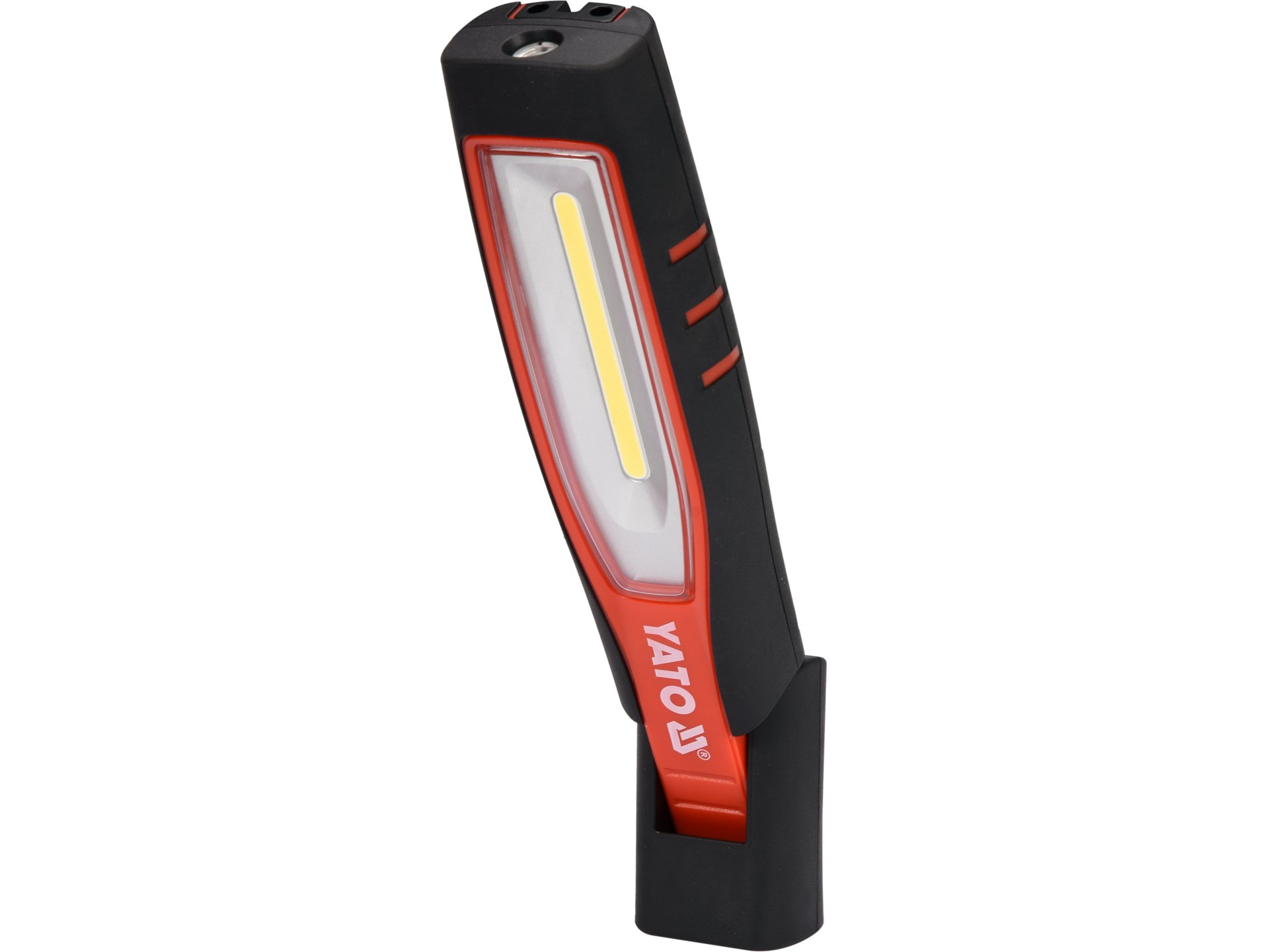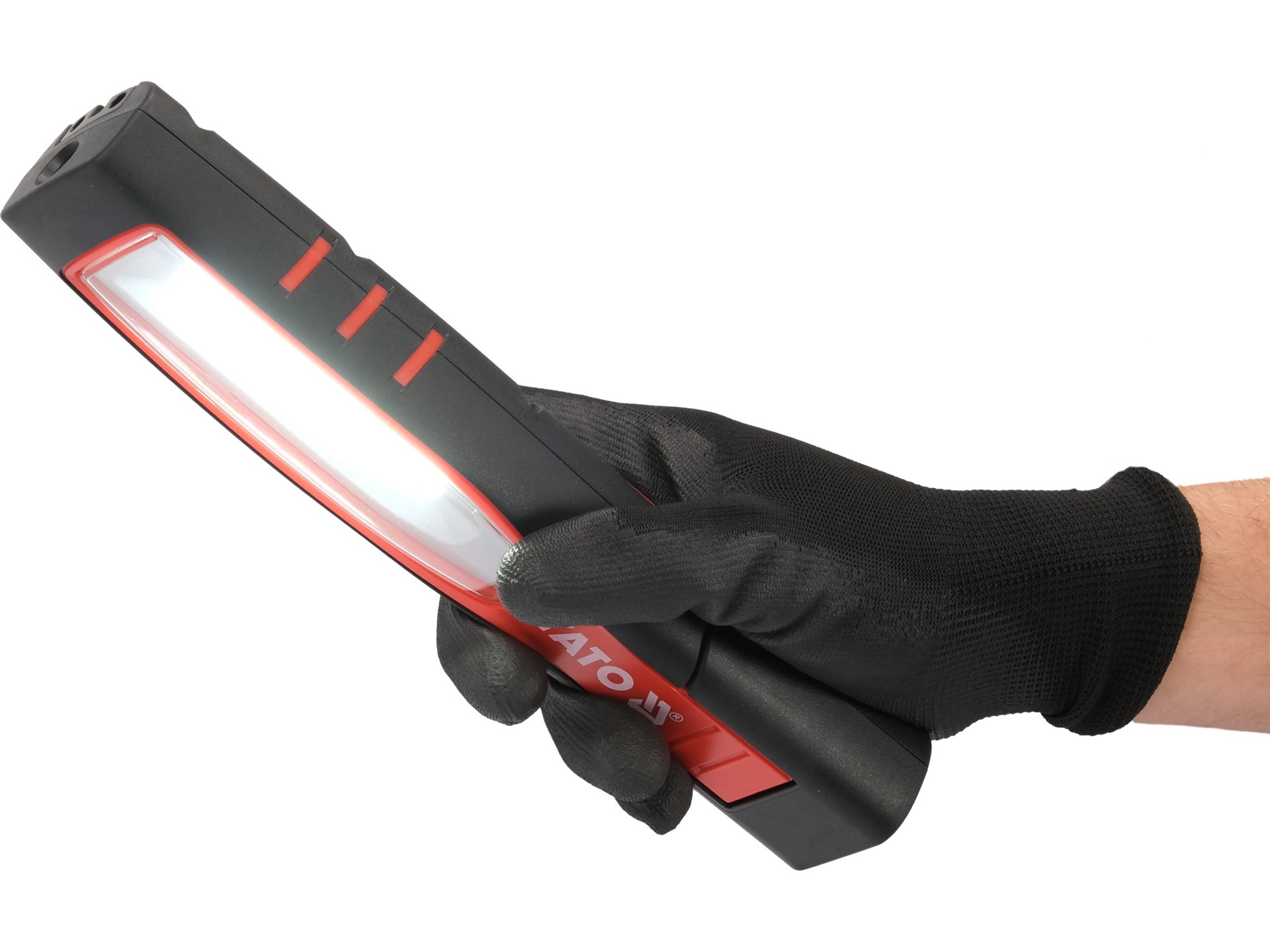 Akumulatorowa lampa warsztatowa z diodą COB LED o mocy 10W i maksymalnym strumieniu świetlnym 1000 lumenów. Urządzenie wyposażone w akumulator litowo-jonowy 3200mAh zapewnia do 11 godzin pracy w trybie niskim. Klasa ochrony IP65 i IK09 gwarantuje pyłoszczelność, odporność na wodę oraz wytrzymałość mechaniczną przy upadku z wysokości 2 metrów.