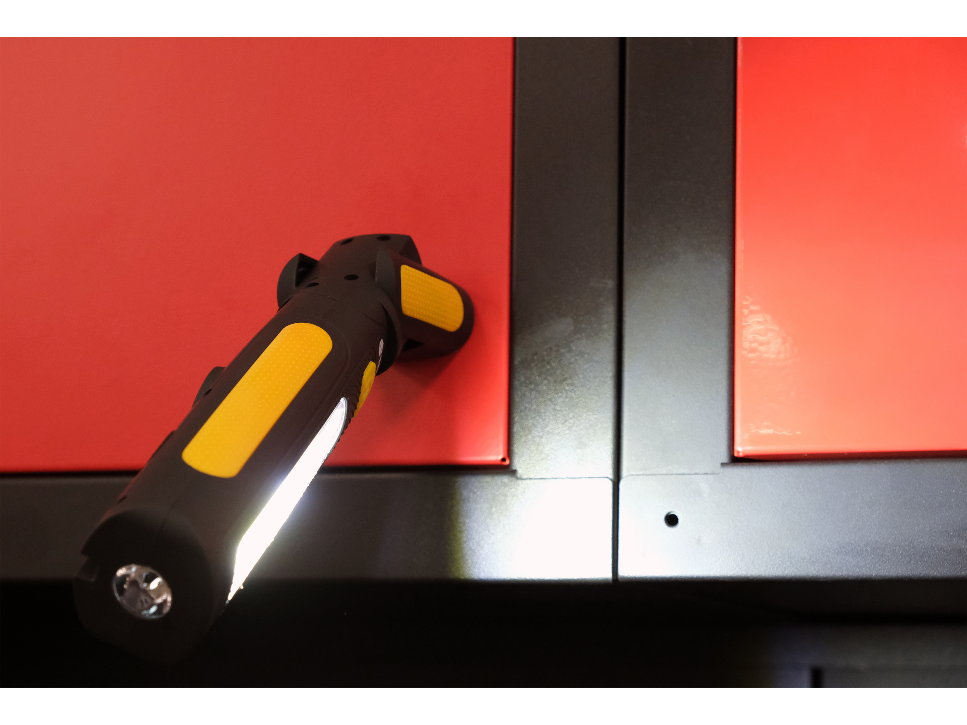 Przenośna lampa warsztatowa z technologią COB LED, zapewniająca strumień świetlny 300 lumenów przy mocy 5W. Wyposażona w obrotowy hak i magnetyczny uchwyt, umożliwiający montaż w różnych pozycjach roboczych.