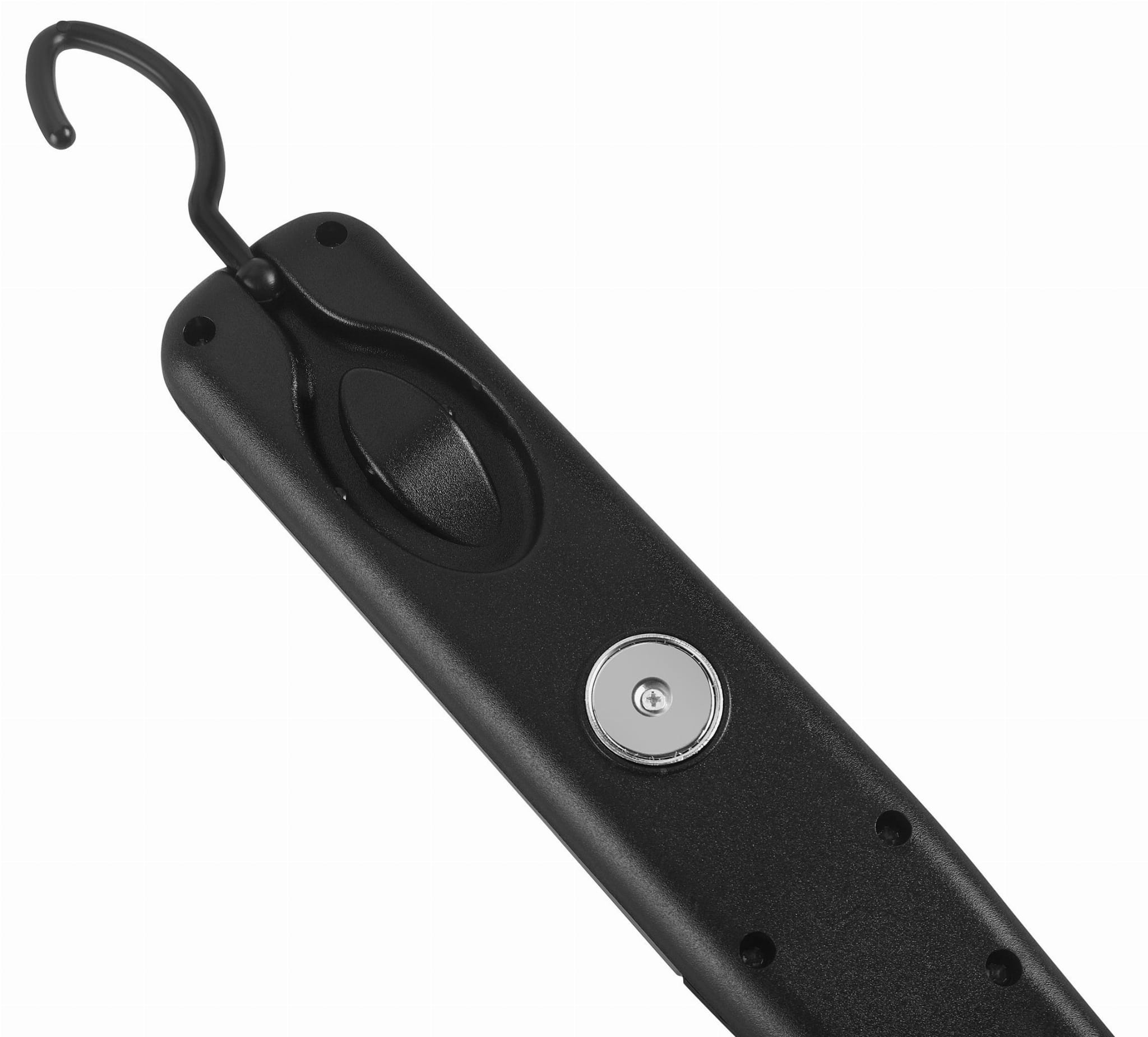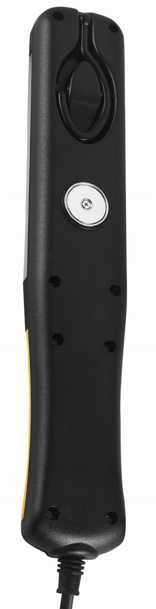 Haczyk do zawieszania umożliwia stabilne zamocowanie lampy na rurach, belkach lub otwartych drzwiach. Magnes umieszczony z tyłu obudowy pozwala na natychmiastowe przytwierdzenie lampy do stalowych powierzchni — nadwozi pojazdów, szaf metalowych, konstrukcji nośnych.