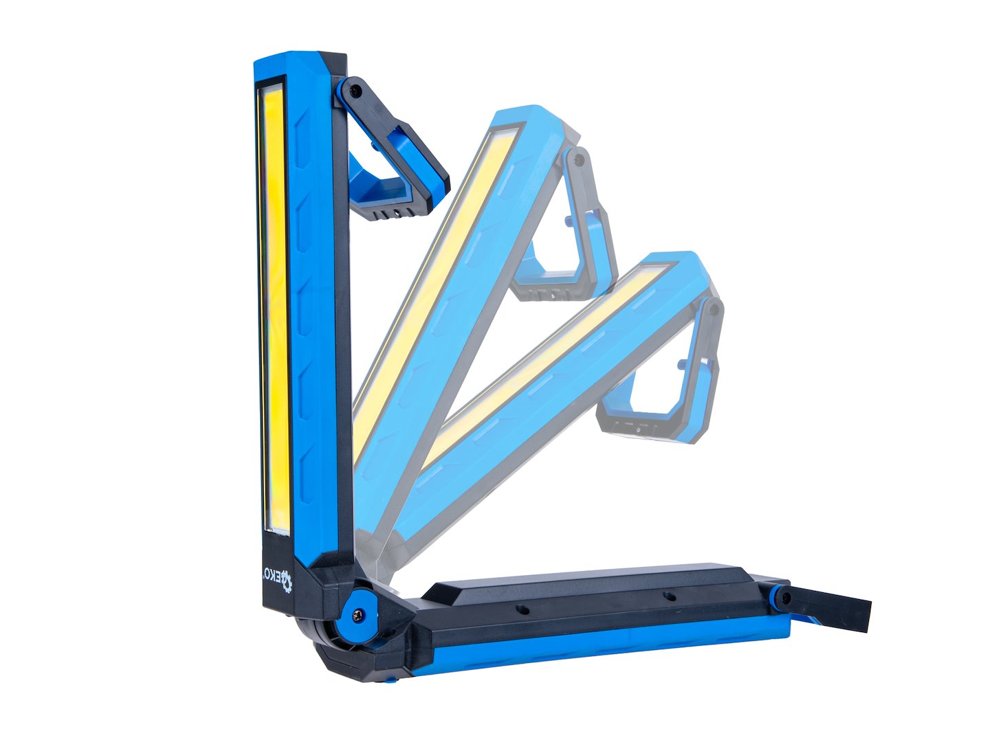 Przenośna lampa akumulatorowa z diodami LED COB o mocy 10W i strumieniu świetlnym 1000 lumenów, przeznaczona do pracy w warsztacie, garażu i w terenie. Składana konstrukcja z dwoma panelami świetlnymi umożliwia regulację kąta padania światła, a zintegrowany magnes neodymowy, hak oraz gwint statywowy zapewniają montaż bez użycia rąk na różnych powierzchniach.