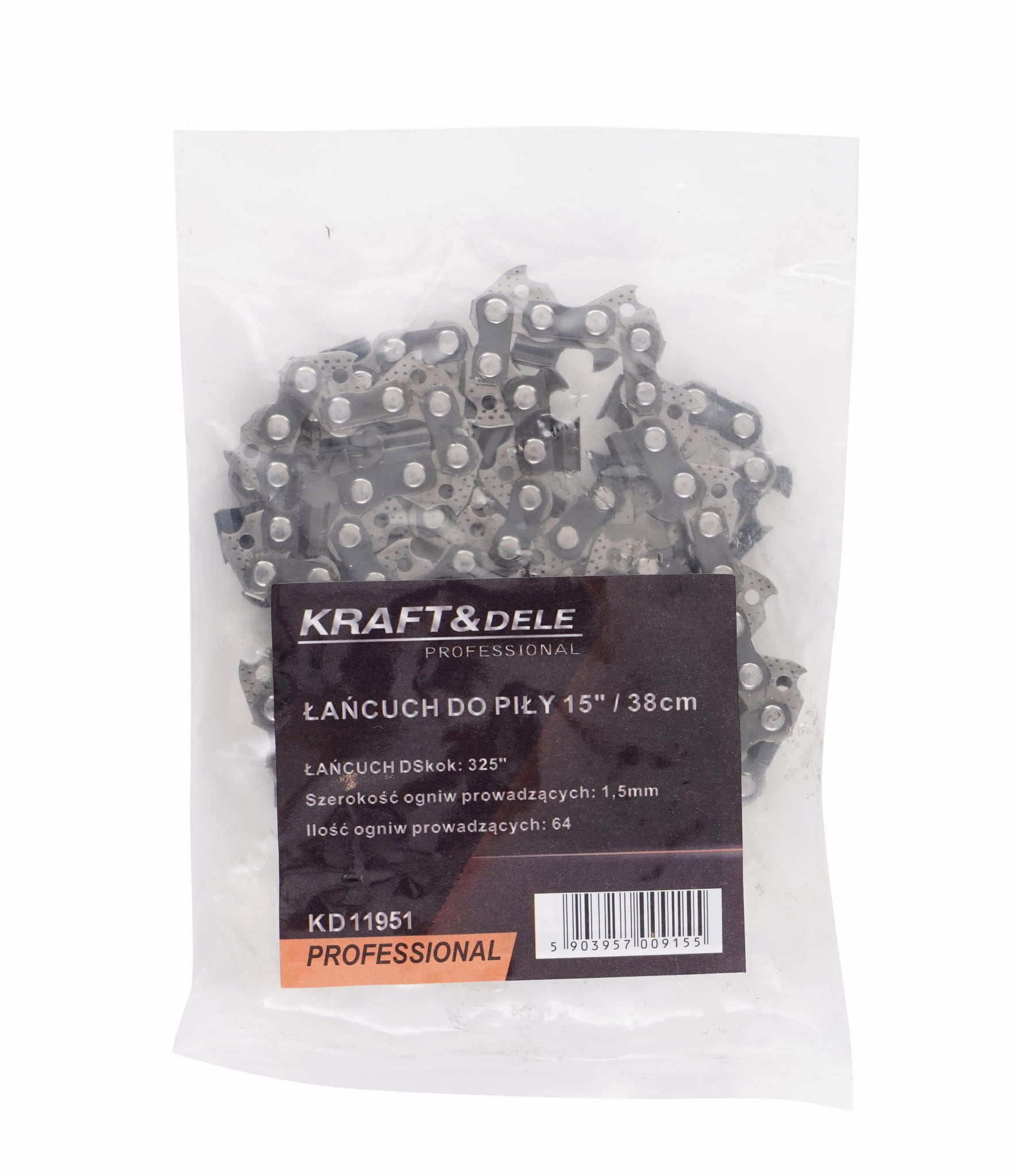 Łańcuch tnący przeznaczony do pilarek z prowadnicą 15" (38 cm), wykonany ze stali z powłoką antyścierną. Skok 3/8" i szerokość ogniwa 1,5 mm to parametry spotykane w szerokiej grupie pilarek półprofesjonalnych i amatorskich — przed zakupem należy zweryfikować te wartości w dokumentacji posiadanej pilarki.
