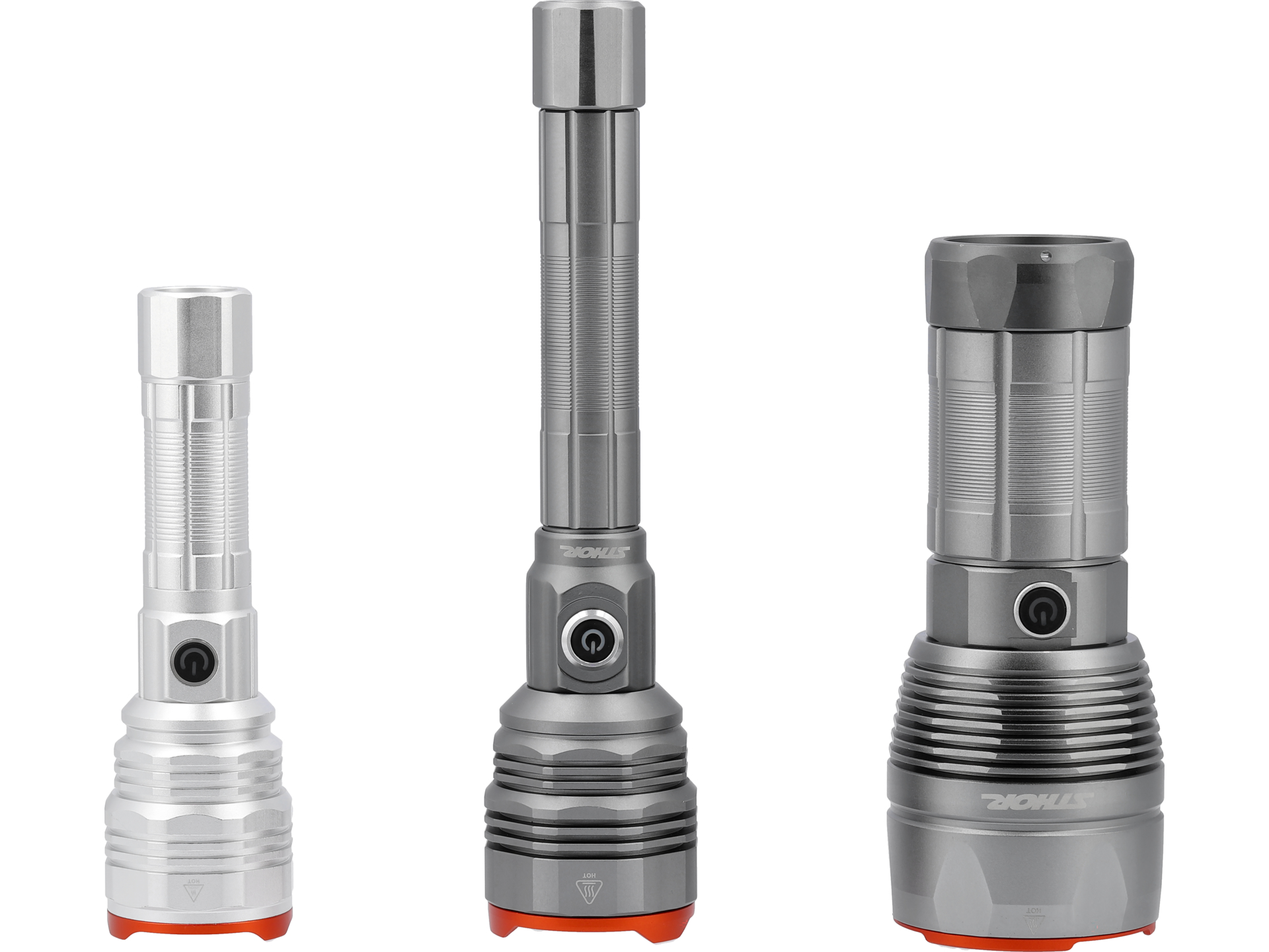 Latarka STHOR 88558 oferuje pięć trybów pracy dostosowanych do różnych scenariuszy użytkowania. Tryb turbo (14000 lm, 190 m) zapewnia maksymalną jasność przez 30 sekund – czas wystarczający do krótkotrwałego oświetlenia dużego obszaru lub sygnalizacji. Tryb wysoki (6000 lm, 145 m) działa przez 1.5 godziny i nadaje się do intensywnych prac wymagających mocnego światła.