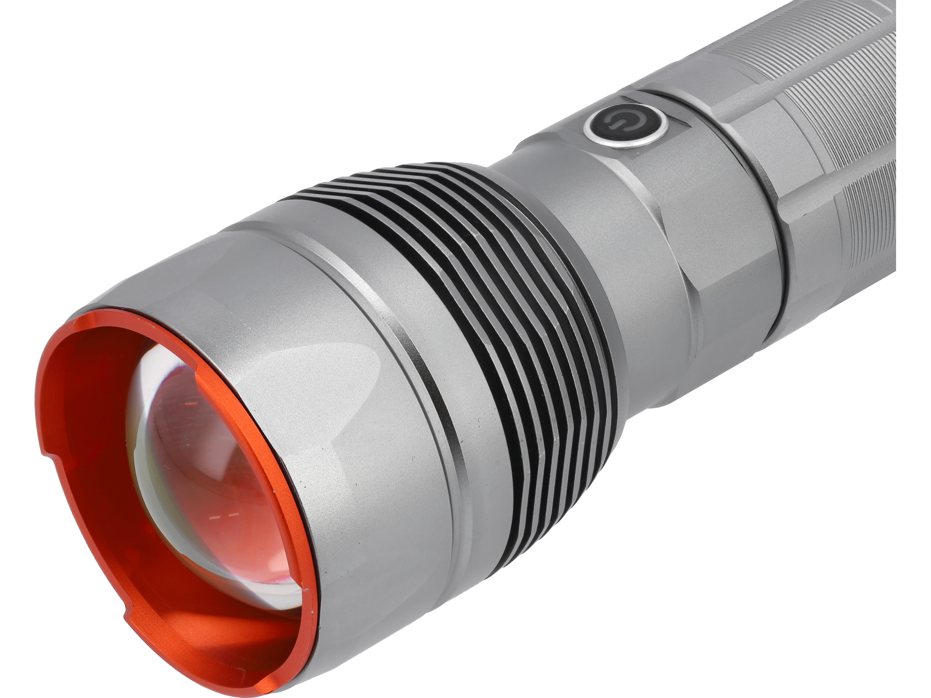 Aluminiowa latarka LED z technologią COB o mocy 210W i strumieniu świetlnym do 14000 lumenów. Wyposażona w akumulator Li-Ion oraz funkcję power bank 7800 mAh do ładowania urządzeń mobilnych. Pięć trybów pracy, zasięg do 190 metrów, wodoodporność IPX4.