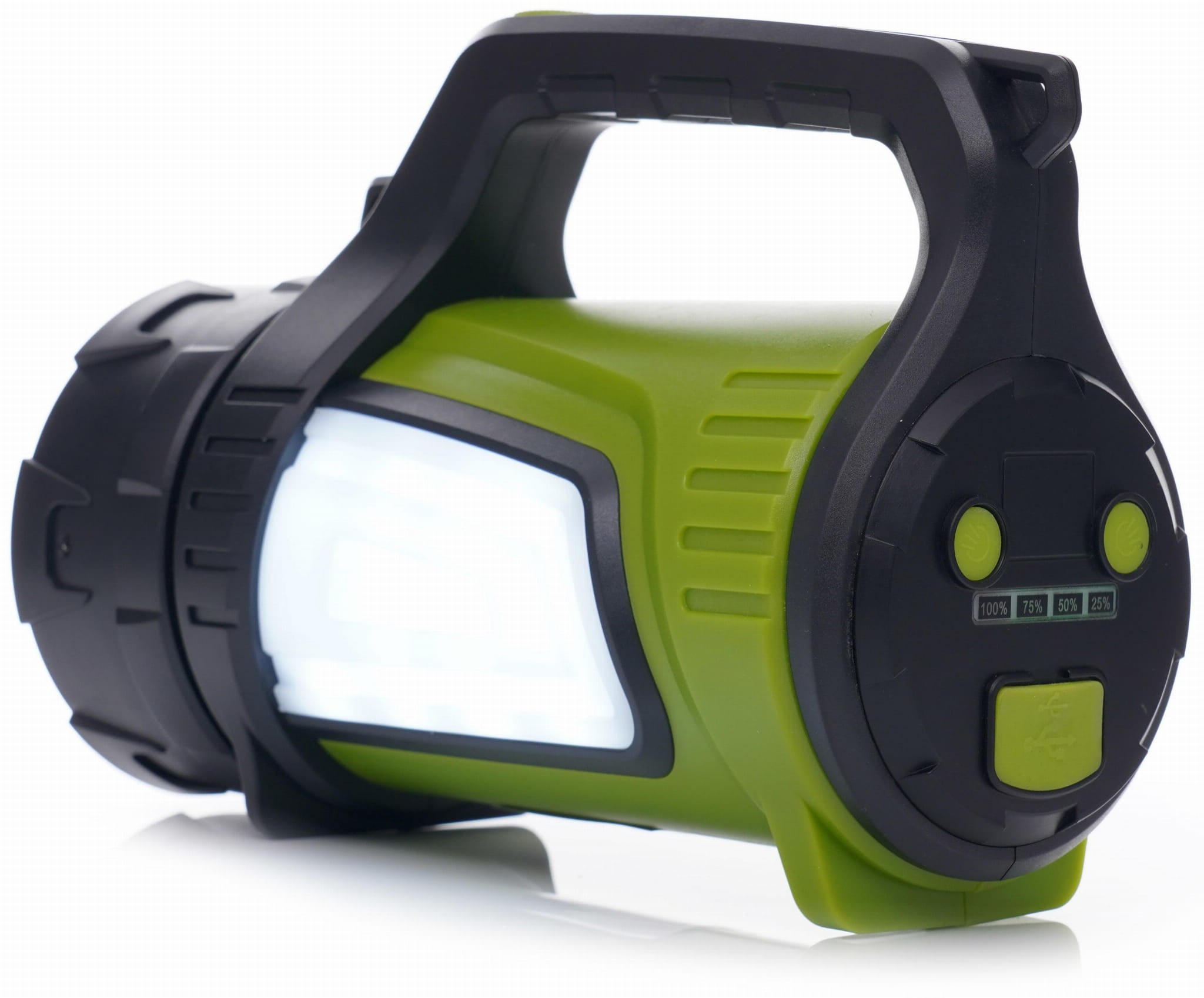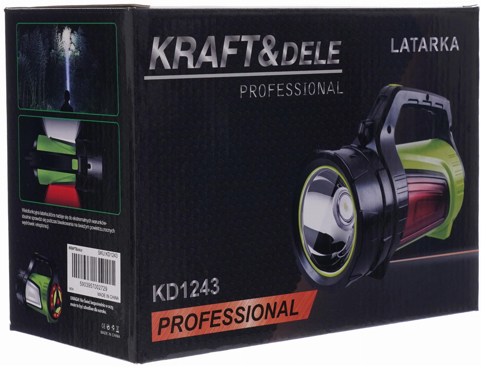 KD1243 to latarka akumulatorowa typu szperacz z emisją światła 1200 lumenów i zasięgiem do 800 metrów. Urządzenie łączy funkcję dalekosiężnej latarki głównej z bocznymi panelami świetlnymi oraz wbudowanym powerbankiem, co czyni je użytecznym narzędziem zarówno w warunkach terenowych, jak i podczas awarii zasilania.