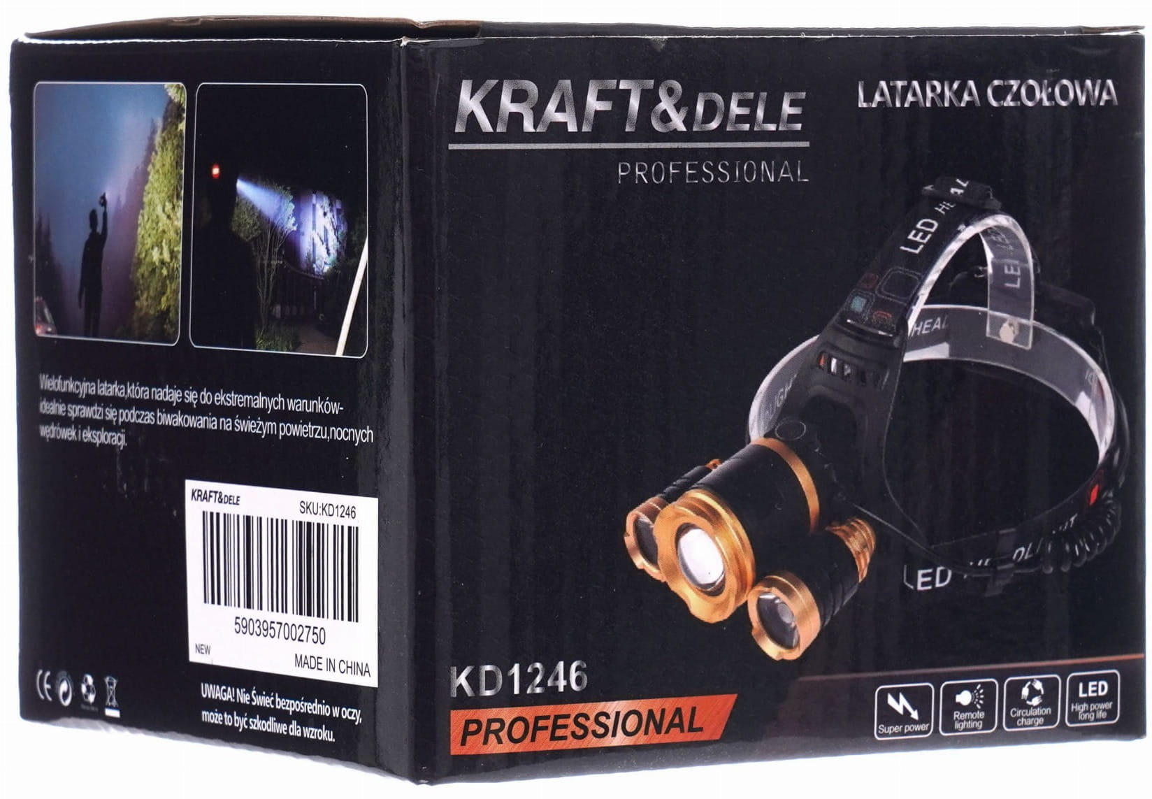 Czołówka LED KD1246 marki KRAFT&DELE to latarka montowana na głowie, wyposażona w układ trzech diod (1× T6 LED i 2× Q5 LED), zasilana akumulatorami 18650. Przeznaczona do pracy w wymagających warunkach terenowych i warsztatowych — zapewnia oświetlenie bez angażowania rąk w czterech konfiguracjach trybu świecenia.