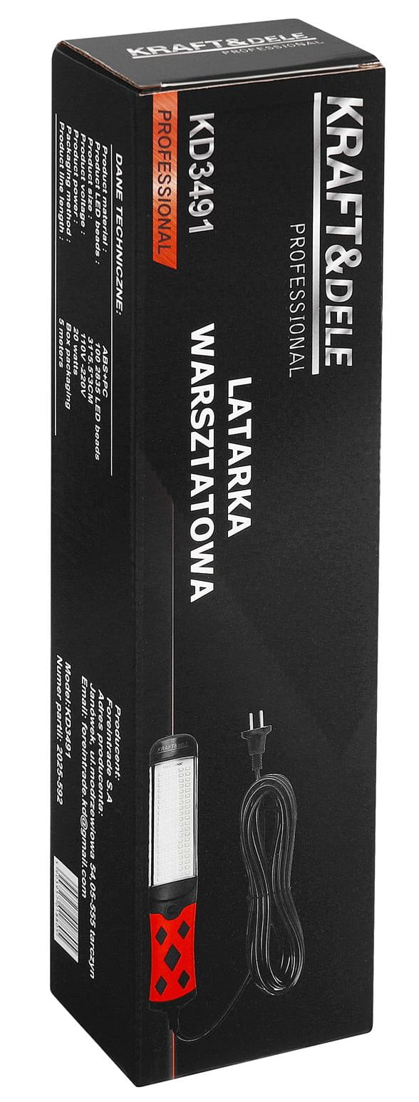 Latarka warsztatowa KD3491 to sieciowe źródło oświetlenia roboczego przeznaczone do pracy w garażu, warsztacie i innych miejscach wymagających równomiernego, intensywnego światła. Zastosowanie 100 diod LED SMD 2835 o łącznej mocy 20W zapewnia szeroką strefę oświetlenia przy niskim poborze energii w porównaniu do tradycyjnych źródeł światła o podobnej jasności.