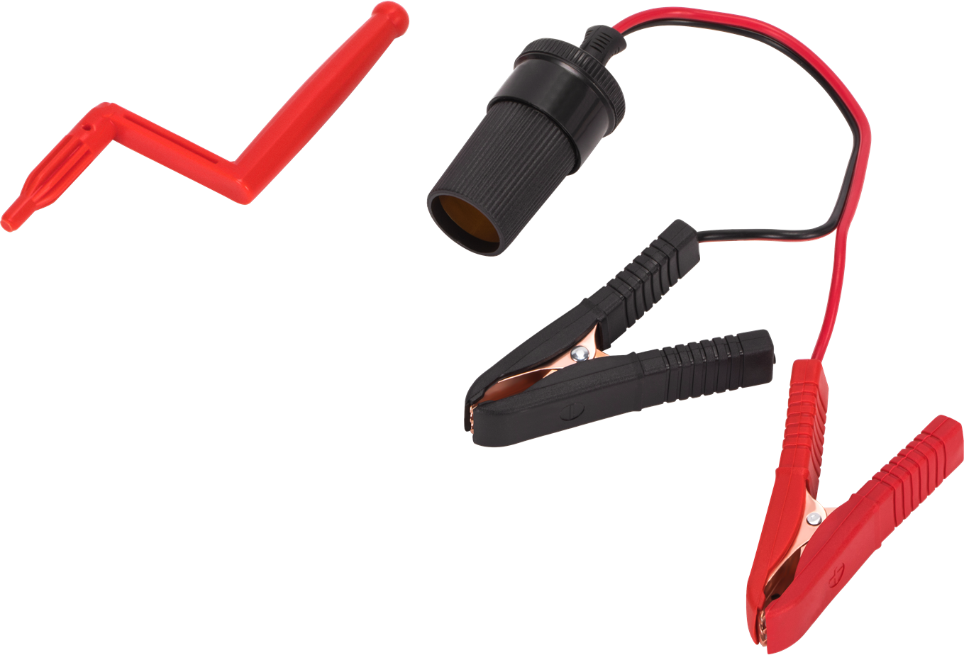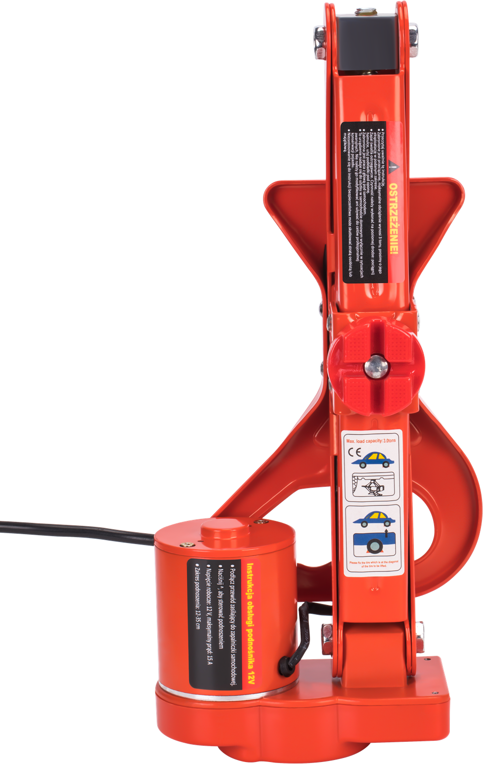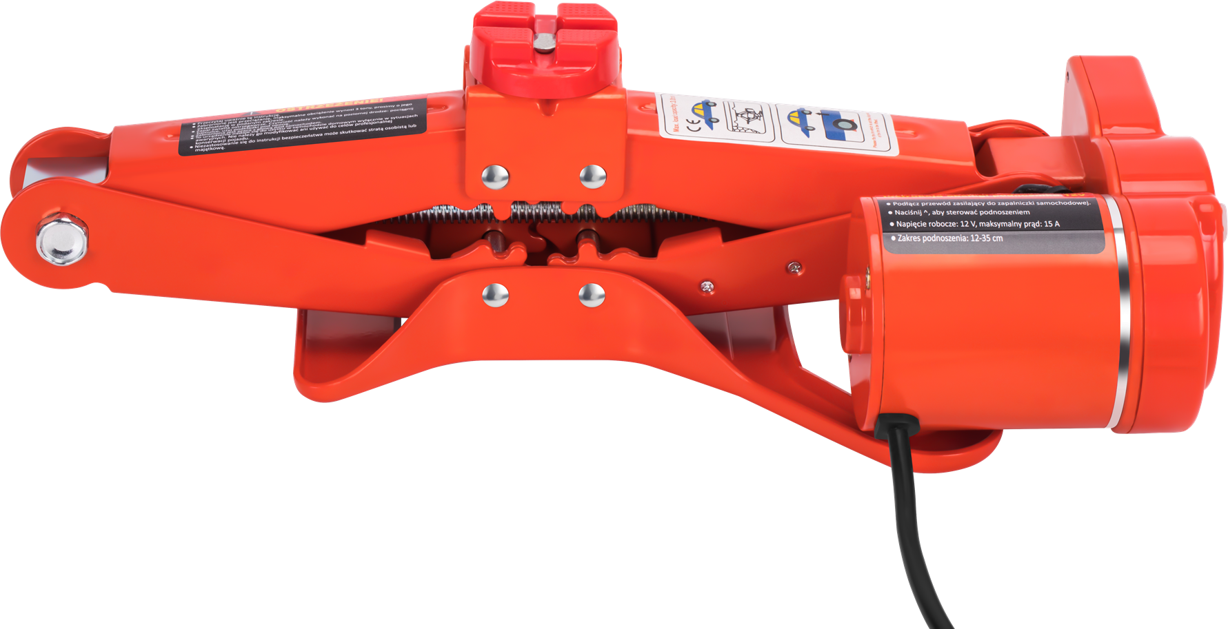 Podnośnik można zasilić z gniazda zapalniczki 12V (przewód w zestawie) lub bezpośrednio z akumulatora pojazdu za pomocą dołączonej przejściówki z zaciskami krokodylkowymi. Drugi sposób jest zalecany przy intensywniejszym użytkowaniu, ponieważ gniazdo zapalniczki bywa ograniczone do 10–15 A, a urządzenie pobiera znamionowo 15 A.