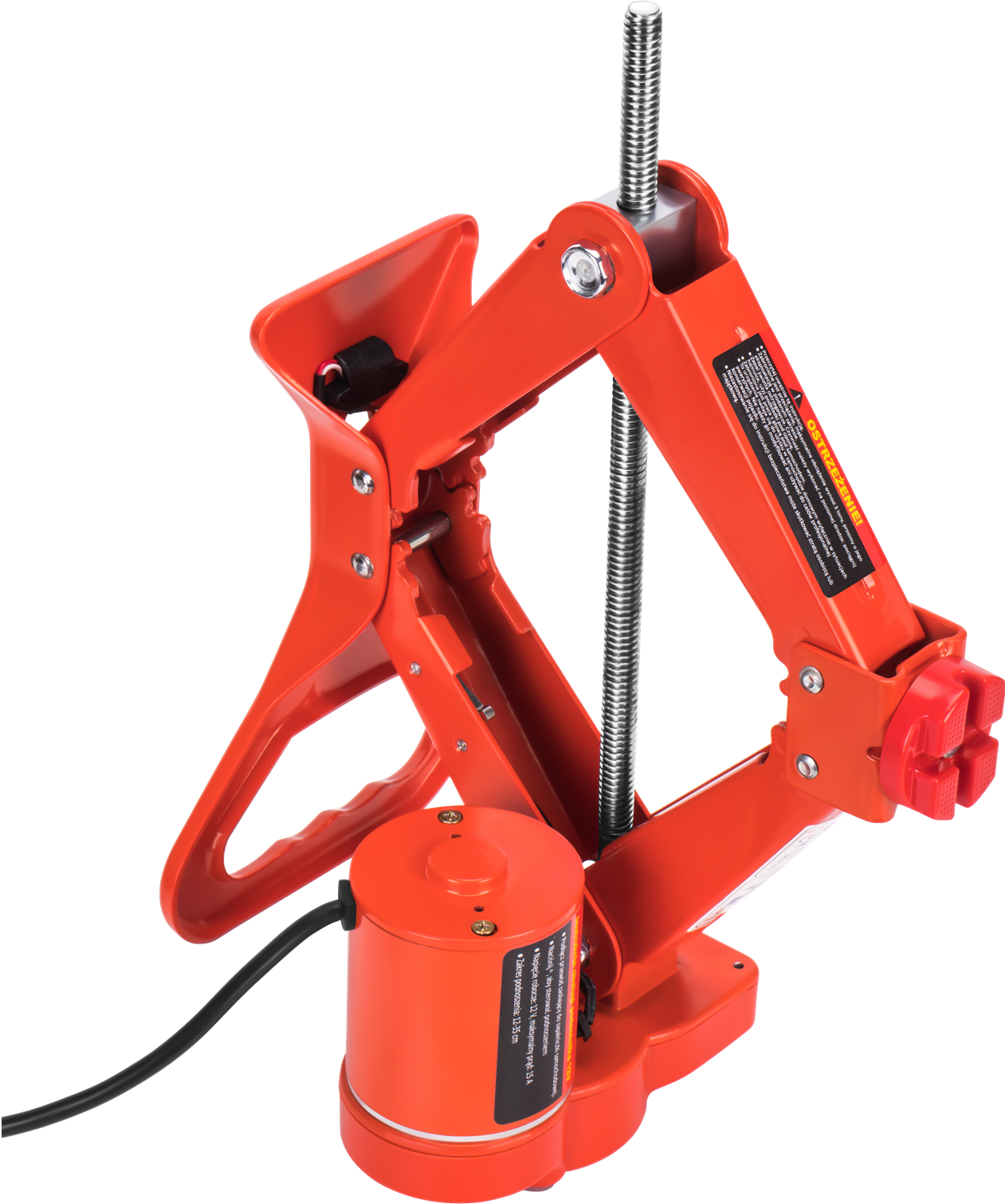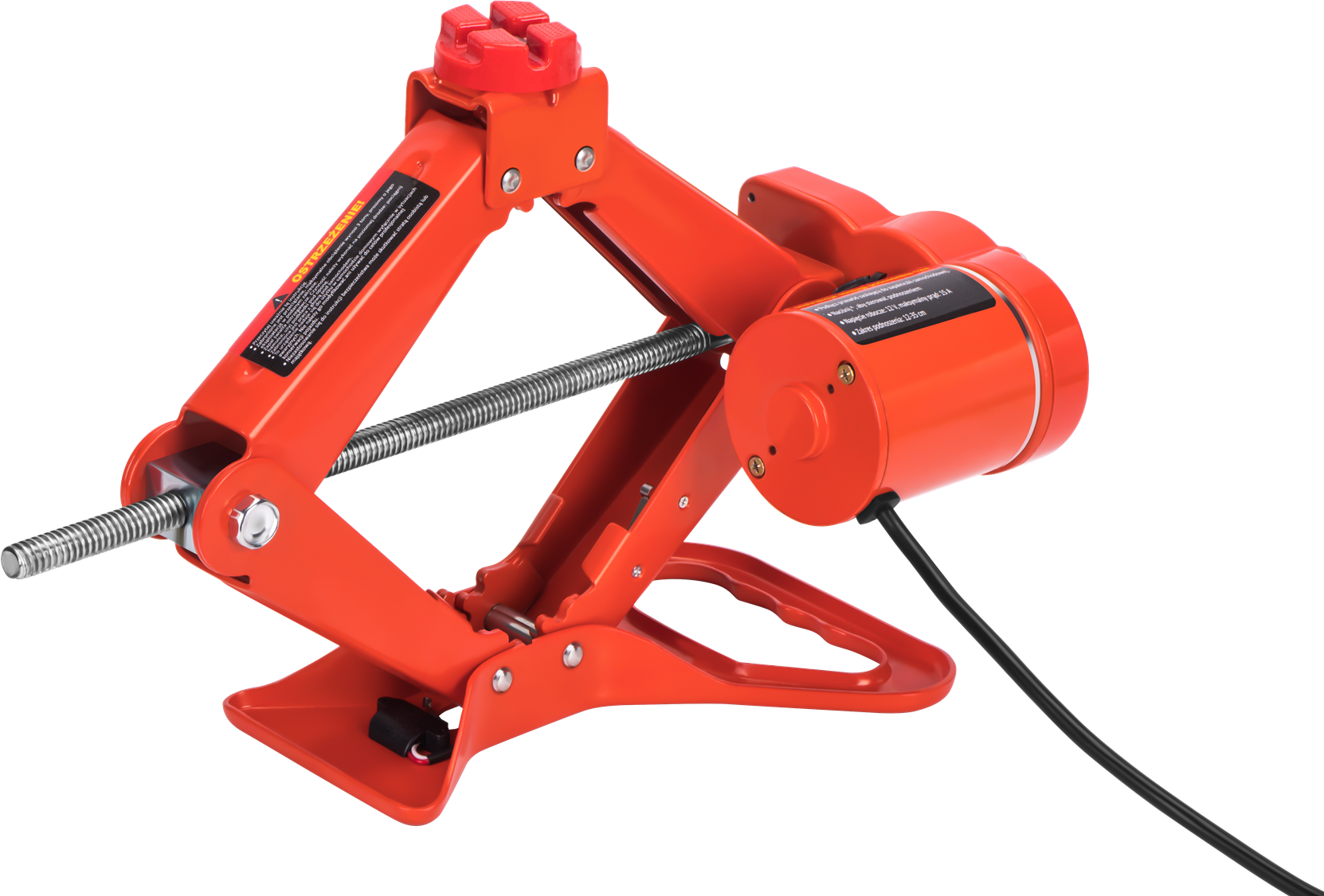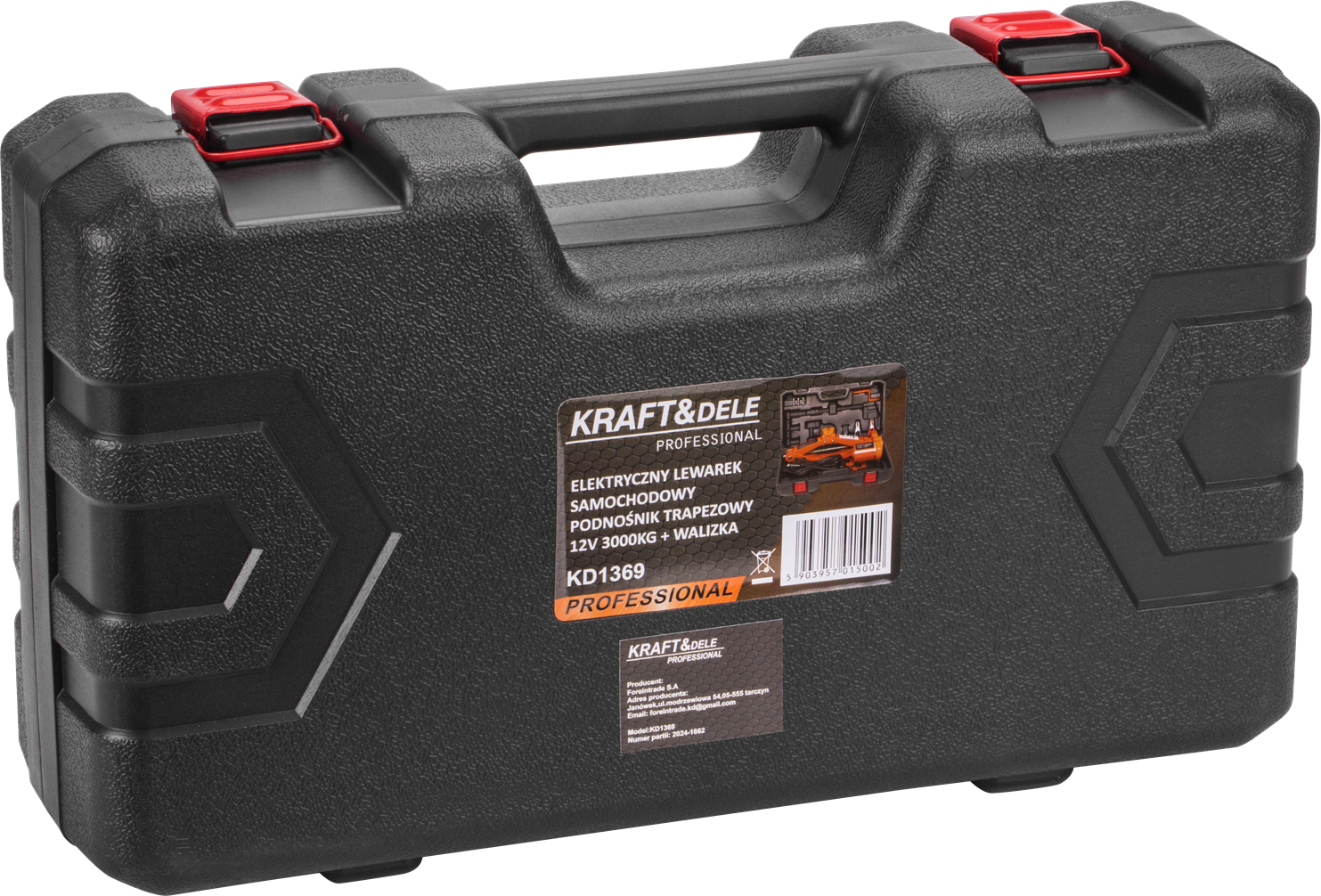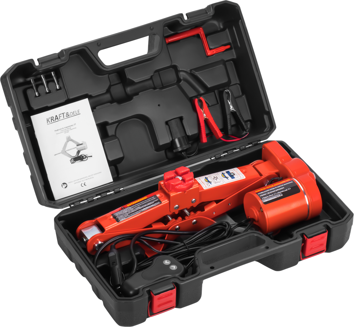 KD1369 to elektryczny podnośnik samochodowy o konstrukcji trapezowej (tzw. żaba), zasilany napięciem 12V. Urządzenie umożliwia unoszenie i opuszczanie pojazdu za pomocą pilota sterującego bez konieczności ręcznego pompowania. Przeznaczony do samochodów osobowych i lekkich dostawczych — kompletny zestaw dostarczany jest w walizce transportowej.