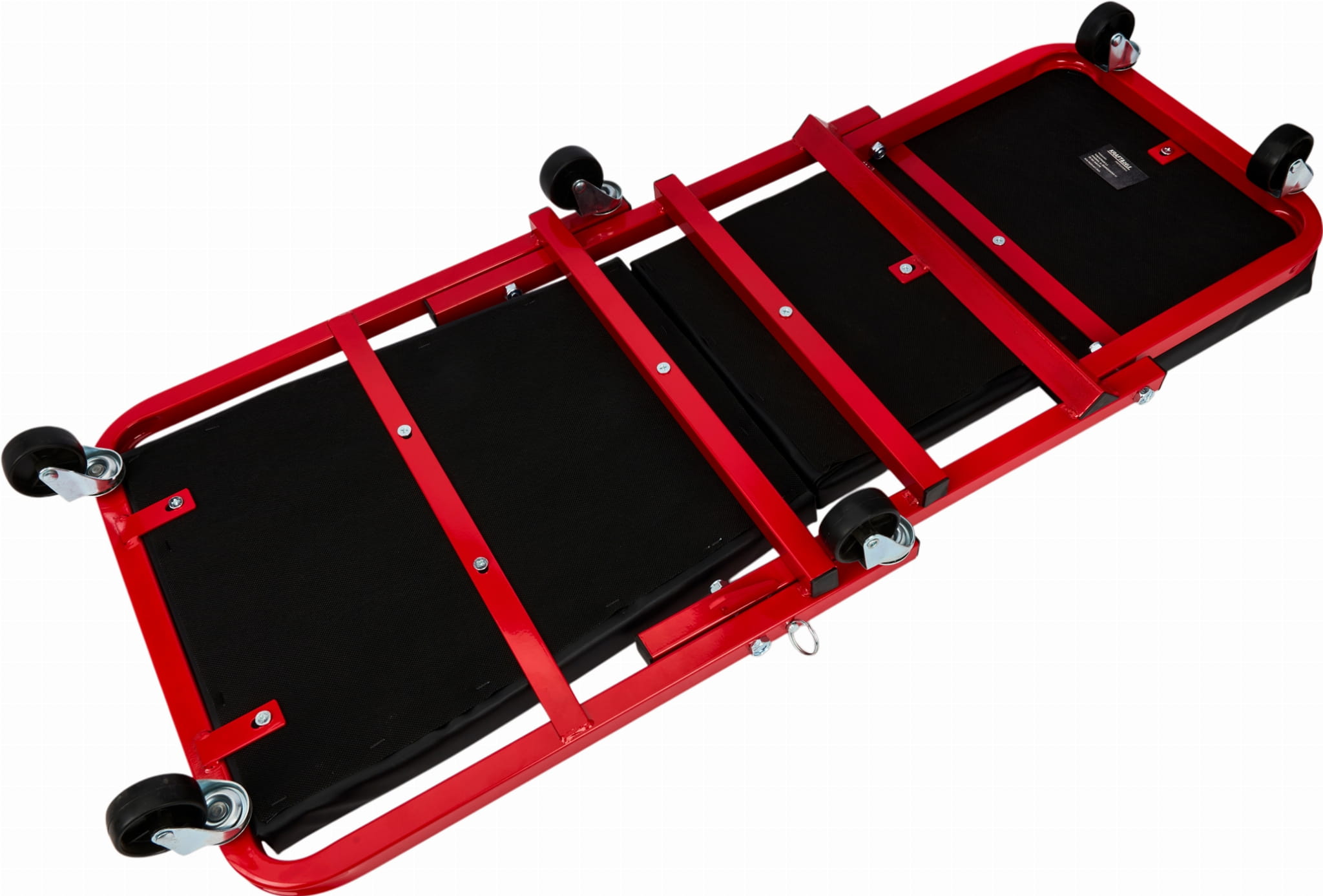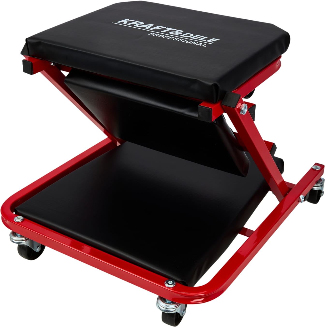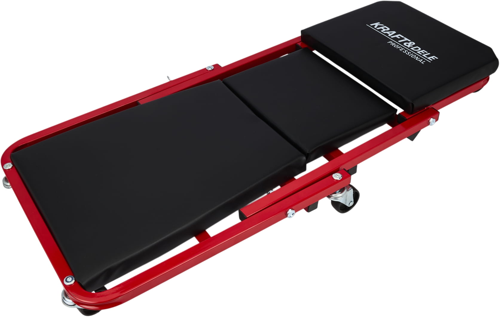 Konstrukcja pozwala na przełączenie między trybem leżanki (910 × 410 × 120 mm) a siedziskiem (460 × 410 × 360 mm) bez użycia narzędzi. Blokada mechaniczna zabezpiecza przed przypadkowym złożeniem podczas pracy — istotne zwłaszcza przy pracy w pozycji leżącej pod pojazdem.