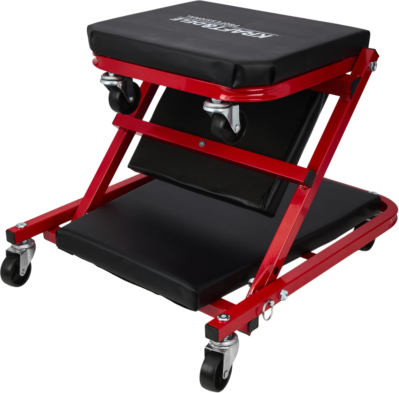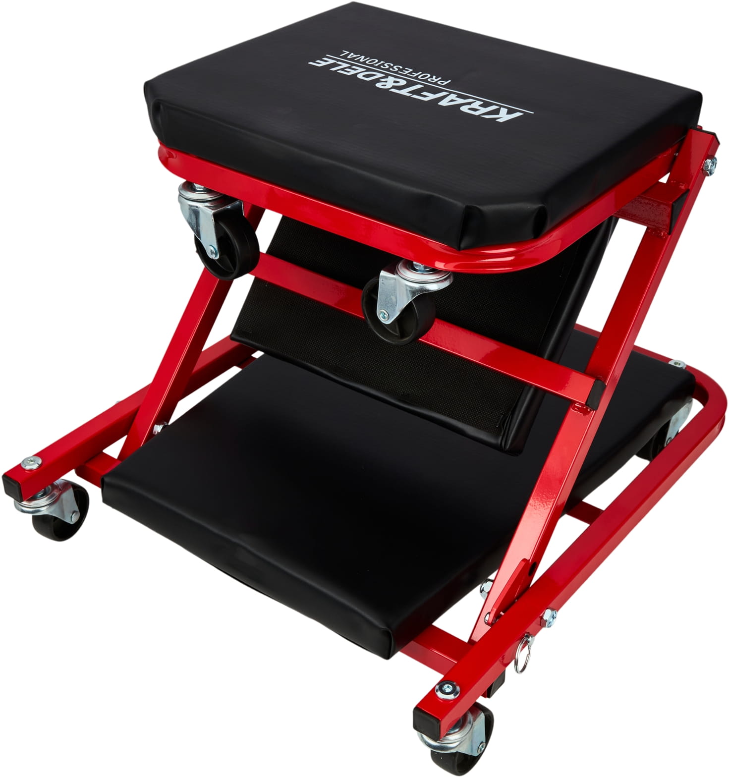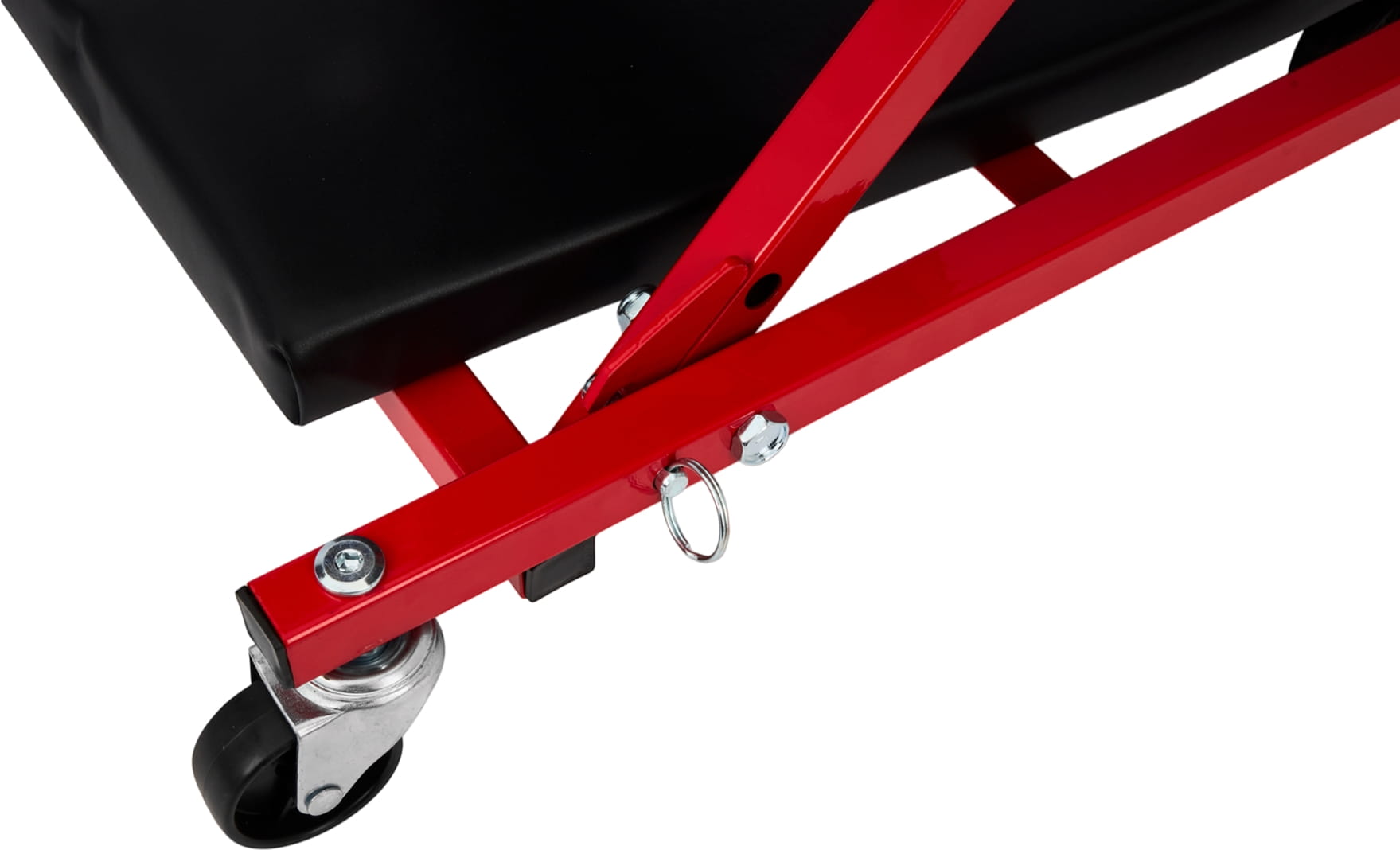 Konstrukcja pozwala na przełączenie między trybem leżanki (910 × 410 × 120 mm) a siedziskiem (460 × 410 × 360 mm) bez użycia narzędzi. Blokada mechaniczna zabezpiecza przed przypadkowym złożeniem podczas pracy — istotne zwłaszcza przy pracy w pozycji leżącej pod pojazdem.