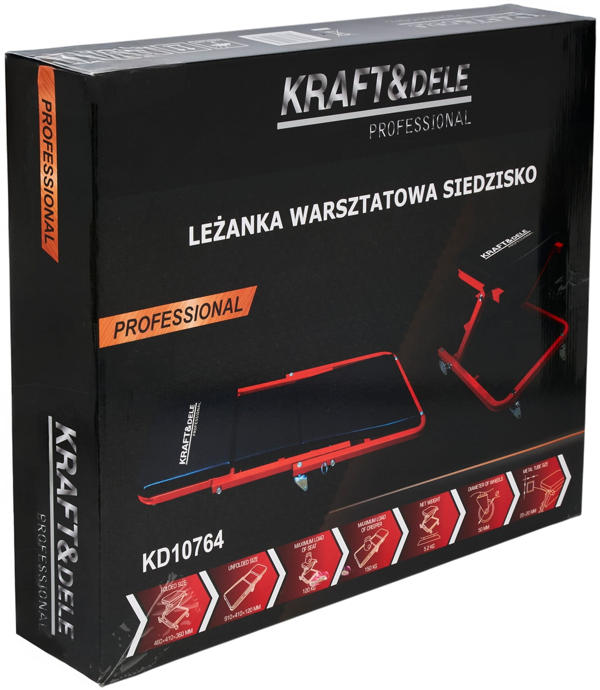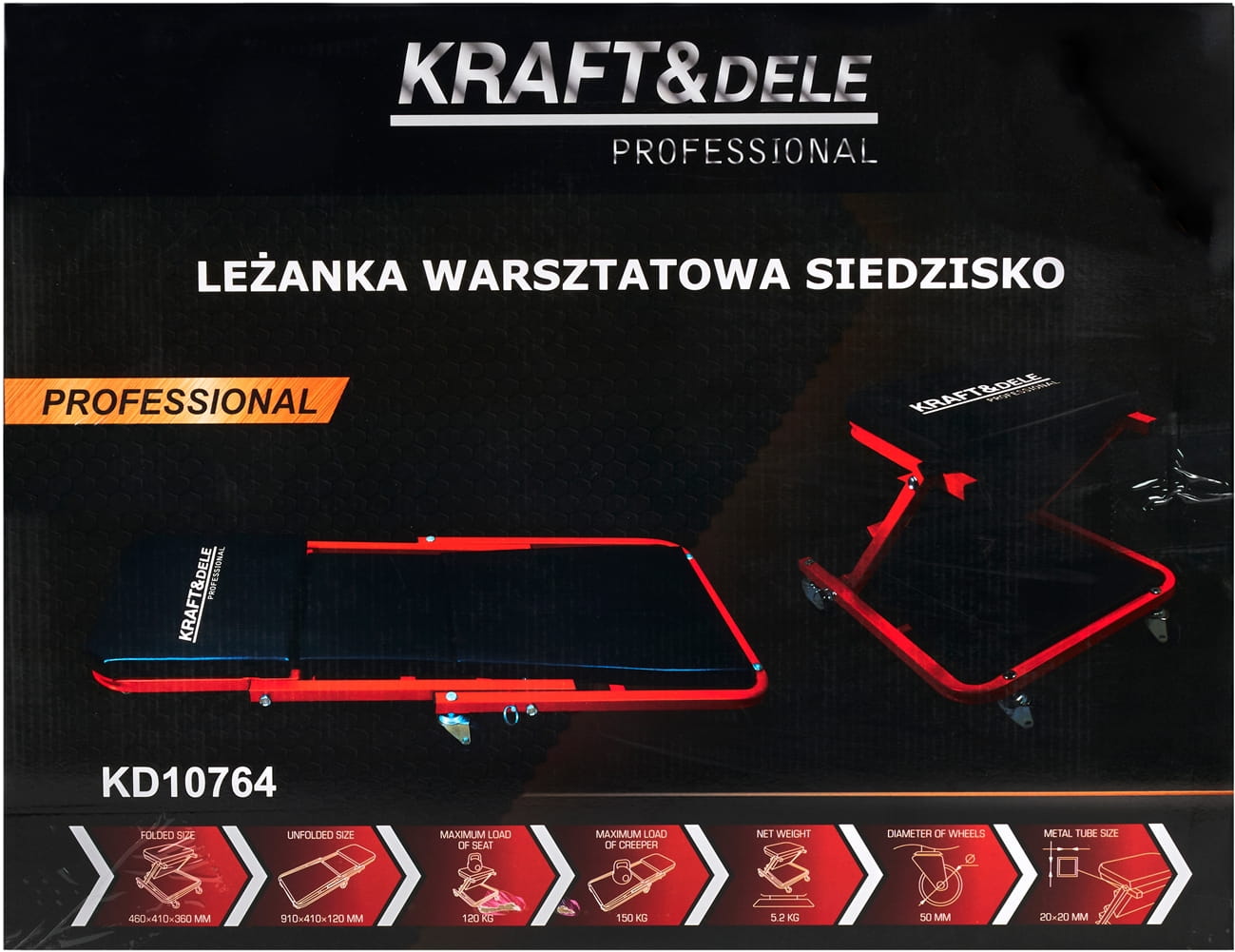 KD10764 to narzędzie warsztatowe łączące funkcję leżanki i siedziska w jednej konstrukcji. Przeznaczone do prac przy pojazdach wymagających dostępu od spodu — umożliwia wygodną pracę zarówno w pozycji leżącej pod autem, jak i w pozycji siedzącej przy niskich elementach podwozia lub kół.