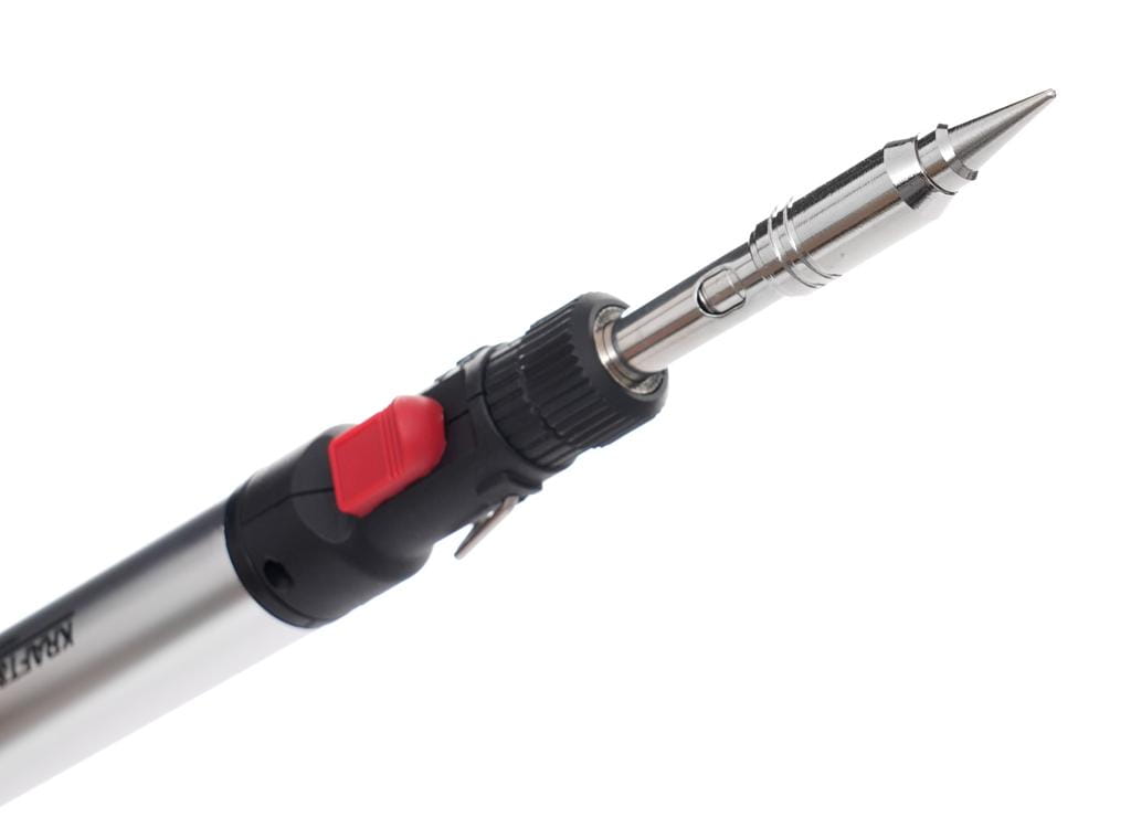 Zmiana funkcji odbywa się przez wymianę końcówki roboczej. Grot lutowniczy zapewnia precyzyjne lutowanie, dysza opalarki kieruje strumień gorącego powietrza, a dysza palnika wytwarza otwarty płomień do prac wymagających wysokiej temperatury.