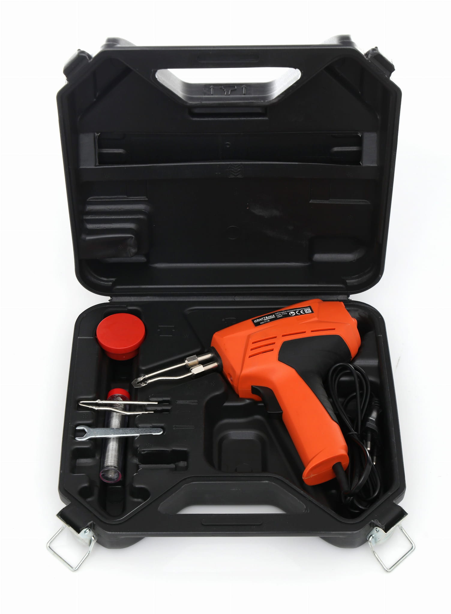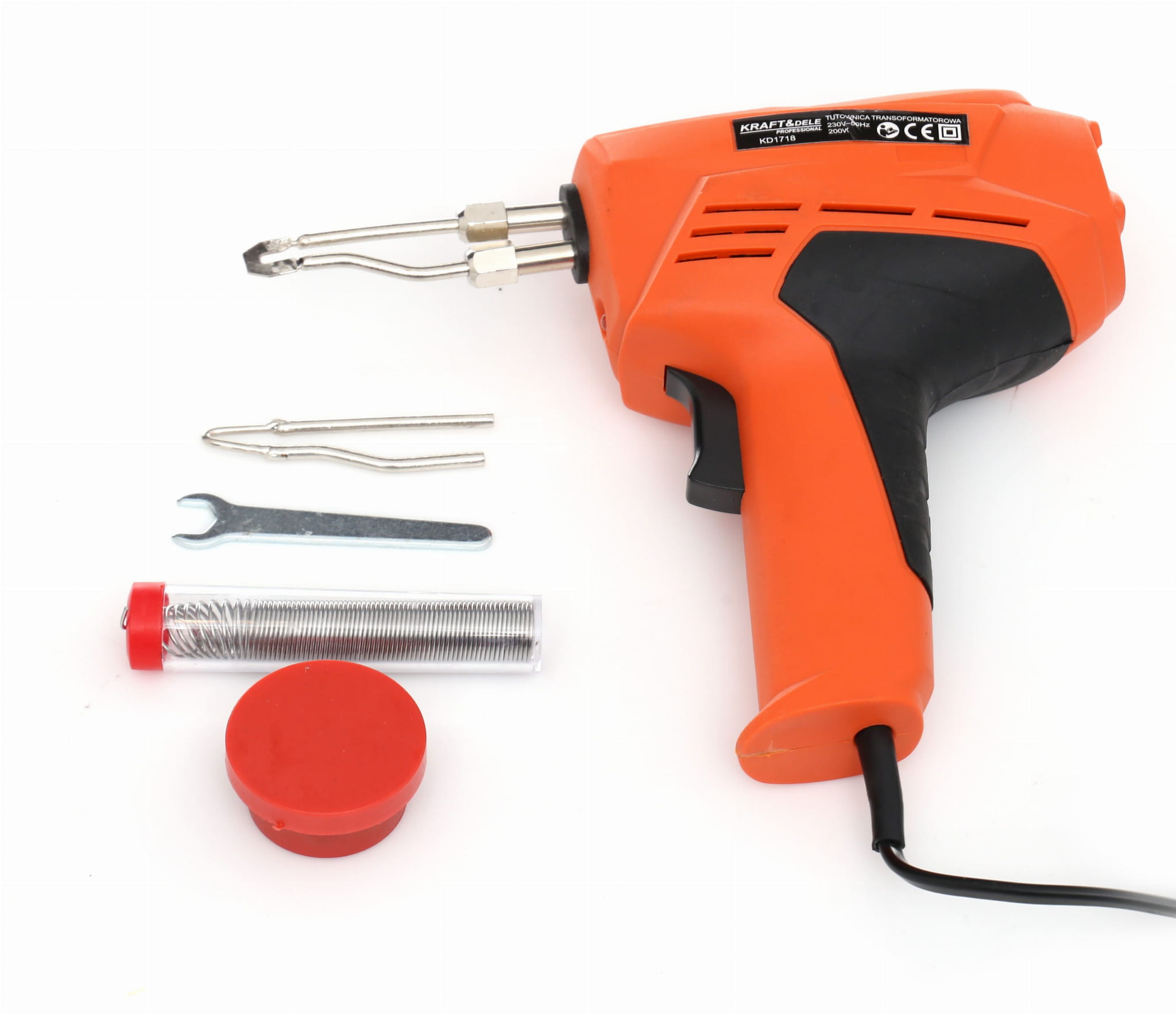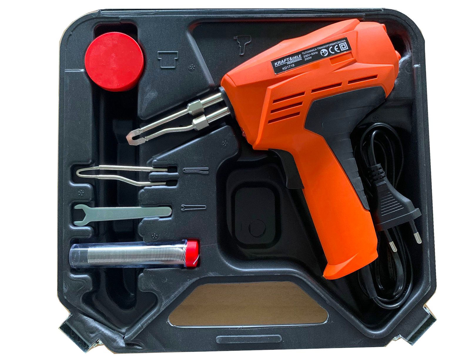 Lutownica pistoletowa 200W, cyna w pojemniczku, kalafonia, zapasowy grot, klucz do wymiany grotu, walizka transportowa.