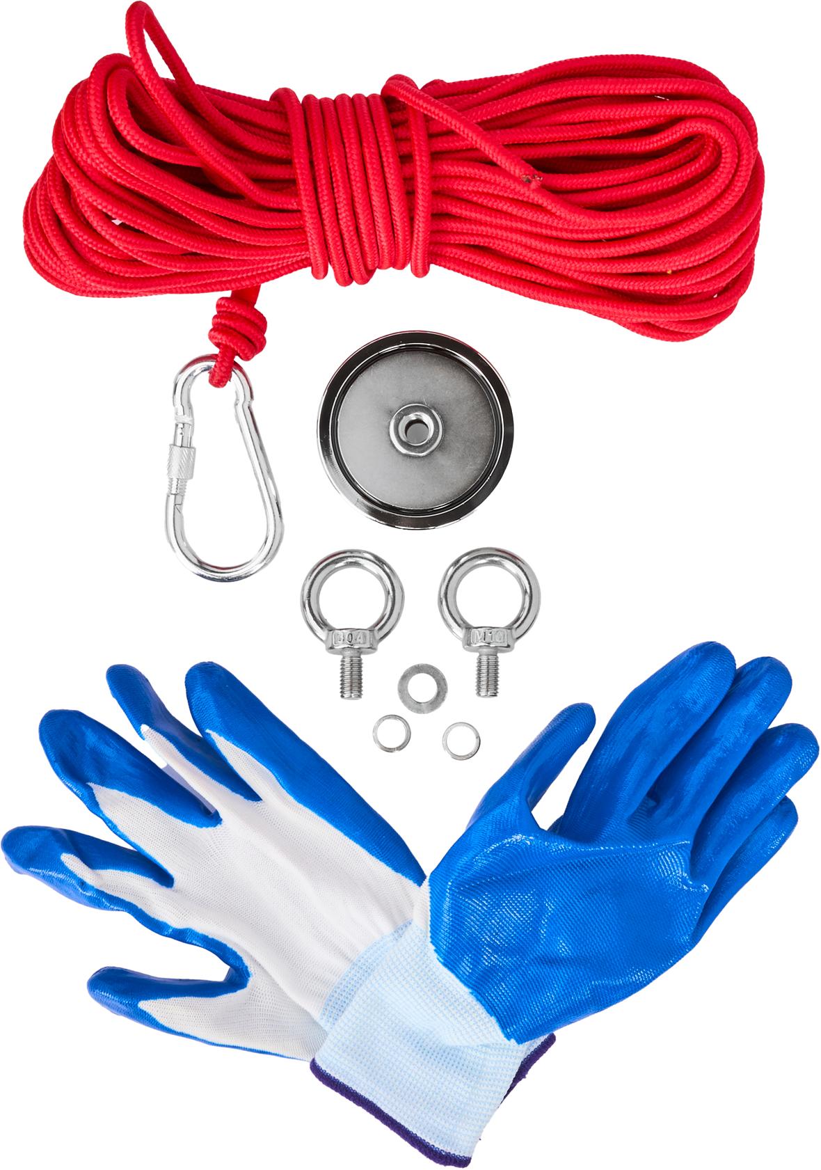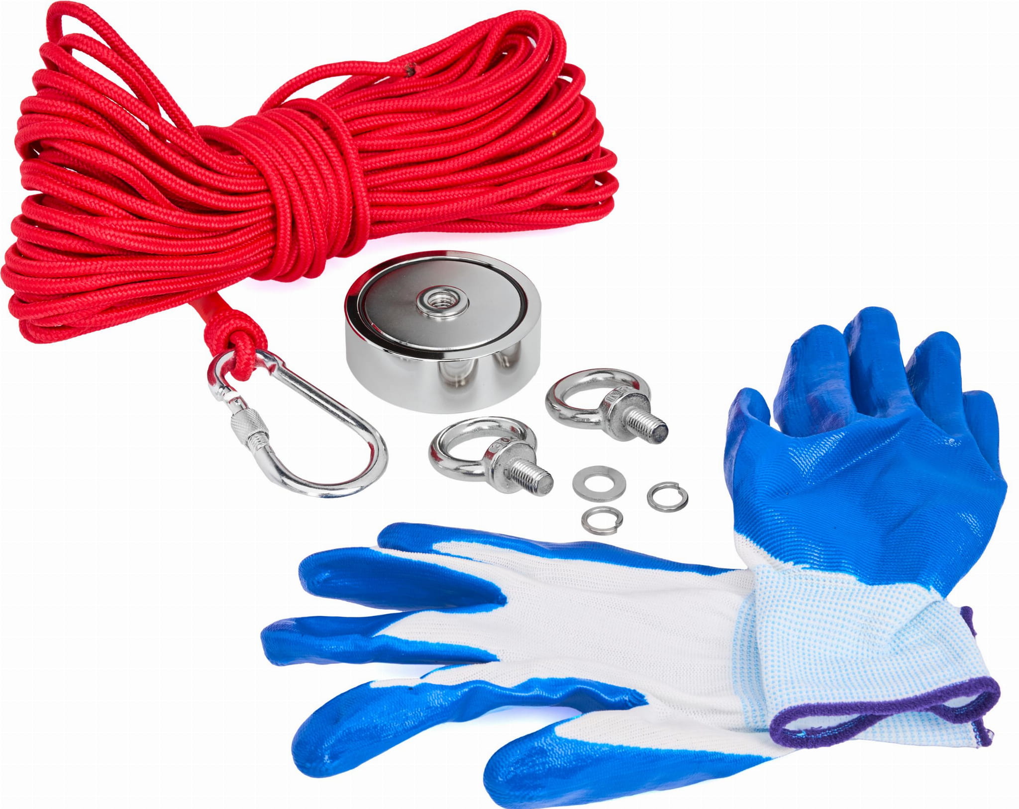 KD10416 to magnes neodymowy wykonany ze stopu neodymu, żelaza i boru (NdFeB) z maksymalnym udźwigiem 240 kg. Zestaw obejmuje linę o długości 20 m, karabińczyk oraz parę rękawiczek ochronnych — kompletne wyposażenie do poszukiwań magnetycznych i prac technicznych wymagających podnoszenia ciężkich stalowych elementów.