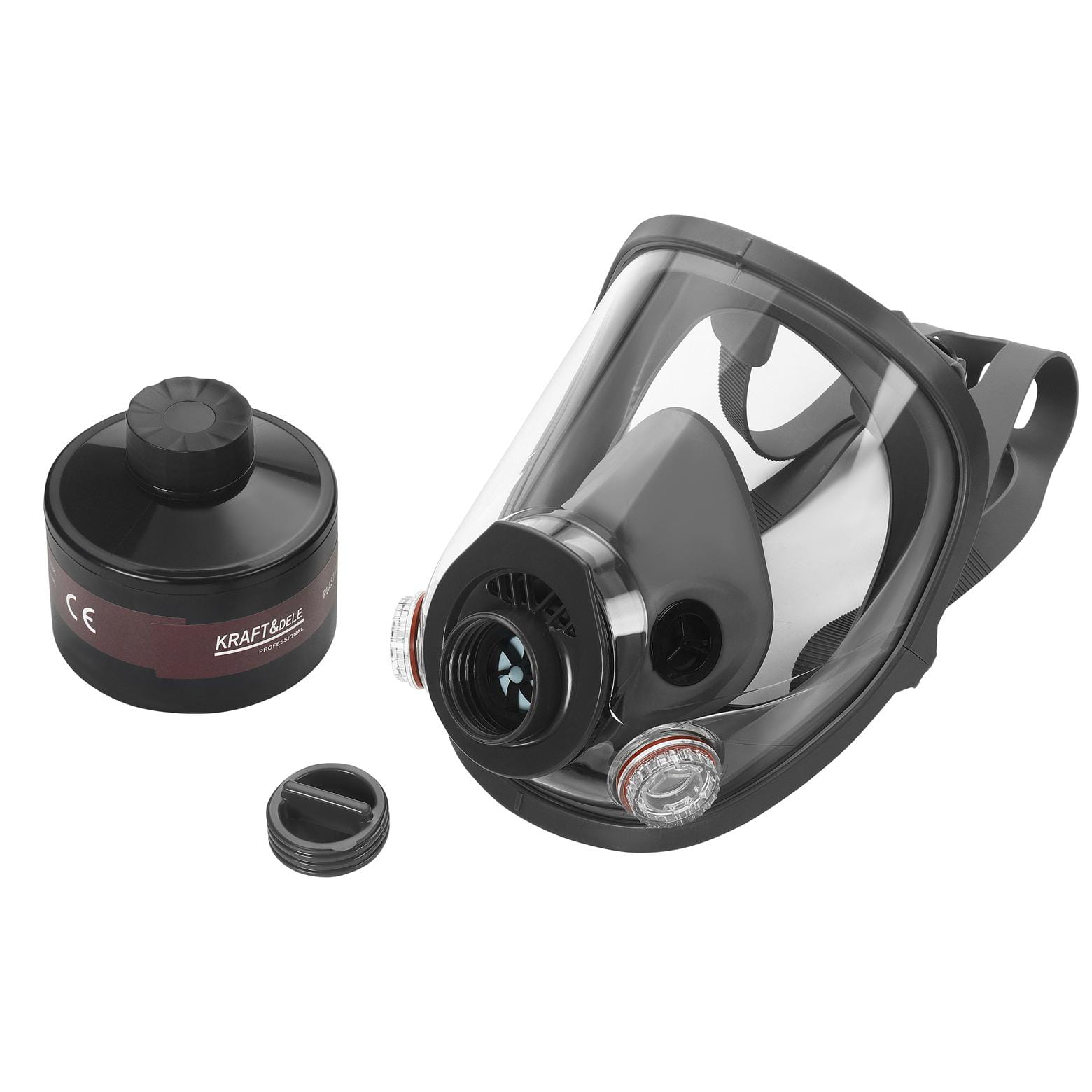 Maska pełnotwarzowa KD10031 (rozmiar M) — 2x filtry gazowe — 6x filtry przeciwpyłowe — 2x wkładki — 2x okrągłe filtry — 1x pojemnik z filtrem gazowym 40 mm — instrukcja obsługi w języku polskim — oryginalne opakowanie