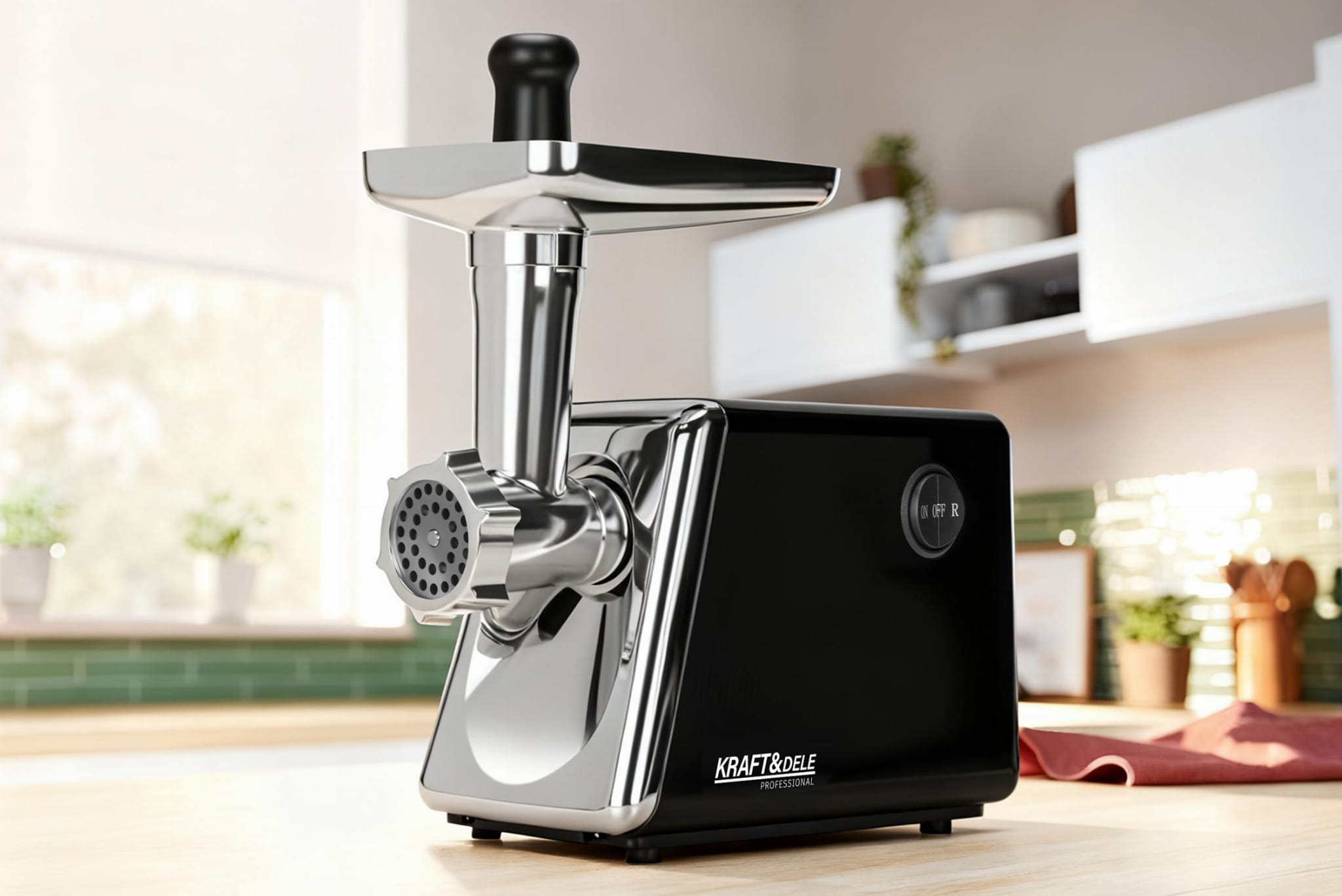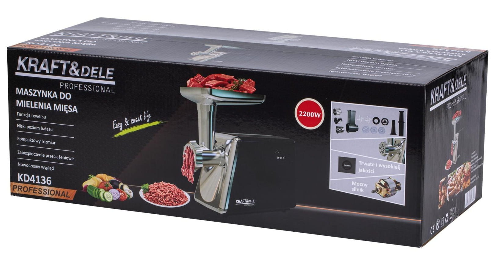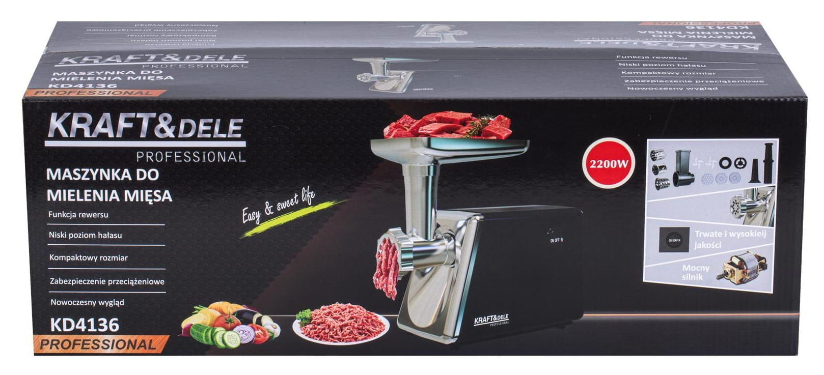 KD4136 to elektryczna maszynka do mielenia mięsa z silnikiem o mocy nominalnej 2000 W, wyposażona w trzy wymienne dyski, dwa noże tnące, akcesoria masarskie oraz szatkownicę z trzema bębnami. Urządzenie obsługuje dwa tryby pracy i funkcję rewersu, co umożliwia sprawne mielenie różnych rodzajów surowców bez przerywania procesu.