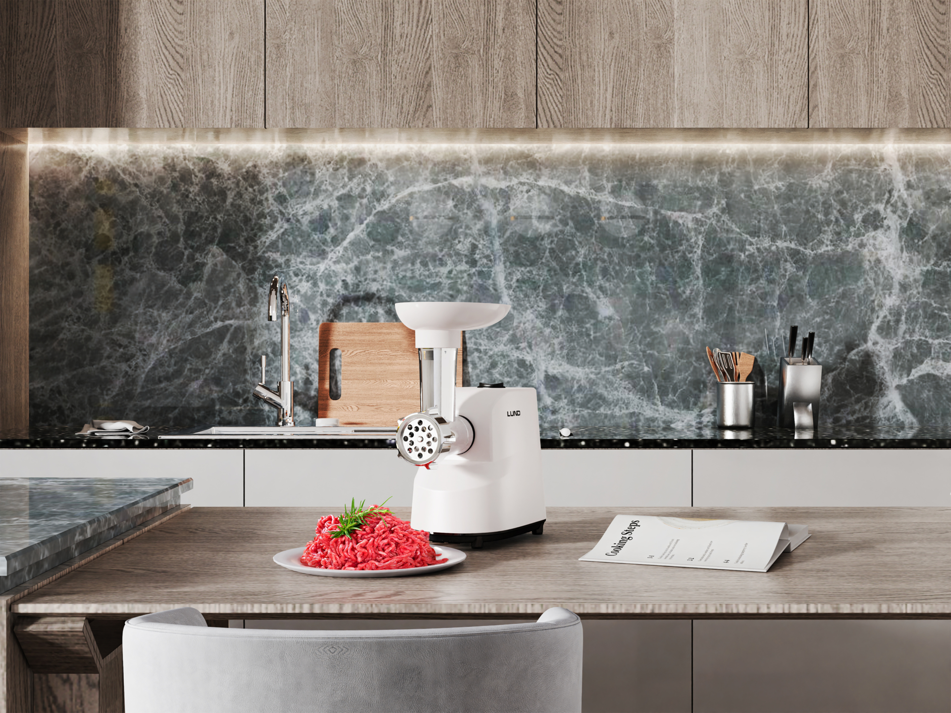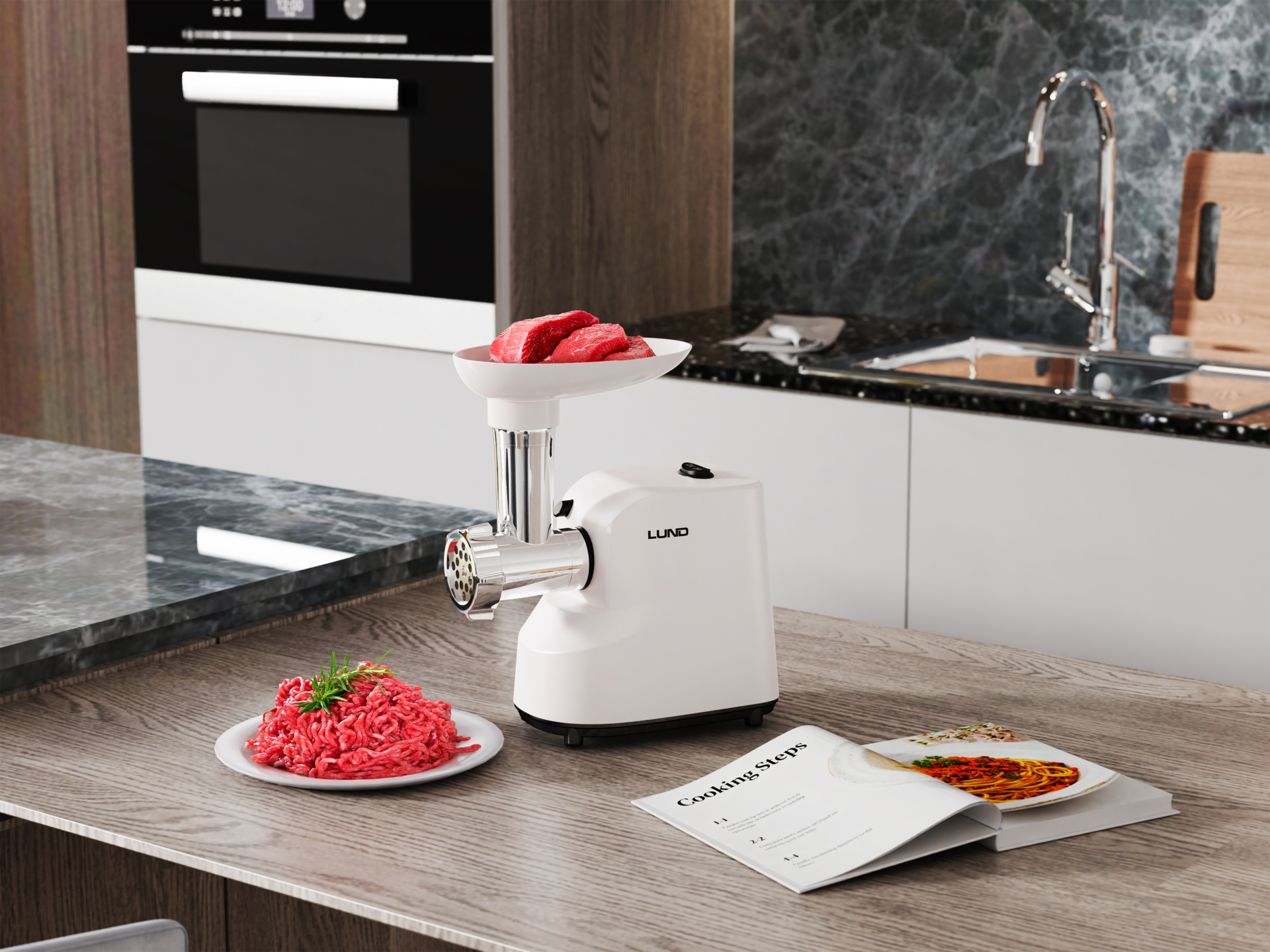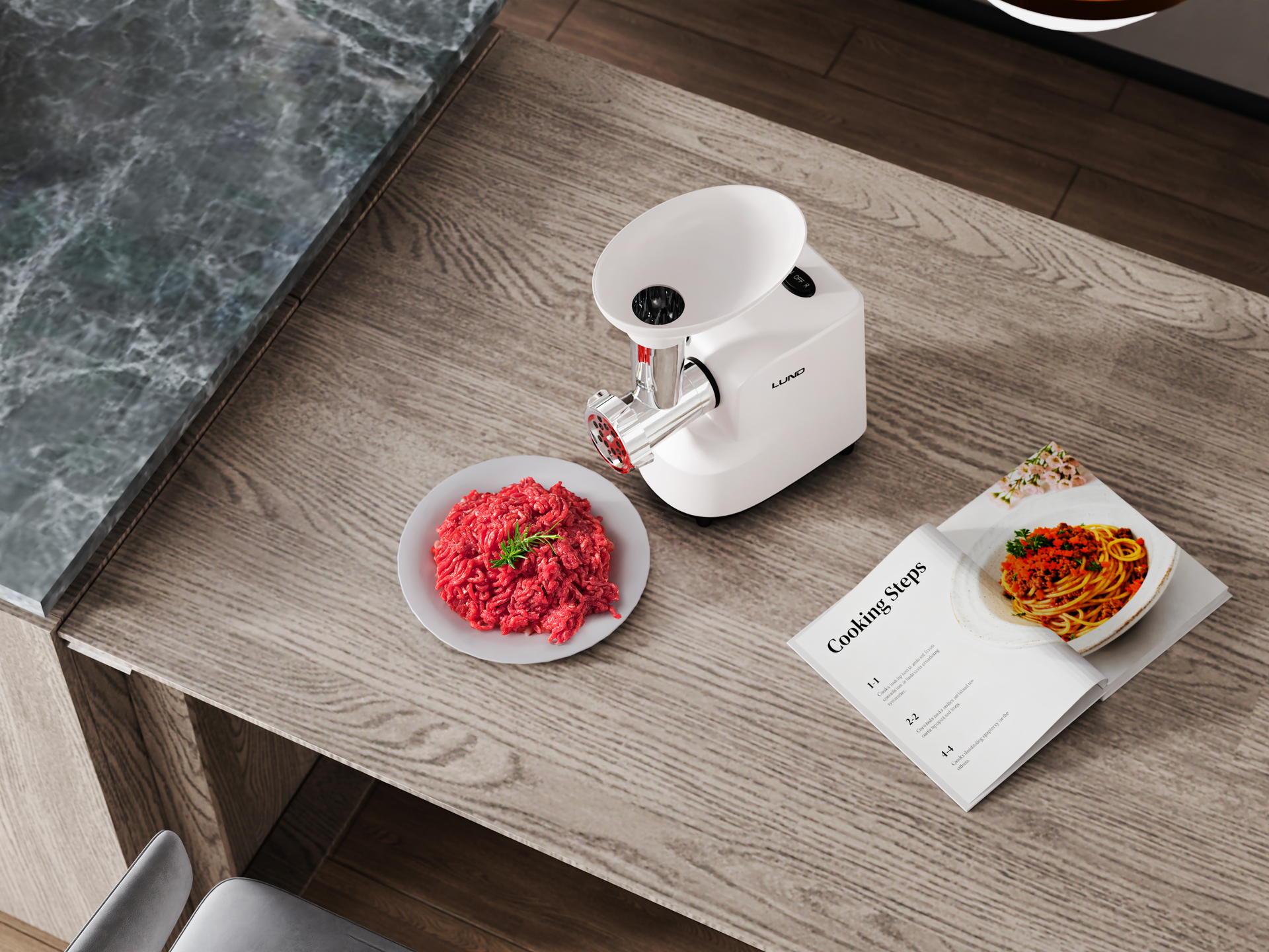 Elektryczna maszynka do mielenia mięsa z silnikiem AC 7625 CCA o mocy nominalnej 350W i szczytowej 1000W. Urządzenie przetwarza 2-3 kg mięsa na minutę, wyposażone w ostrze ze stali nierdzewnej SUS420 oraz dwie tarcze mielące 5 mm i 7 mm. Konstrukcja z zabezpieczeniami termicznymi i funkcją biegu wstecznego.