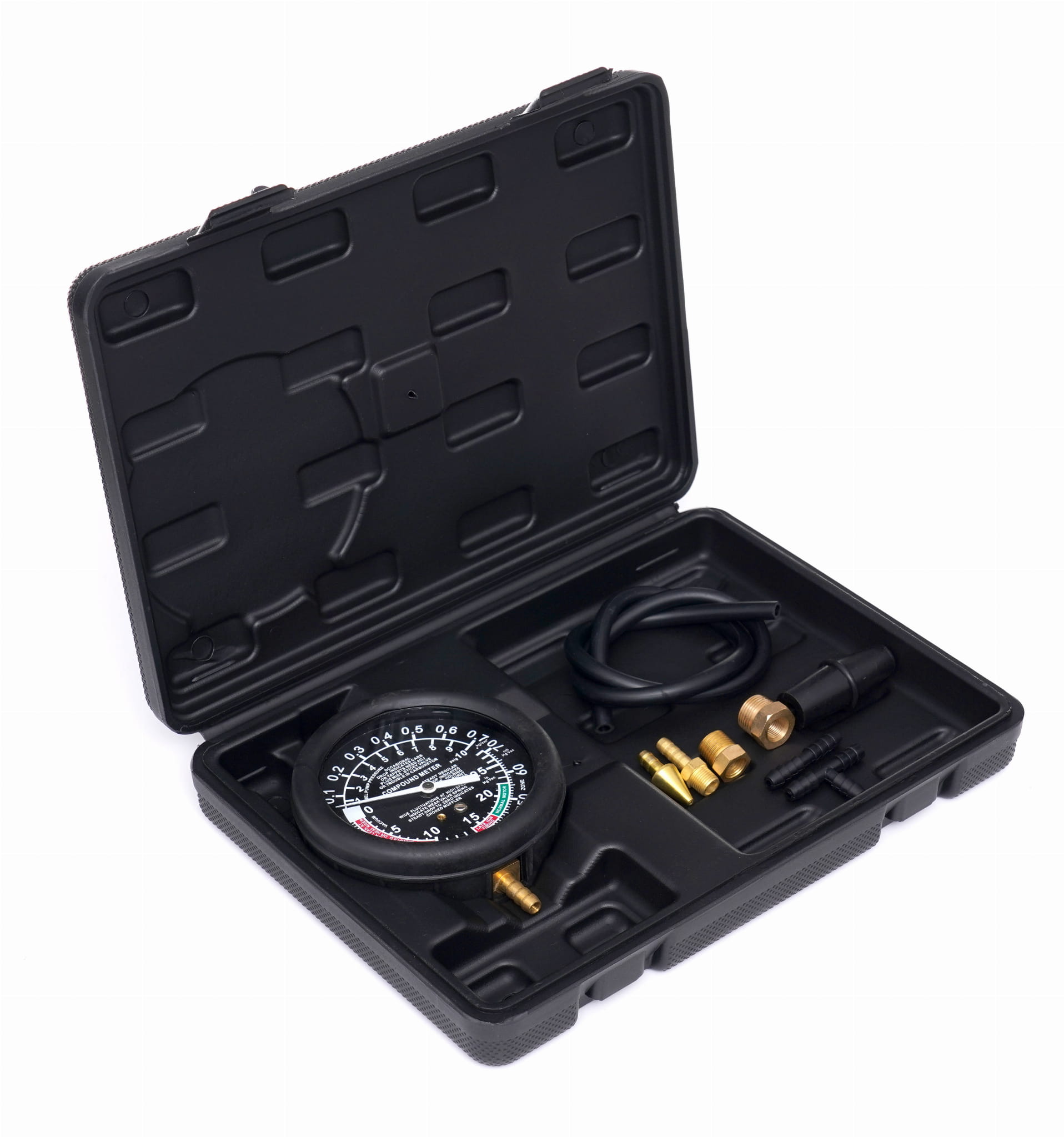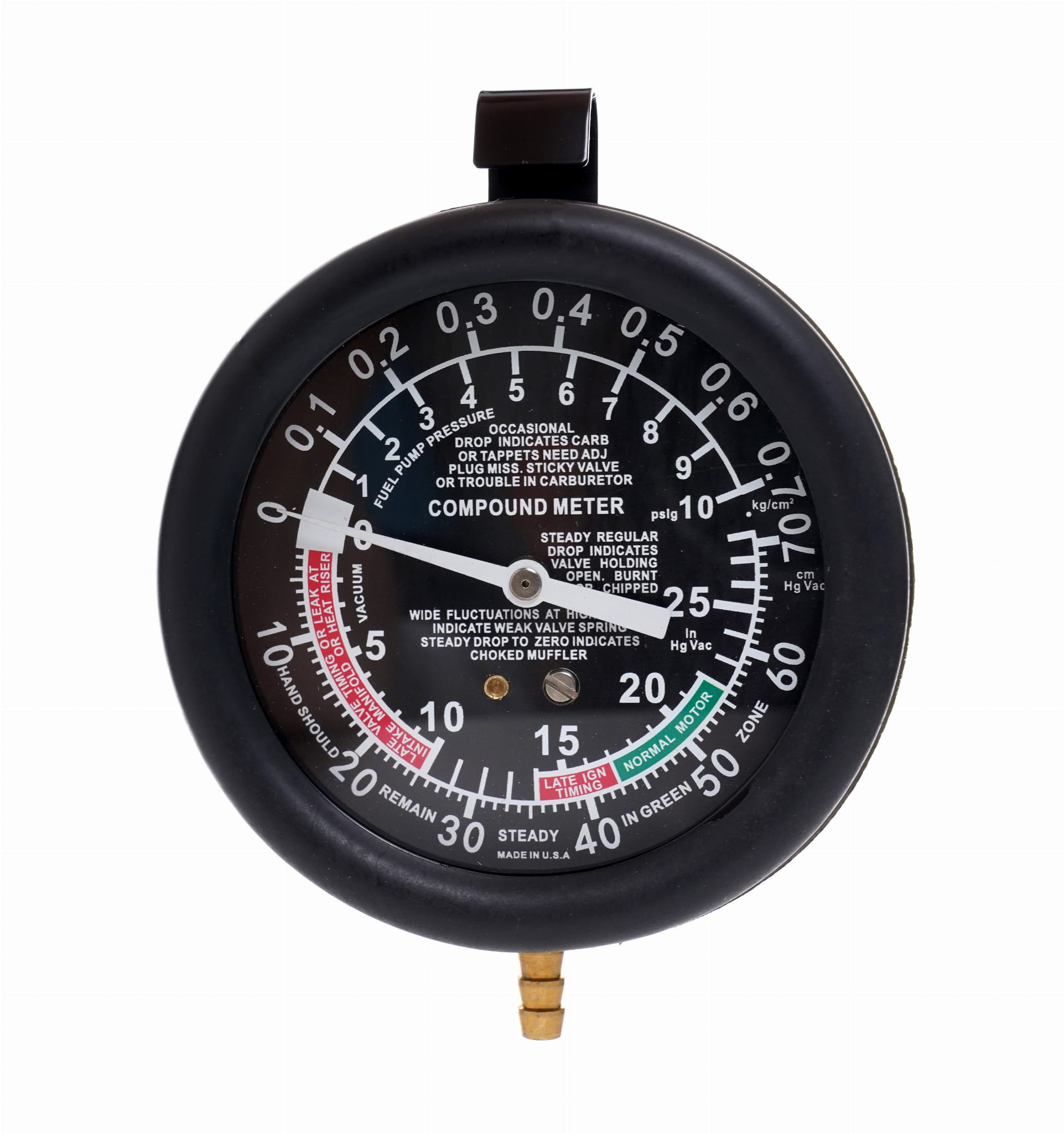 Miernik obsługuje zarówno pomiar ciśnienia (0–10 PSI / 0–0,7 kg/cm²), jak i podciśnienia (0–28 inHg / 0–70 cmHg) na jednej tarczy. Pozwala to na przeprowadzenie pełnego testu układu paliwowego bez wymiany przyrządu — od sprawdzenia ciśnienia podawanego przez pompę po weryfikację szczelności układu próżniowego.