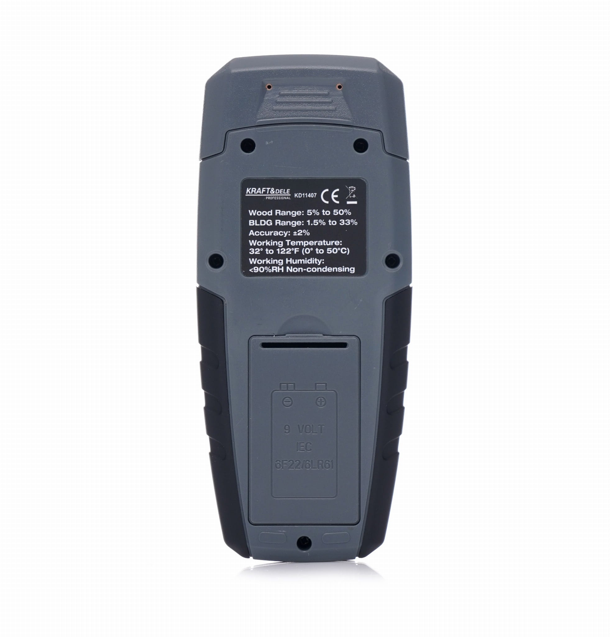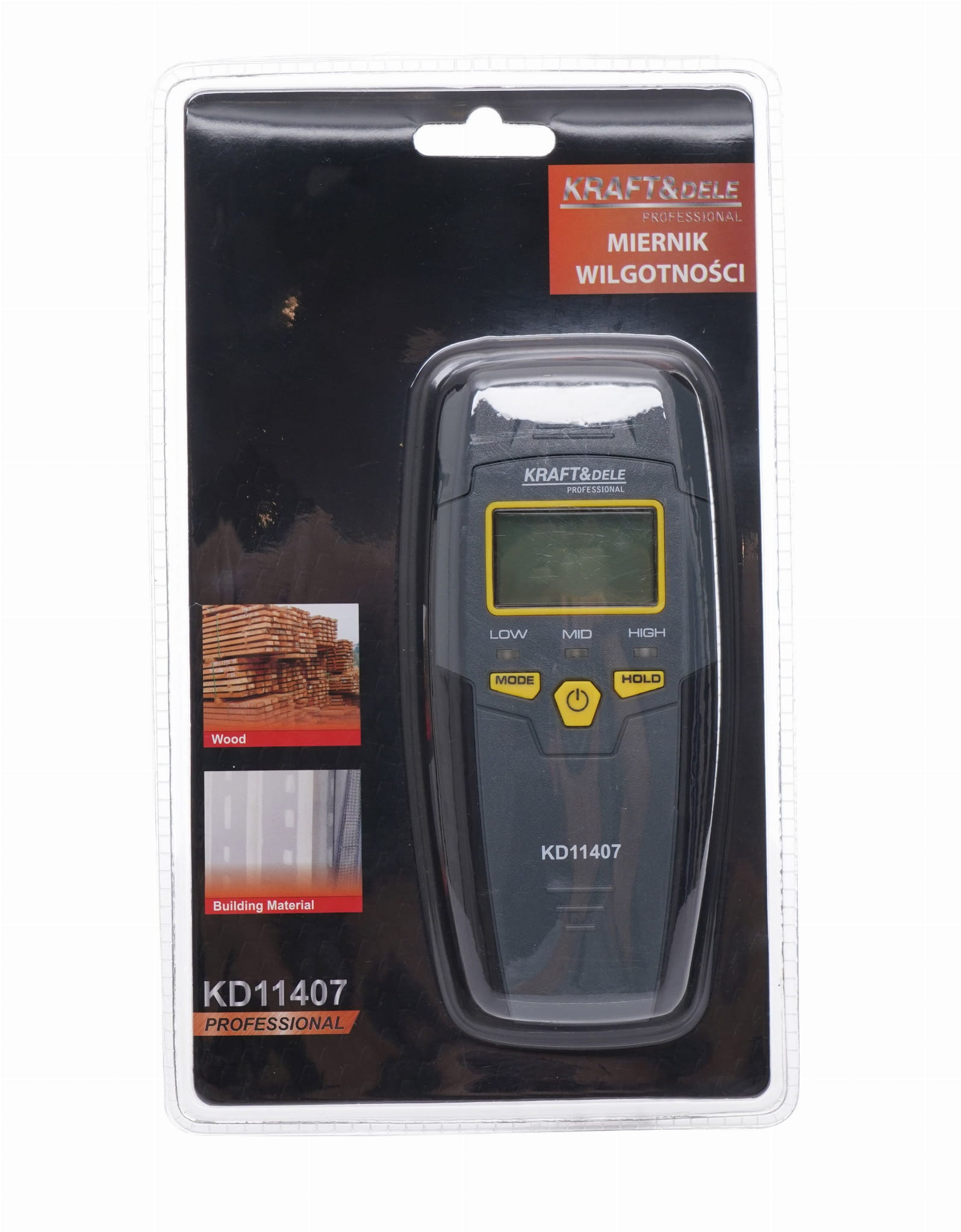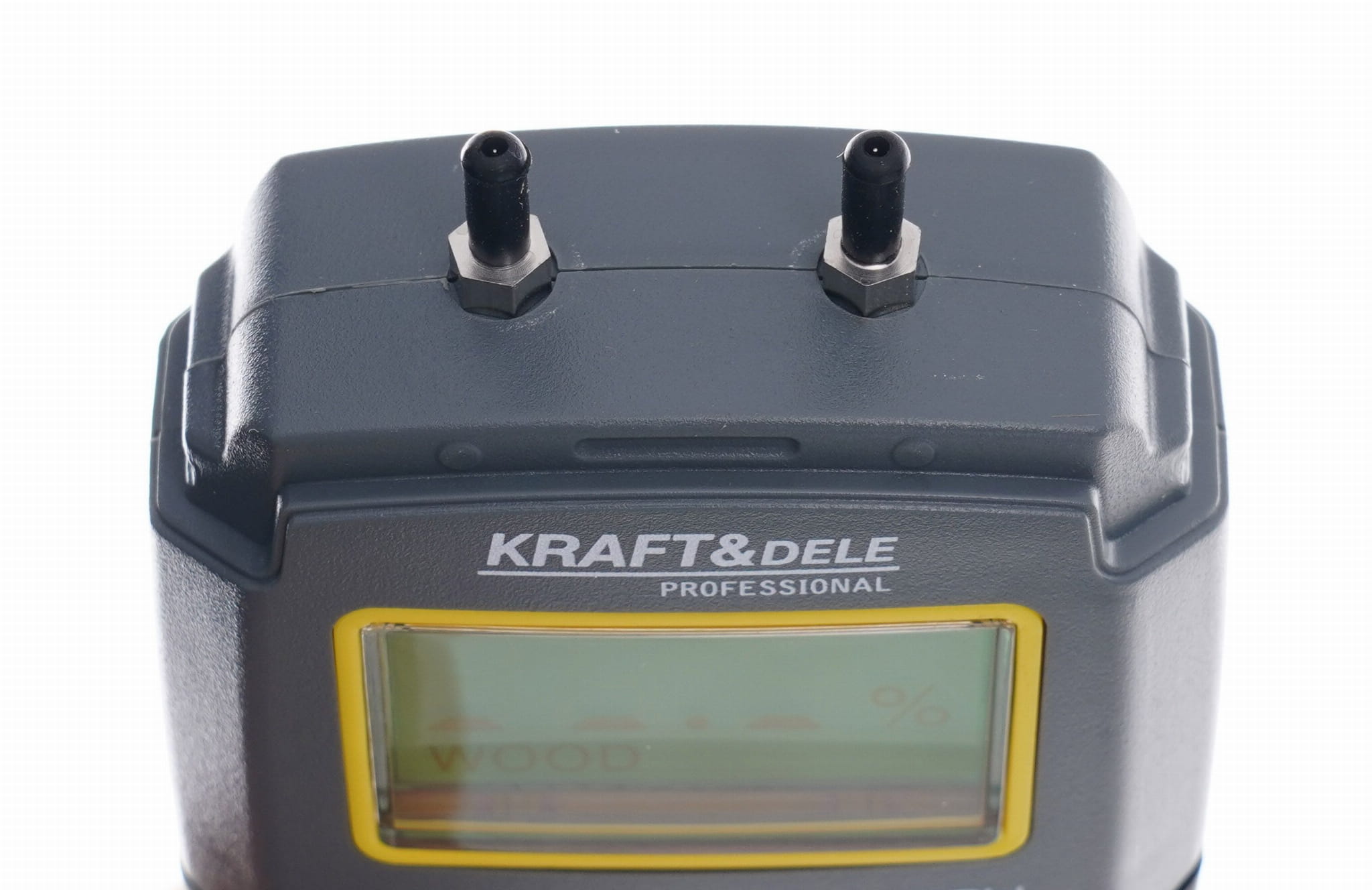 Urządzenie do pomiaru zawartości wilgoci w drewnie oraz materiałach budowlanych metodą rezystywną — z wykorzystaniem dwóch metalowych pinów wbijanych w badany materiał. Wynik odczytu wyświetlany jest na czytelnym ekranie LCD.