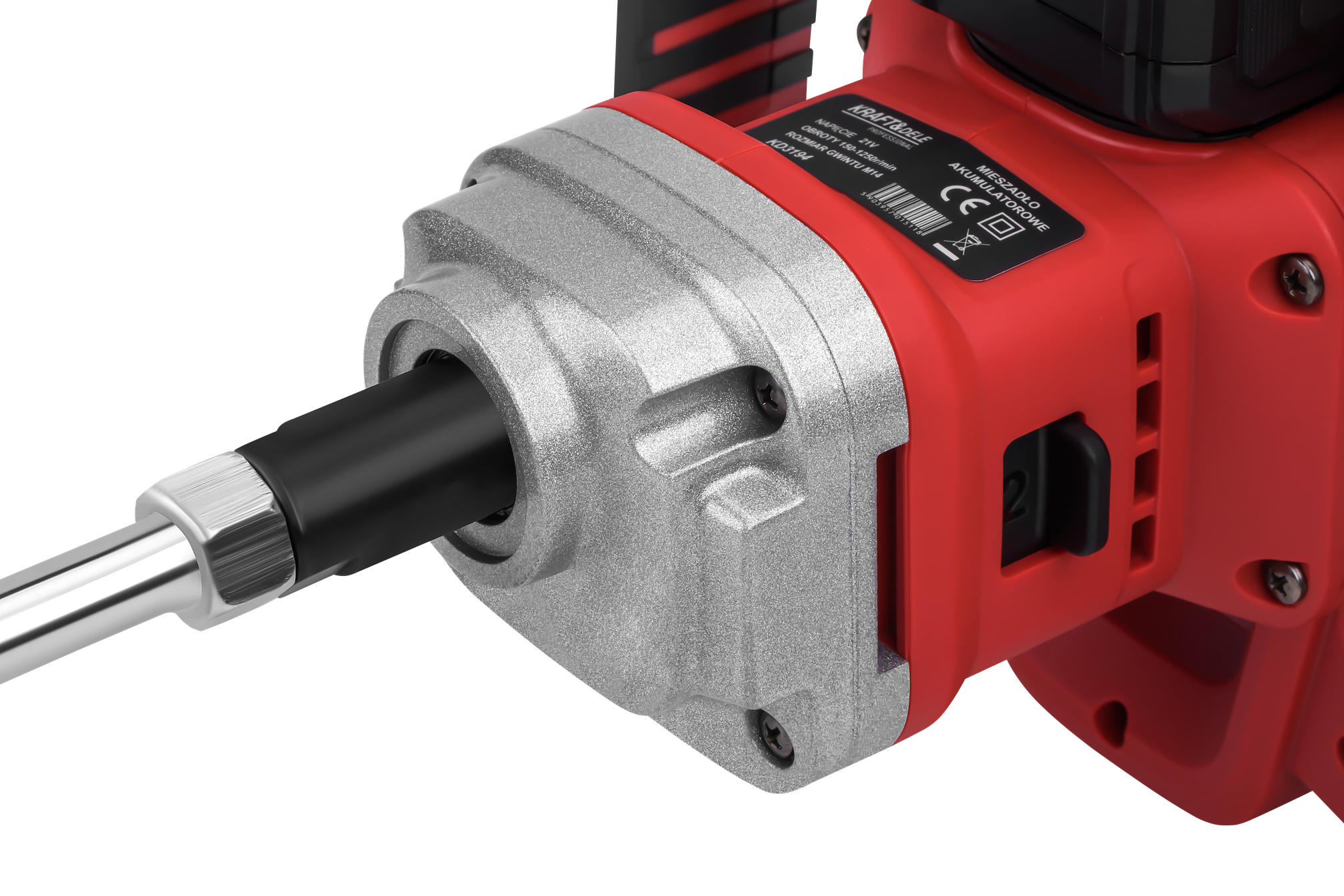 Mechanizm blokady zabezpiecza przed niezamierzonym włączeniem mieszadła — szczególnie istotne podczas transportu, zmiany akcesoriów lub odkładania narzędzia. Zwiększa bezpieczeństwo pracy, zwłaszcza w zatłoczonych przestrzeniach roboczych.