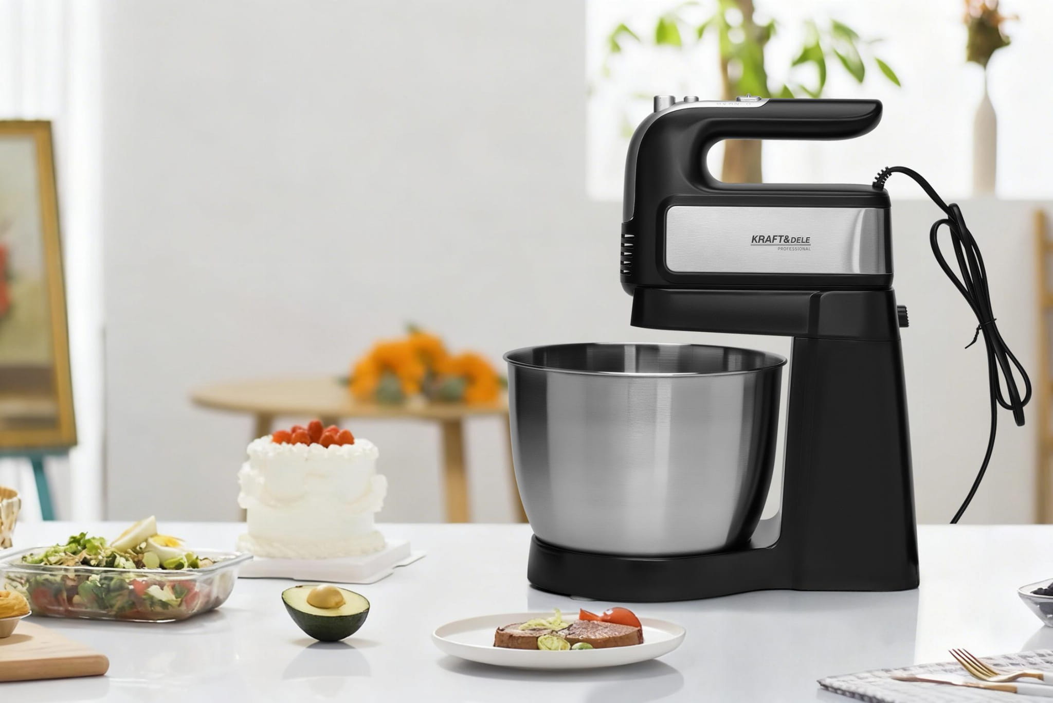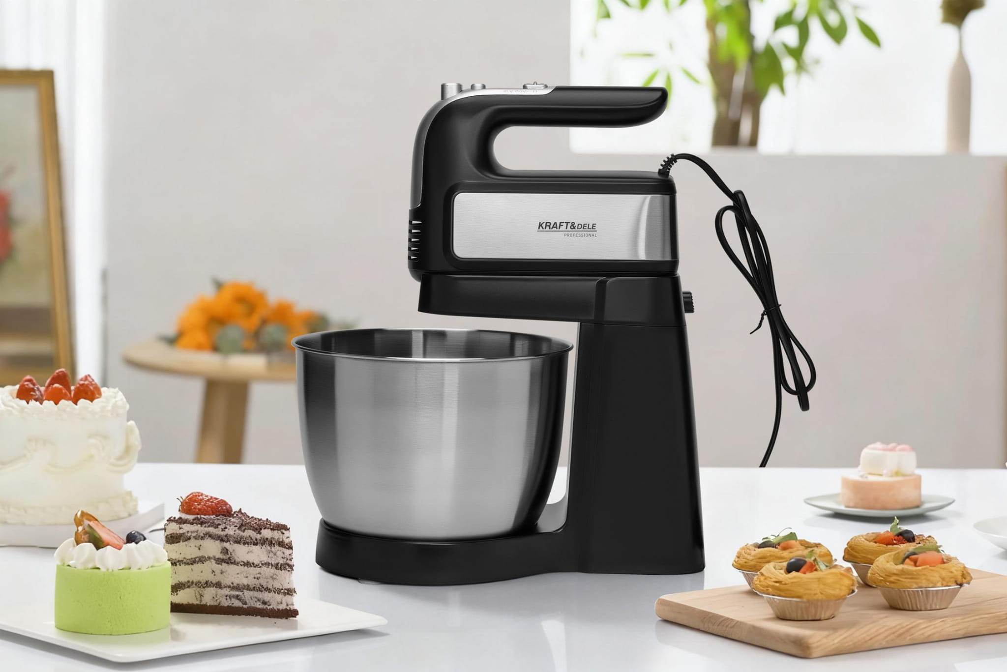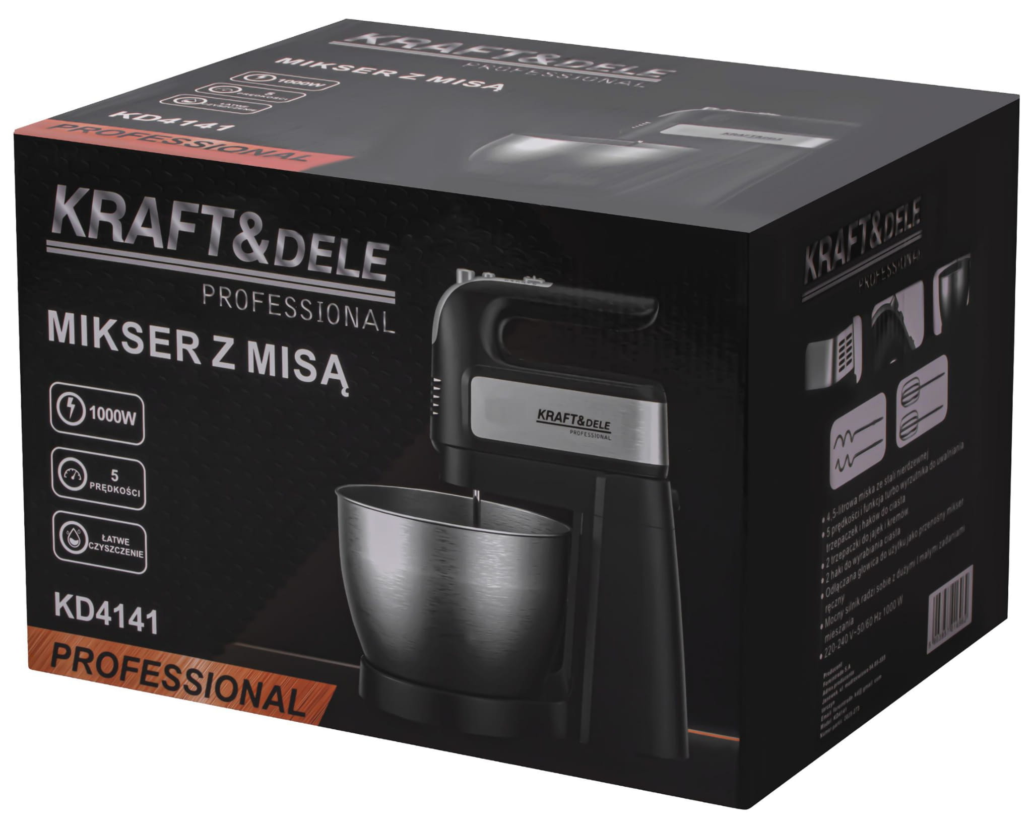 KD4141 to mikser planetarny z silnikiem 1000W, przeznaczony do wyrabiania ciast, ubijania kremów i przygotowywania mas o różnej konsystencji. Odłączana głowica pozwala na pracę w trybie miksera ręcznego, co zwiększa elastyczność urządzenia. W zestawie znajdują się cztery końcówki robocze oraz misa ze stali nierdzewnej o pojemności 4,5 litra.