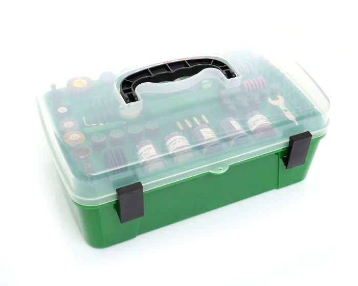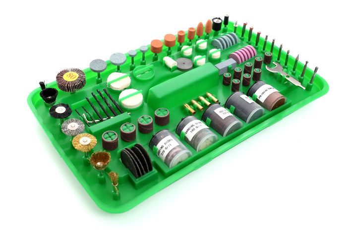 Zestaw 218 akcesoriów obejmuje komplet końcówek do różnych rodzajów obróbki: