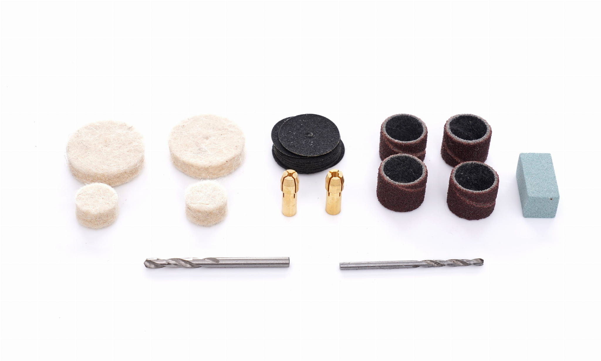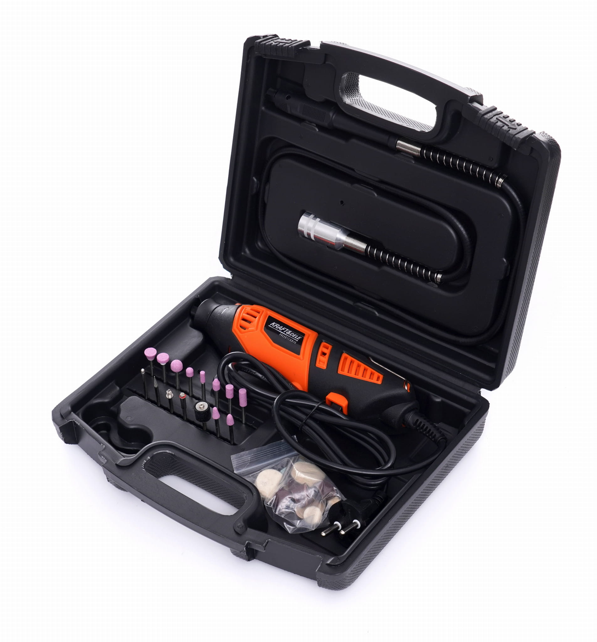 W zestawie znajdują się końcówki do różnych operacji — tarcze szlifierskie, ściernice, szczotki, frezy i inne. Dzięki temu urządzenie jest gotowe do użycia bez konieczności dokupowania podstawowych akcesoriów.