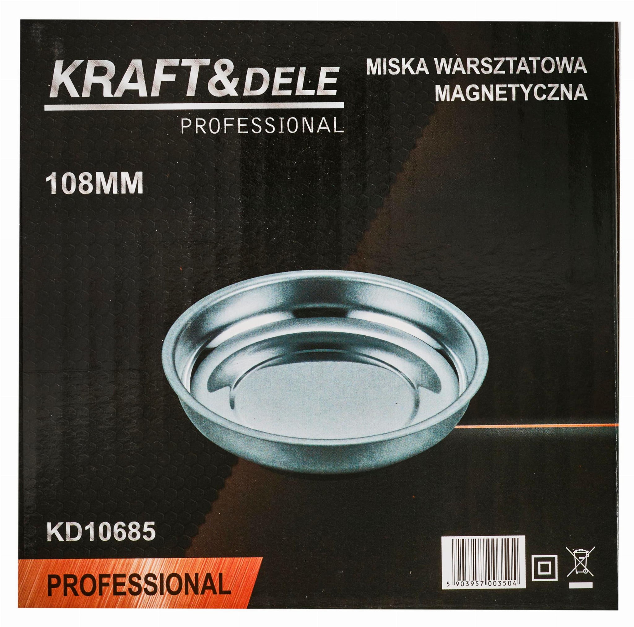 Miska warsztatowa KD10685 marki Kraft&Dele to stalowe naczynie z wbudowanym magnesem, przeznaczone do tymczasowego przechowywania drobnych elementów metalowych podczas prac mechanicznych i montażowych. Średnica 108 mm zapewnia wystarczającą powierzchnię roboczą, a magnes umożliwia mocowanie miski do pionowych i poziomych powierzchni stalowych.