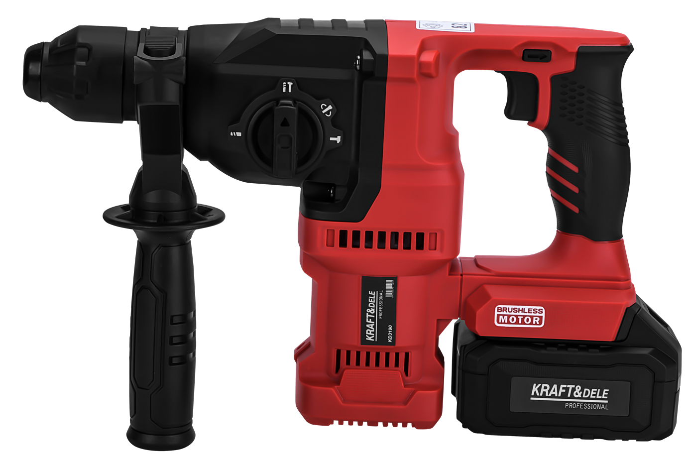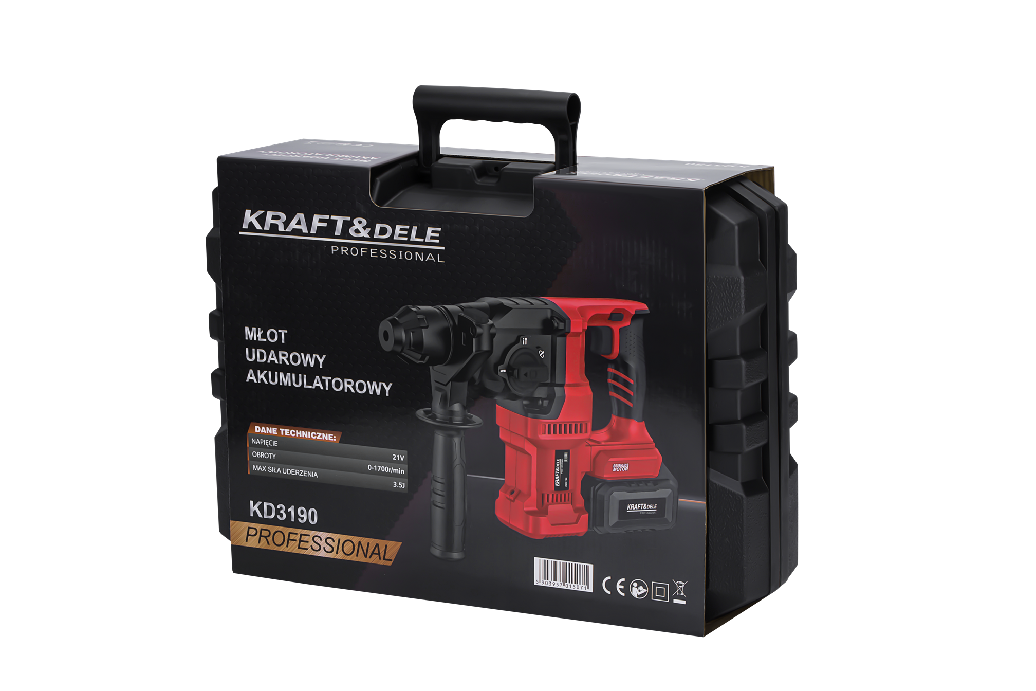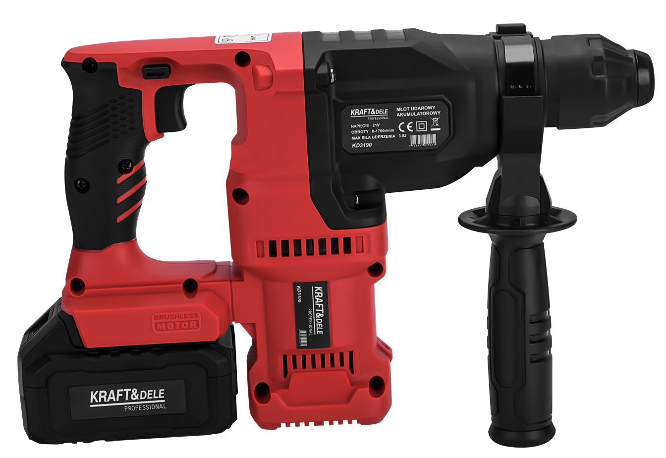 KD3190 to akumulatorowy młot udarowy z silnikiem bezszczotkowym, przeznaczony do wiercenia i kucia w betonie, cegle oraz kamieniu. Urządzenie pracuje na napięciu 21V i generuje energię udaru 3,5J, co pozwala na skuteczną pracę w twardych materiałach budowlanych. W zestawie znajdują się dwa akumulatory 4Ah oraz ładowarka.