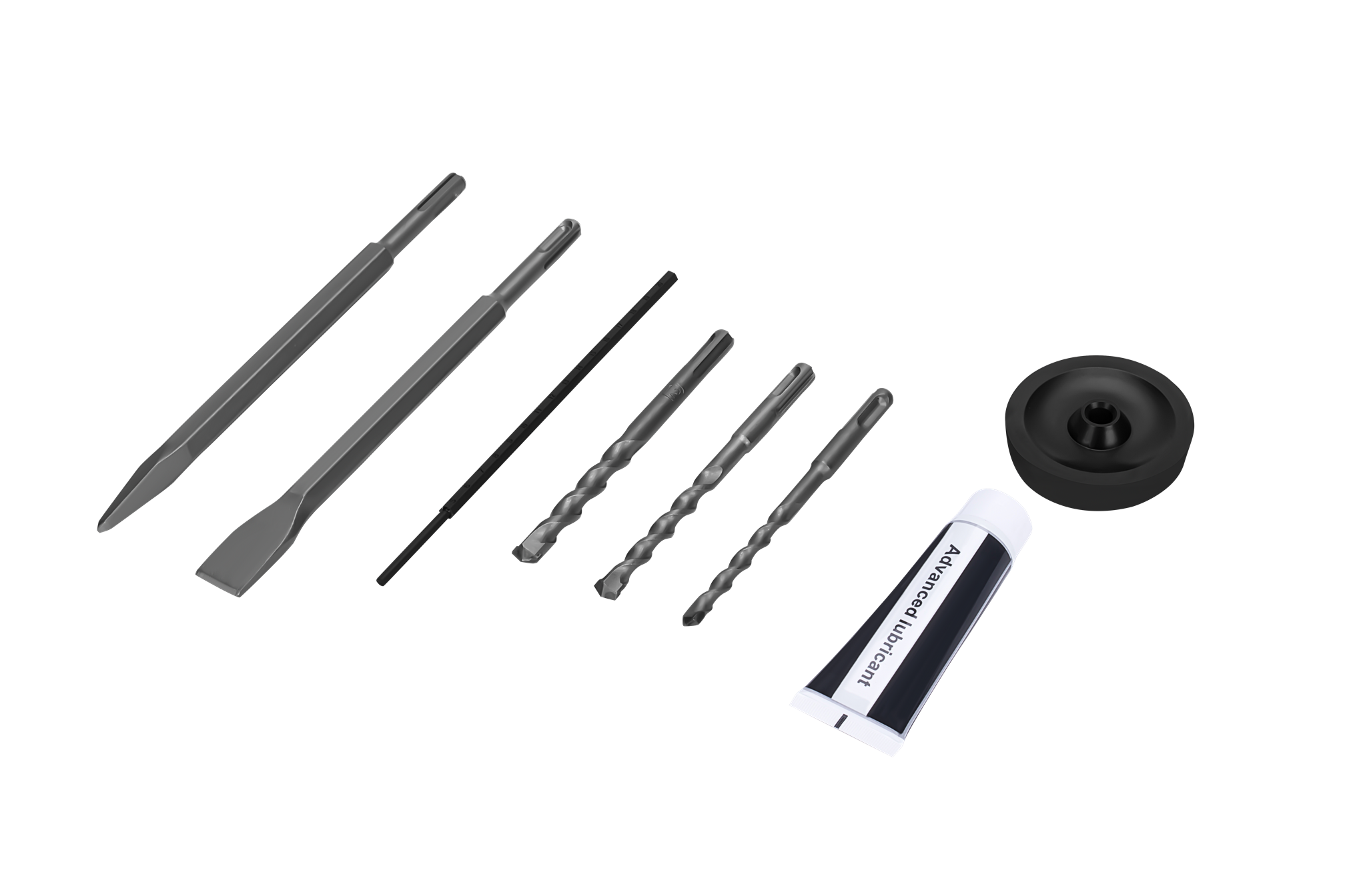 Standard SDS-Plus umożliwia mocowanie wierteł i dłut bez użycia klucza — wystarczy wsunąć końcówkę i obrócić. Osprzęt SDS-Plus jest powszechnie dostępny i obejmuje wiertła do betonu, dłuta płaskie, punktaki oraz wiertła koronowe do betonu.